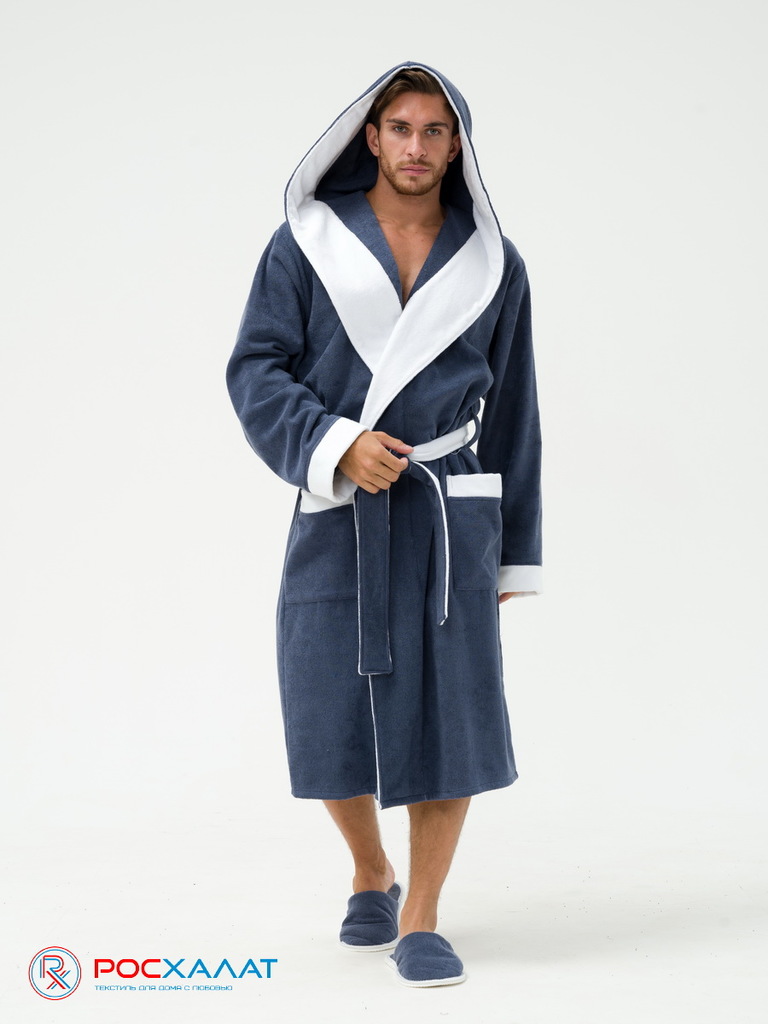 Мужской махровый халат с капюшоном с белой отделкой темно-синий+белый МЗ-05-1 (88)