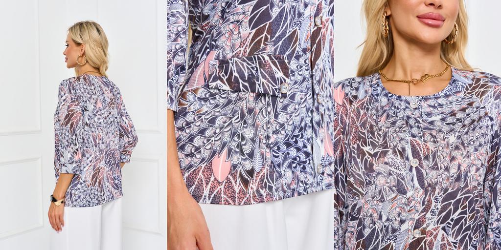 Подробное описание: https://bellovera.ru/catalog/product/bluzka_avaliya_musson/ Авалия – лаконичная блуза свободного силуэта из блузочной ткани с принтом. Округлый вырез, рукава 3/4 свободные на резинке. По низу блузы так же резинка. Свободный крой позволяет носить блузку под брюки, под джины, под юбку, носить заправленной или навыпуск. Блуза отлично сочетается с однотонными пиджаками и жакетами. Благодаря универсальному крою блуза с ярким оригинальным принтом создает привлекательный женственный образ для торжественного случая или повседневности. Комфортная посадка дарит уверенность и ощущение свободы. Меняйся и привлекай внимание окружающих вместе с “Белловера”! Рост модели – 165 см. Длина изделия: 46 размер – 64 см, 48 размер – 66 см, 50 размер – 66 см, 52 размер – 67 см, 54 размер – 67 см, 56 размер – 67 см.