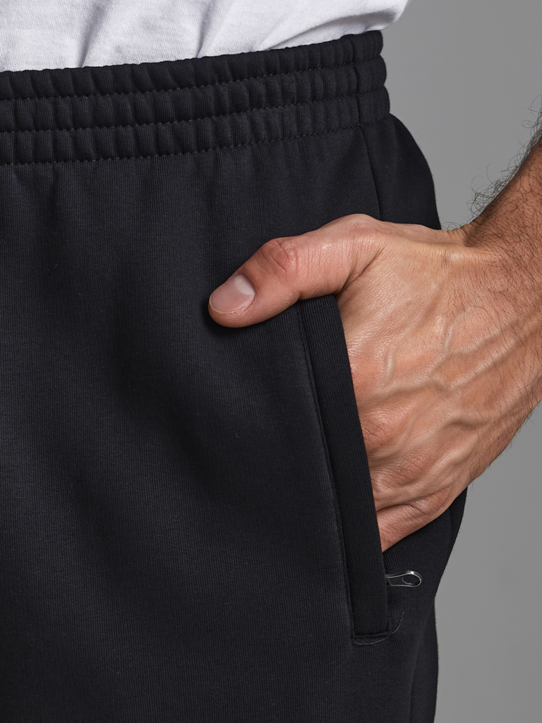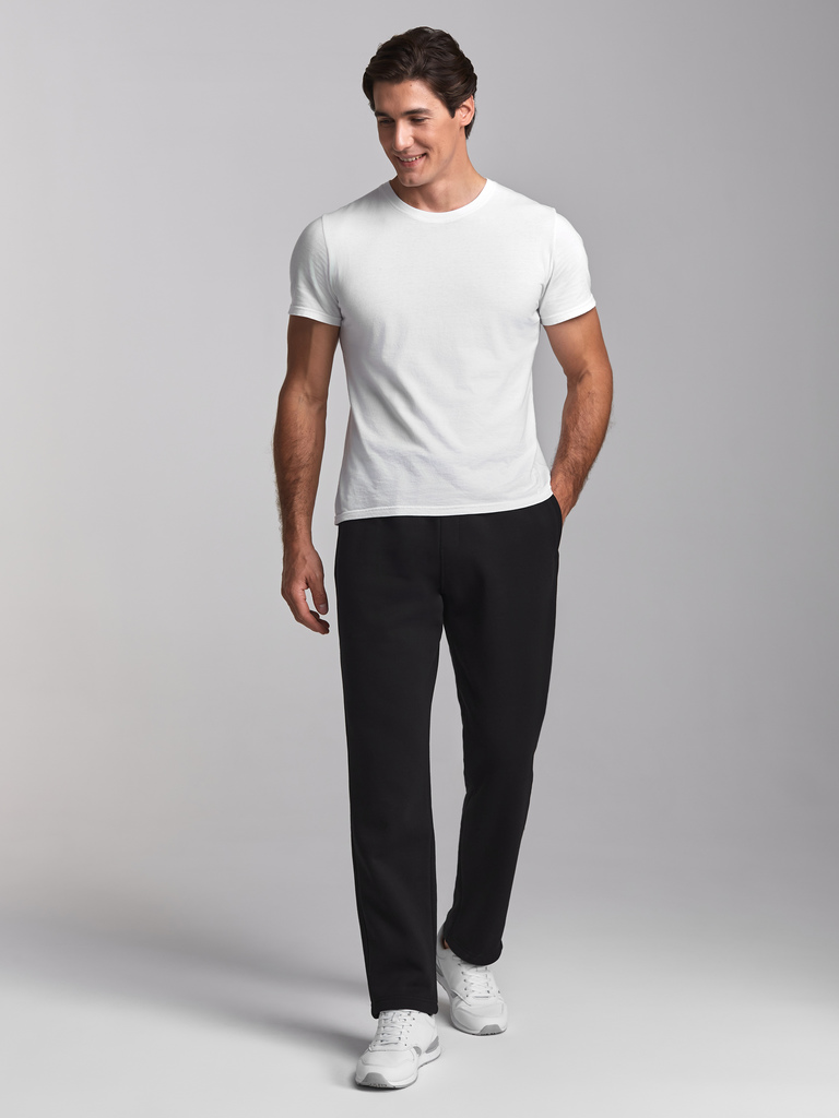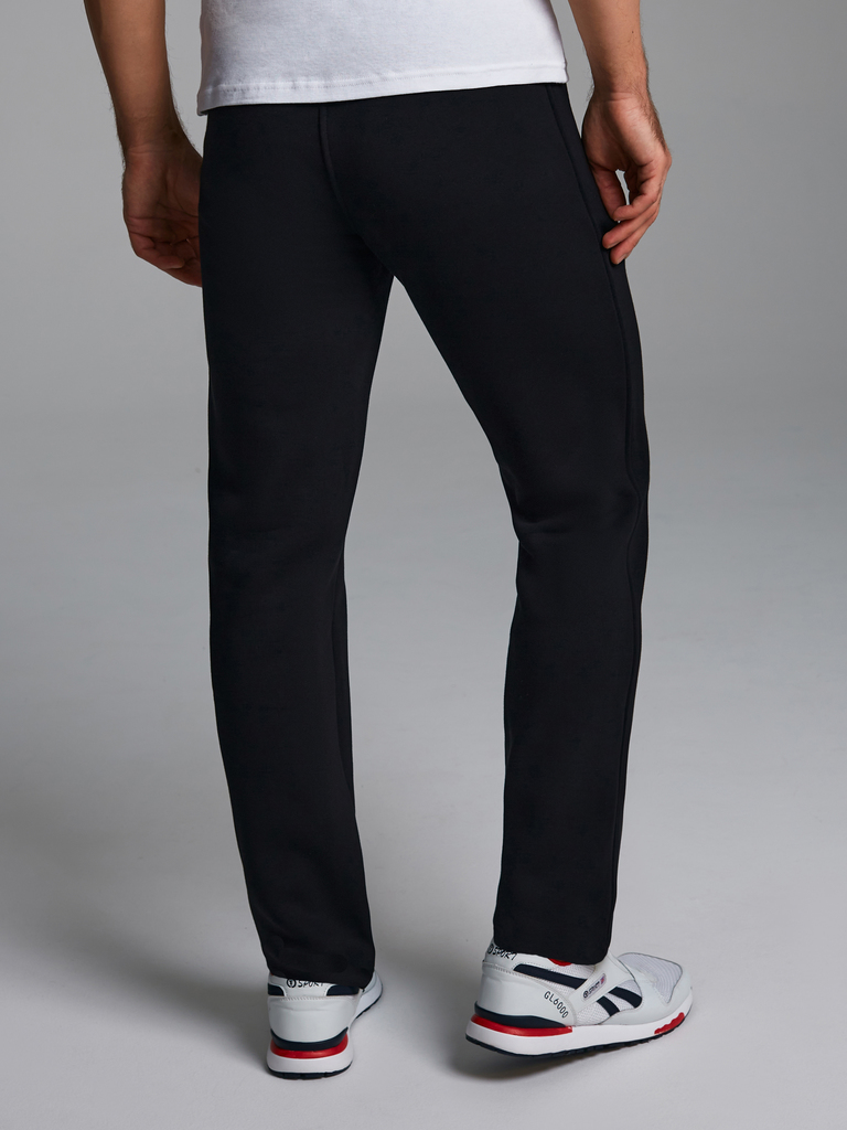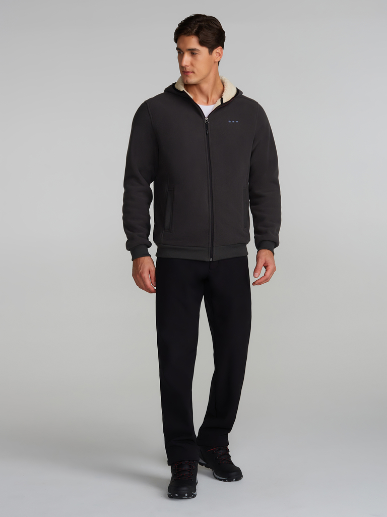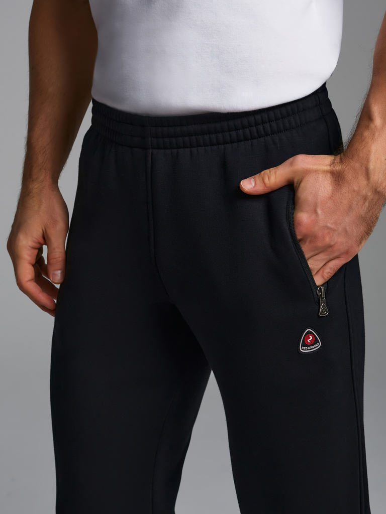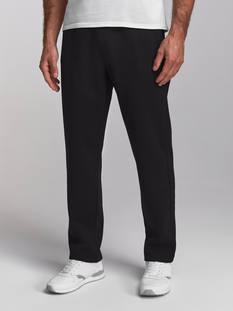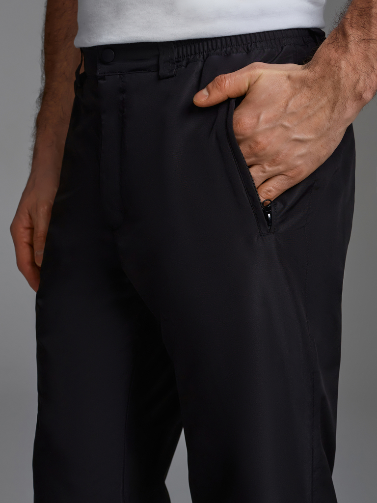 Брюки мужские из плотного и мягкого хлопкового трикотажного полотна с изнаночным начесом. Брюки зауженного силуэта с прорезными карманами, с открытой молнией.