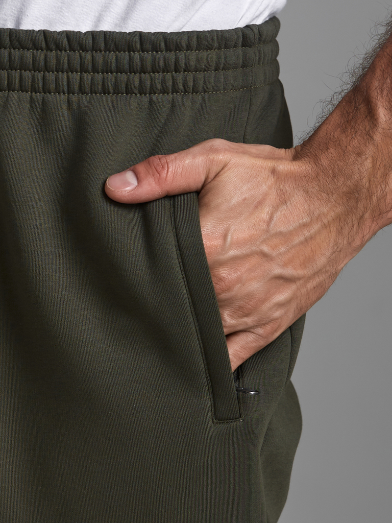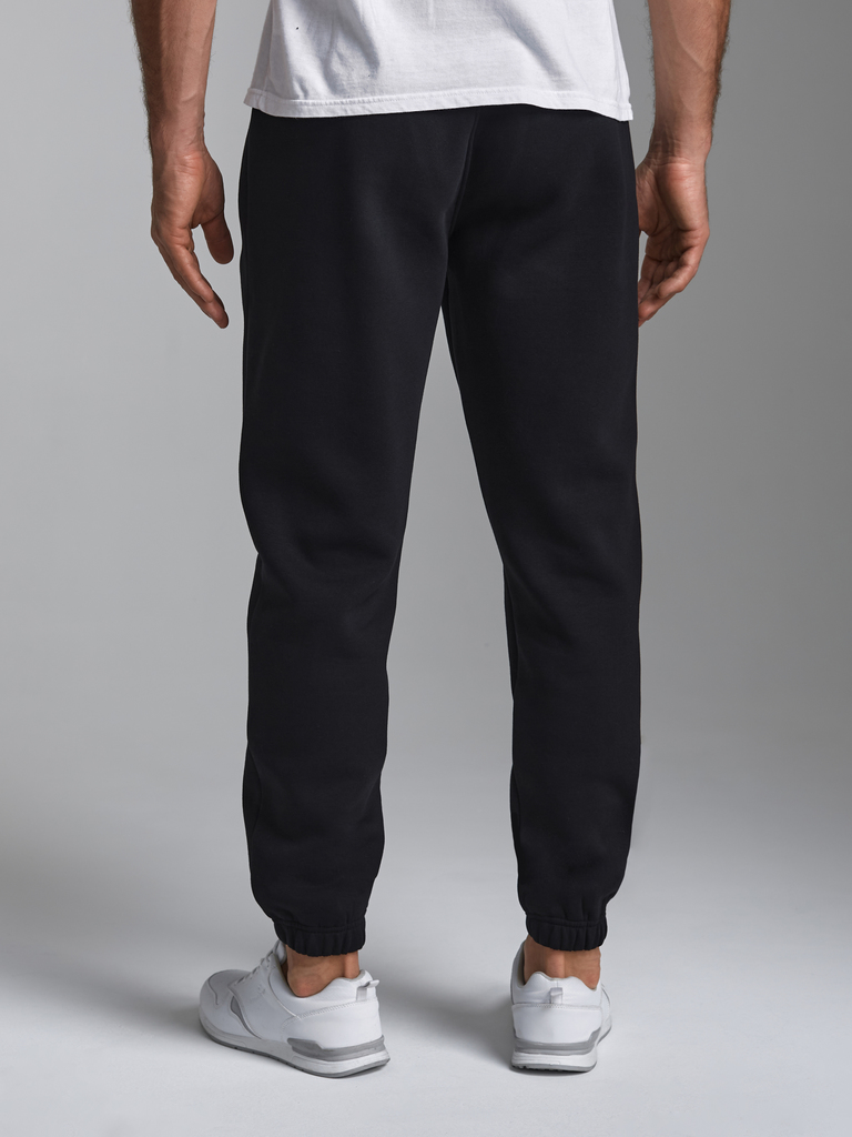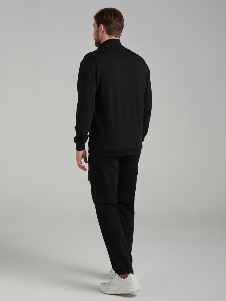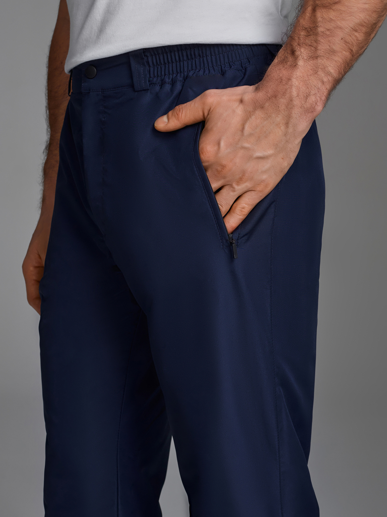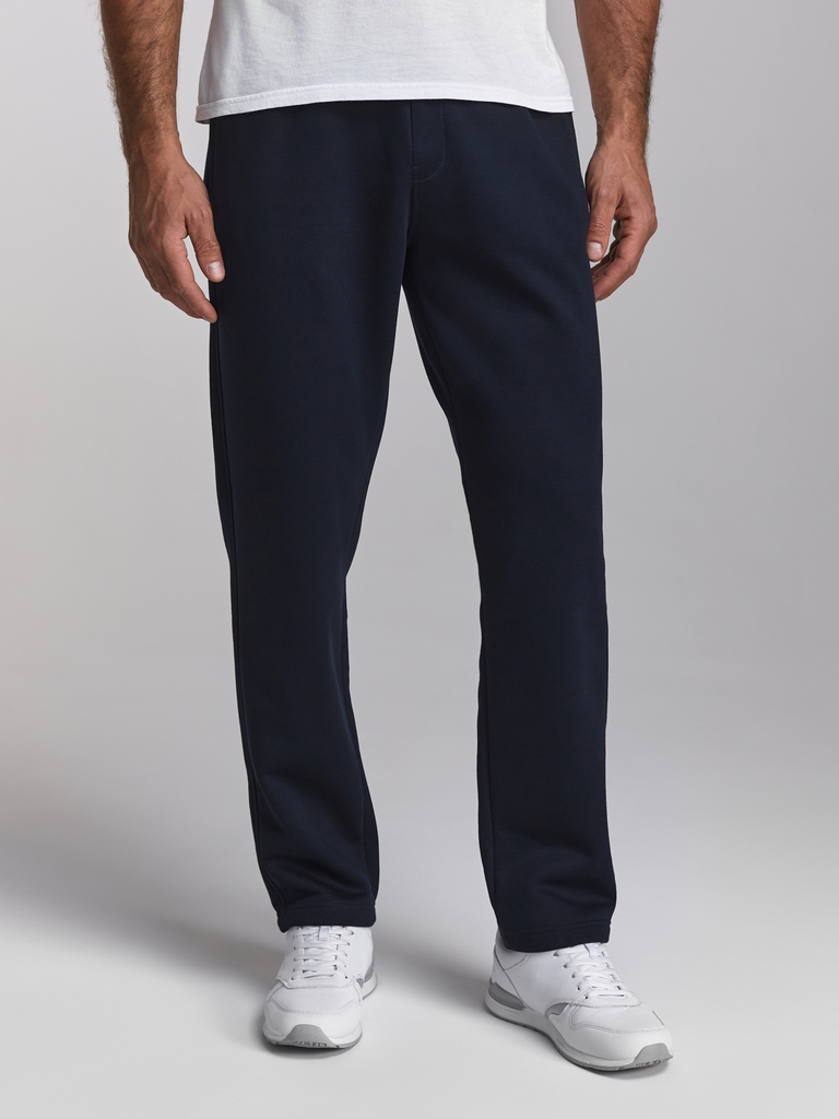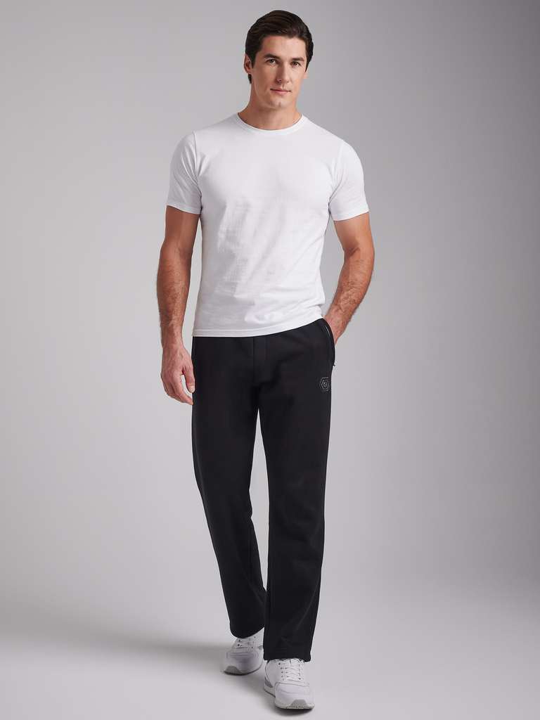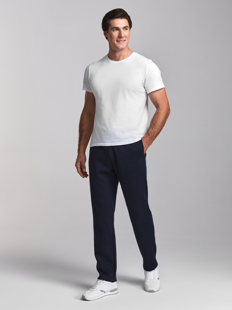 Брюки мужские из плотного и мягкого хлопкового трикотажного полотна с изнаночным начесом. Брюки зауженного силуэта с прорезными карманами, с открытой молнией.