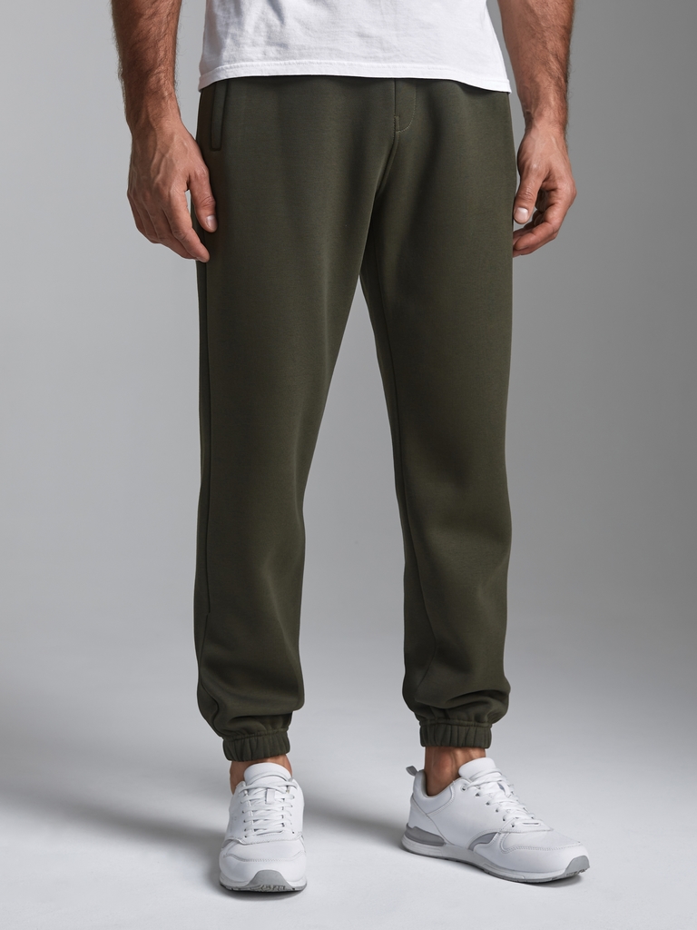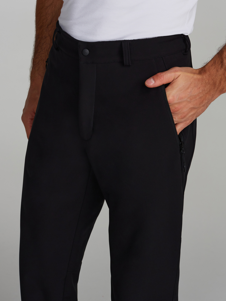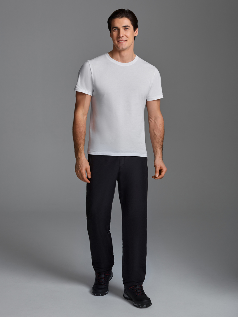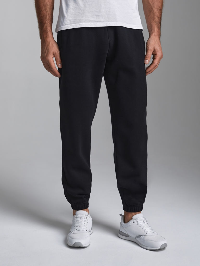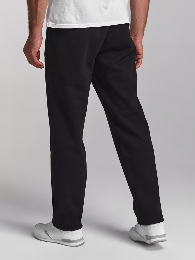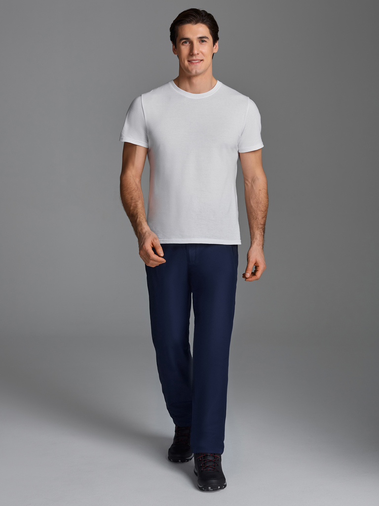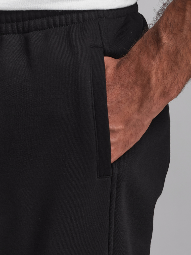 Брюки мужские из плотного и мягкого хлопкового трикотажного полотна с изнаночным начесом. Брюки зауженного силуэта с прорезными карманами, с открытой молнией.