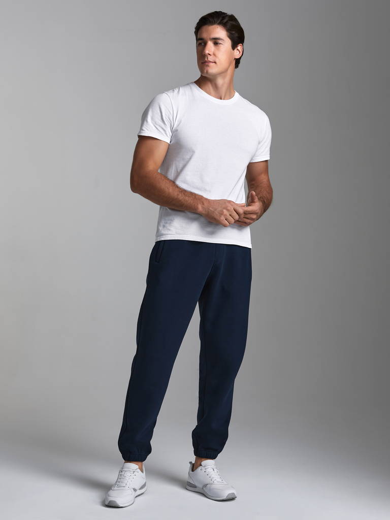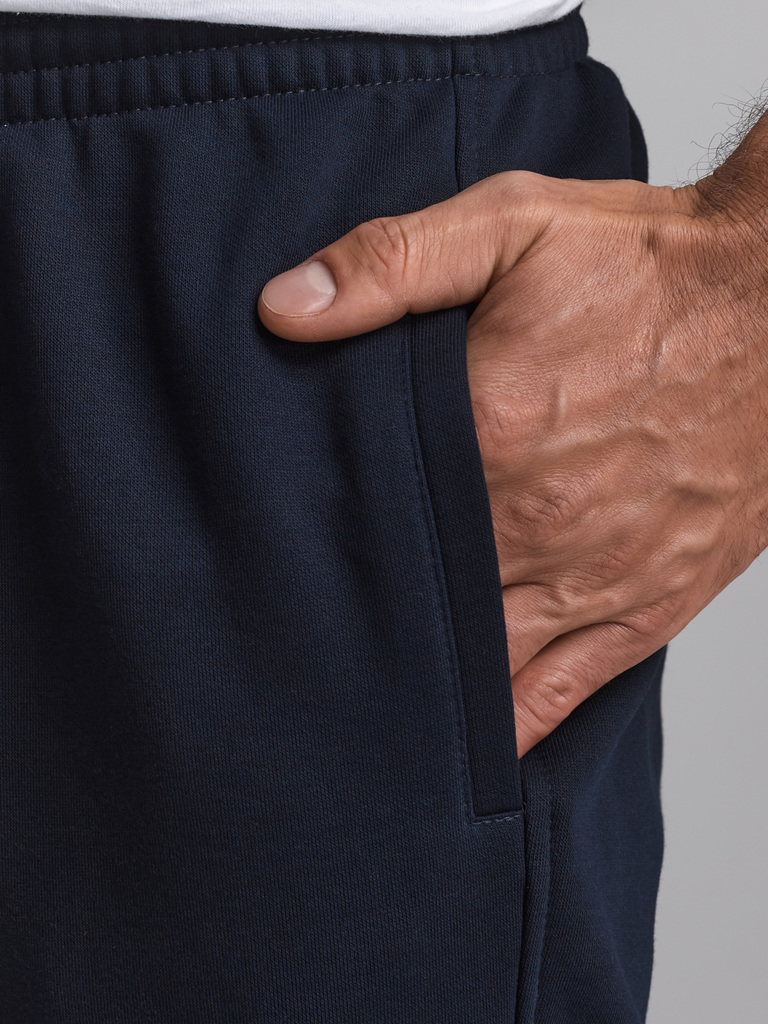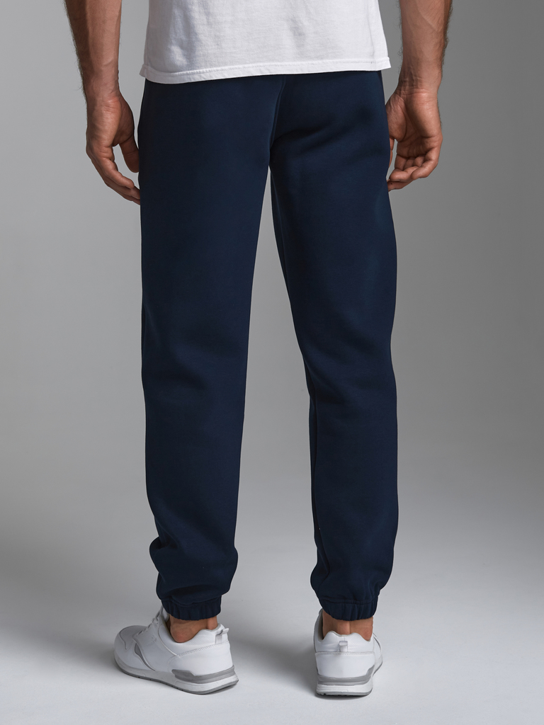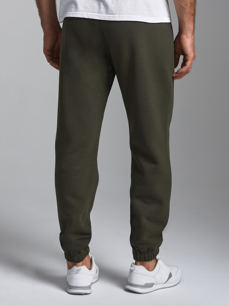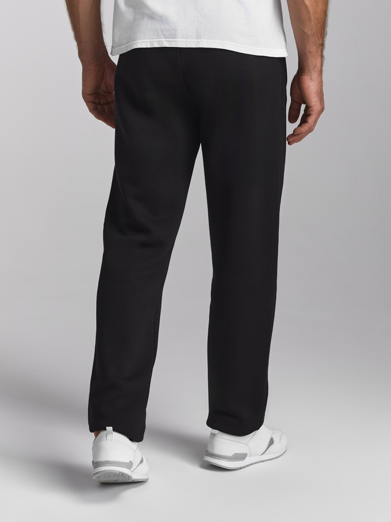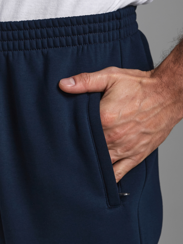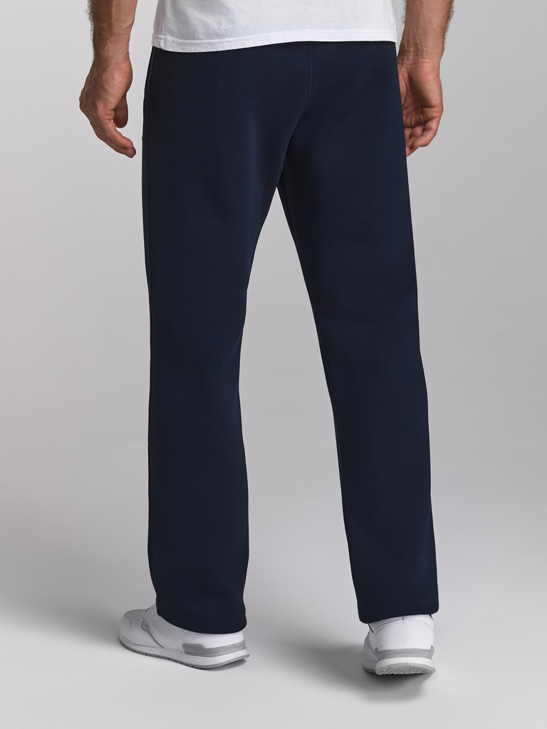 Брюки мужские из плотного и мягкого хлопкового трикотажного полотна с изнаночным начесом. Брюки зауженного силуэта с прорезными карманами, с открытой молнией.