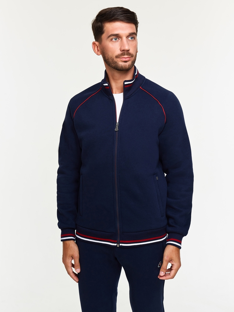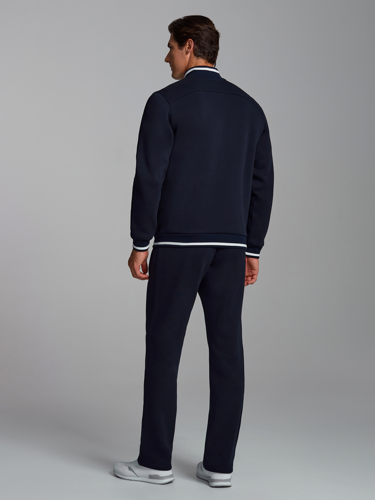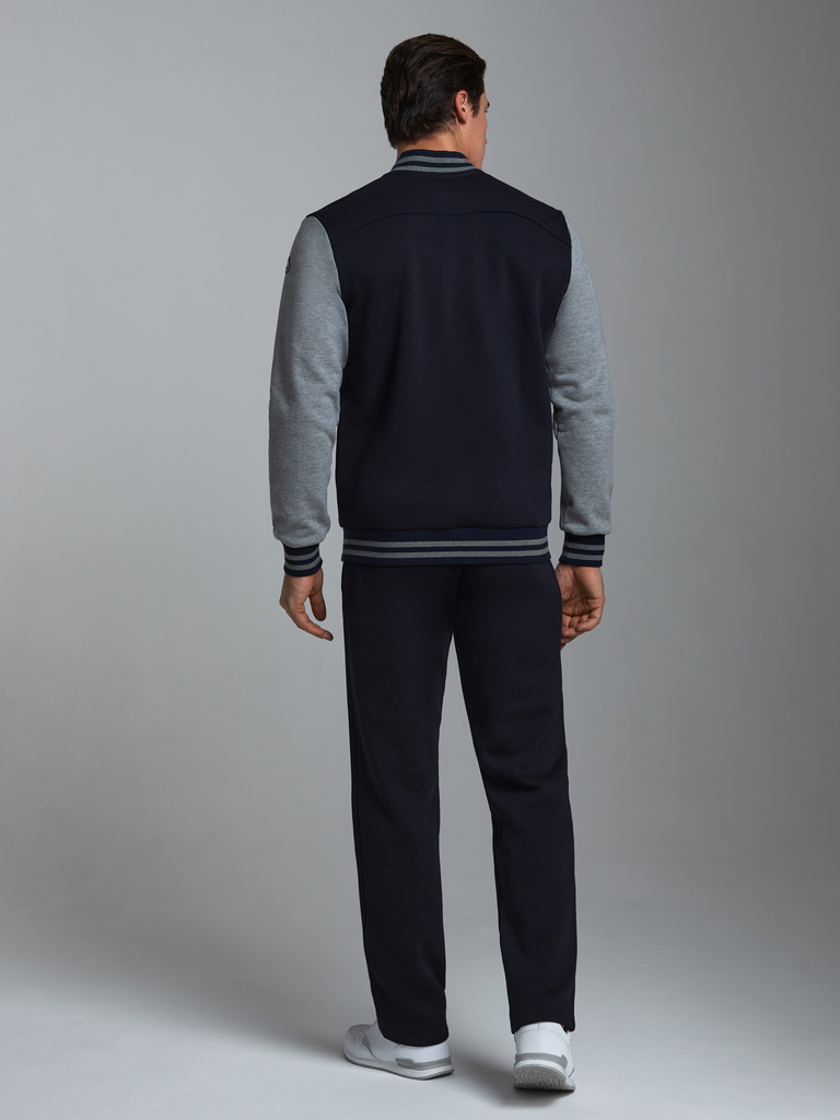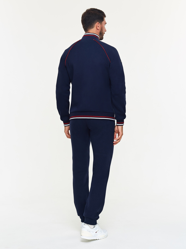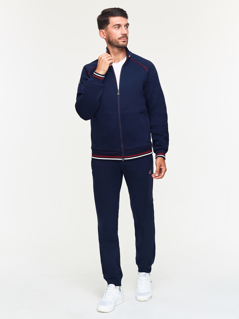 Спортивный костюм из плотного хлопкового трикотажного полотна с изнаночным начесом. Куртка на поясе с воротником, застегивается на молнию. Рукава втачные. Читать далее Куртка скомбинирована из двух ви... Показать описаниедов полотна, с контрастными рукавами. Яркость изделия подчеркивает клубная вышивка на груди и использование полосатого полотна для пояса, воротника и манжет куртки. Карманы куртки и брюк прорезные, с молниями . Брюки по низу заужены манжетами.Брюки прямого силуэта.Пояс брюк эластичный, по линии талии дополнительно регулируется шнурком.