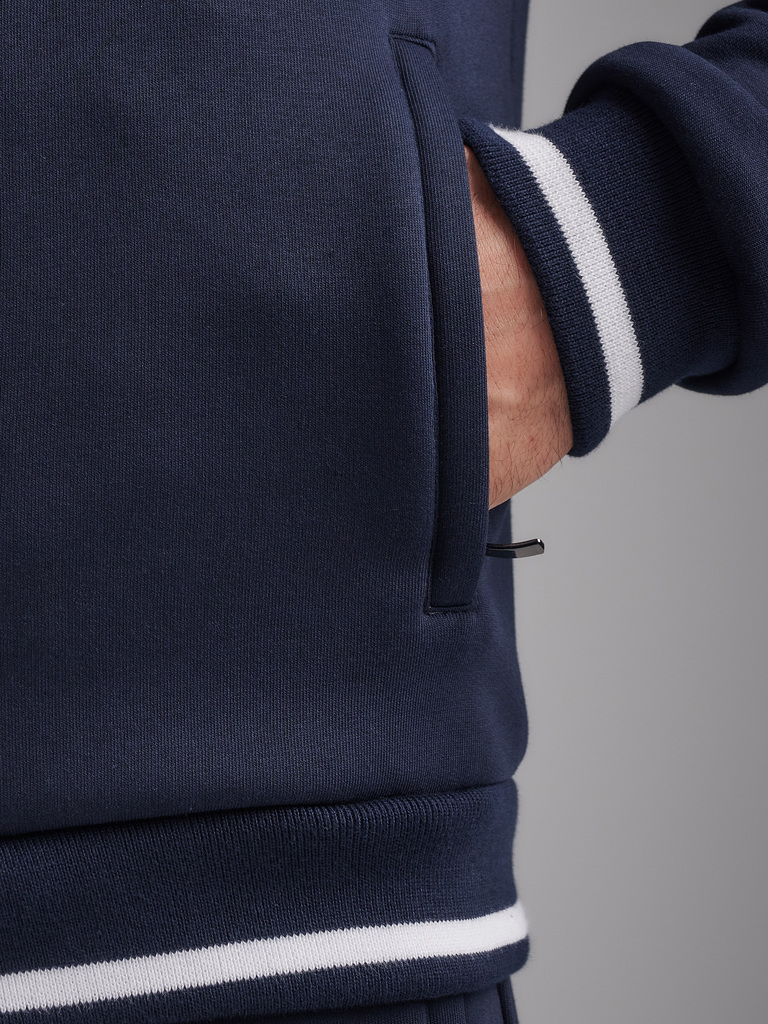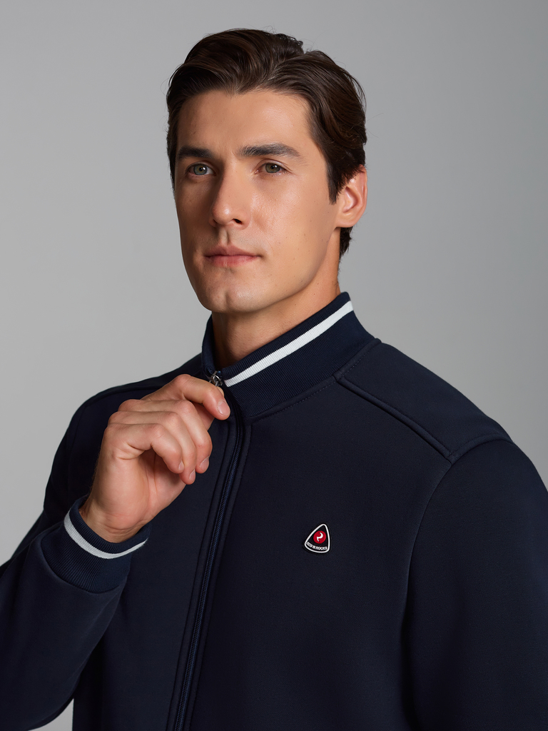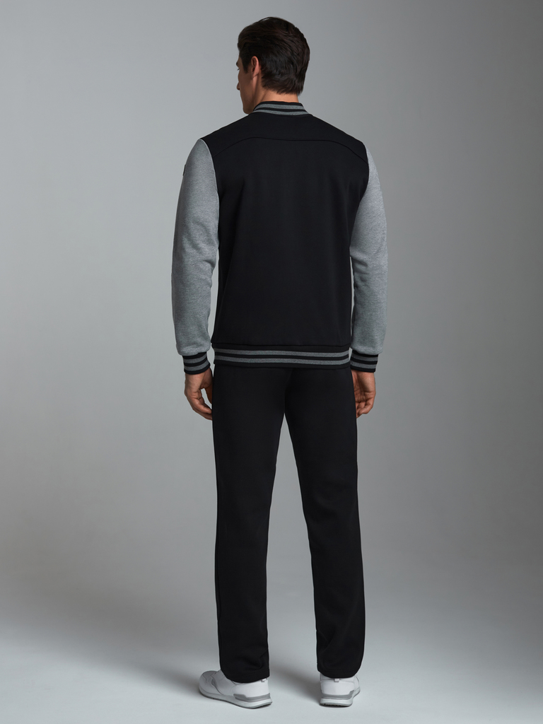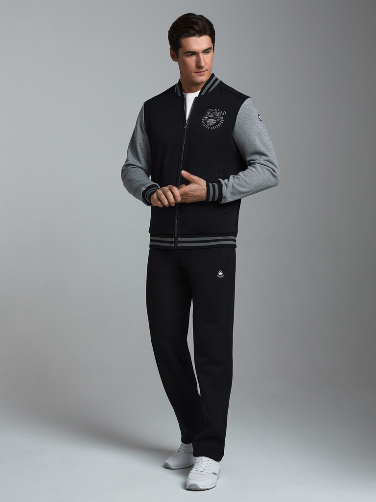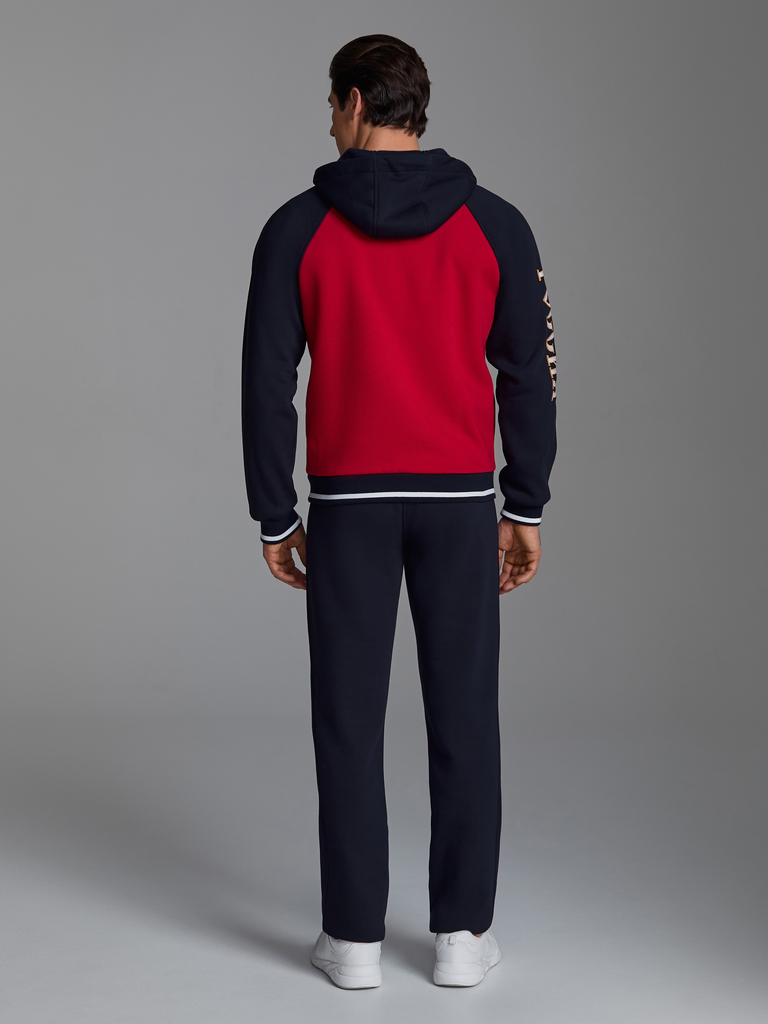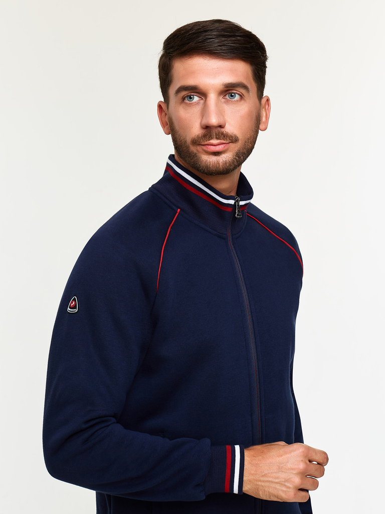 Спортивный костюм из плотного хлопкового трикотажного полотна с изнаночным начесом. Куртка на поясе с воротником, застегивается на молнию. Рукава втачные. Читать далее Куртка скомбинирована из двух ви... Показать описаниедов полотна, с контрастными рукавами. Яркость изделия подчеркивает клубная вышивка на груди и использование полосатого полотна для пояса, воротника и манжет куртки. Карманы куртки и брюк прорезные, с молниями . Брюки по низу заужены манжетами.Брюки прямого силуэта.Пояс брюк эластичный, по линии талии дополнительно регулируется шнурком.