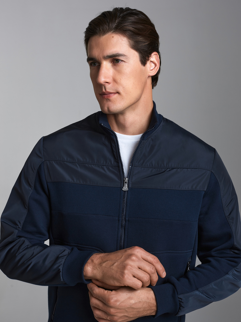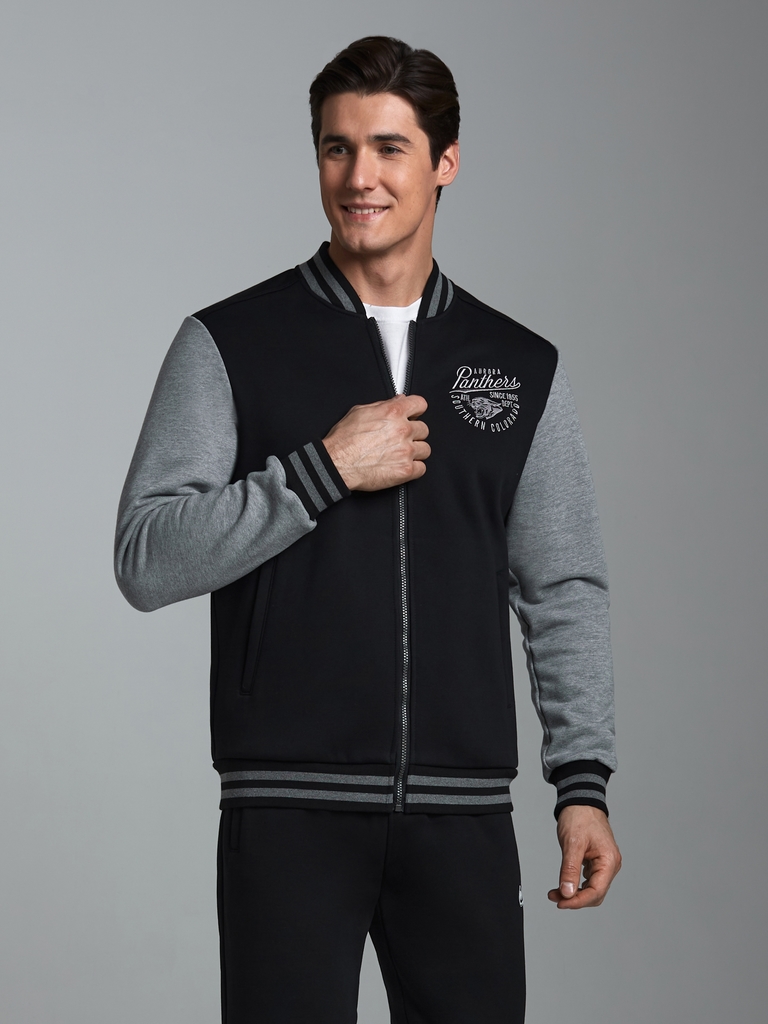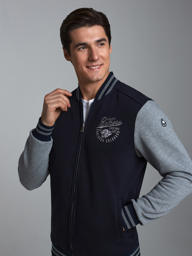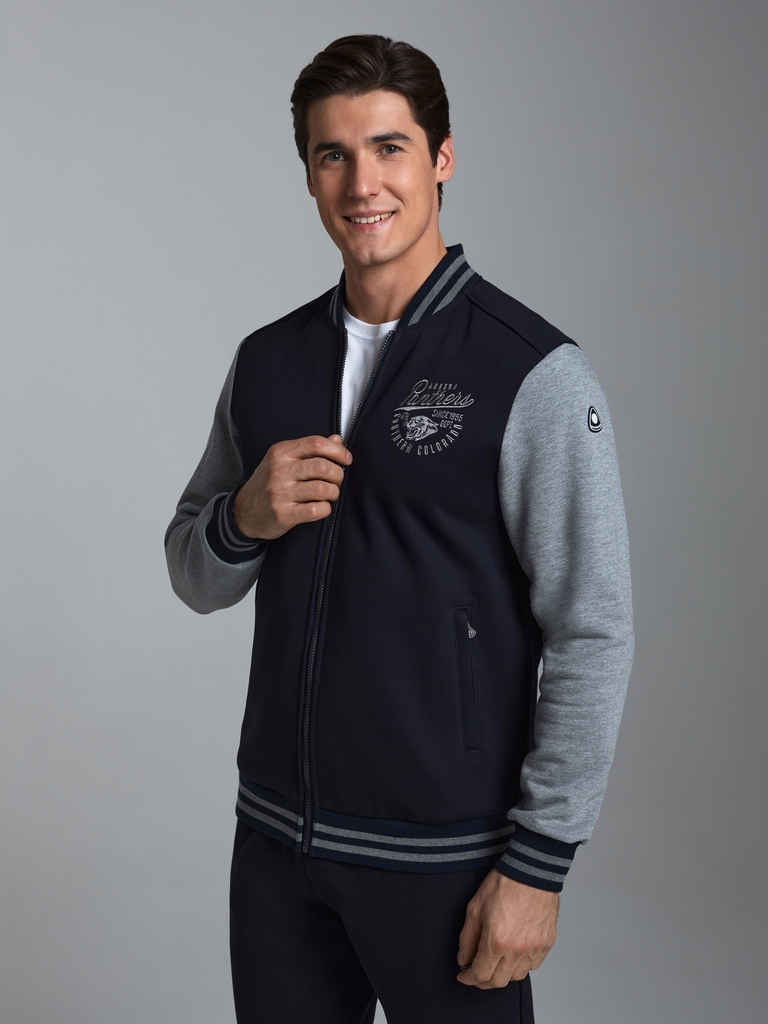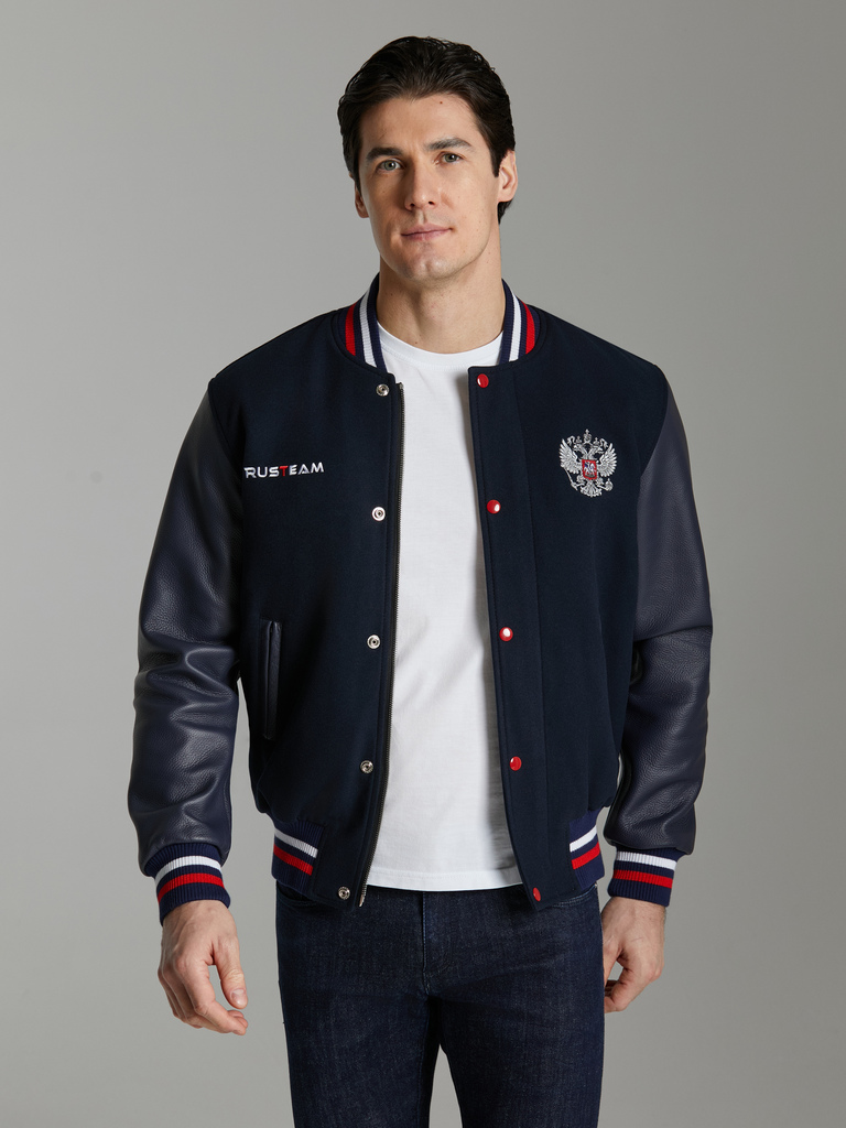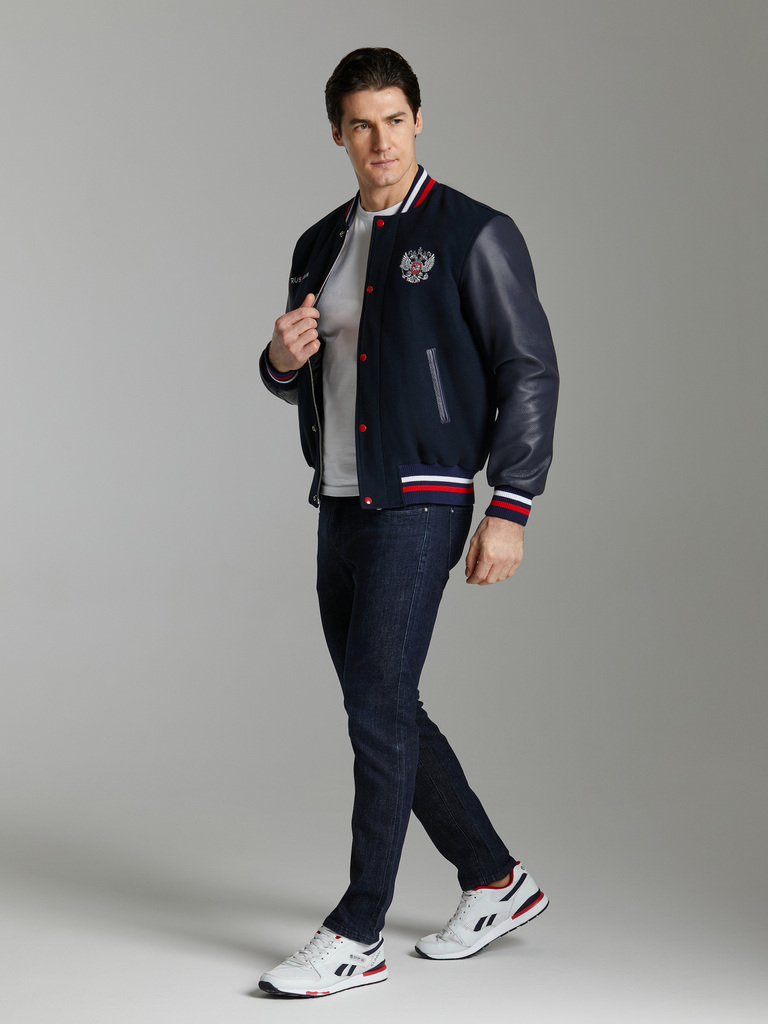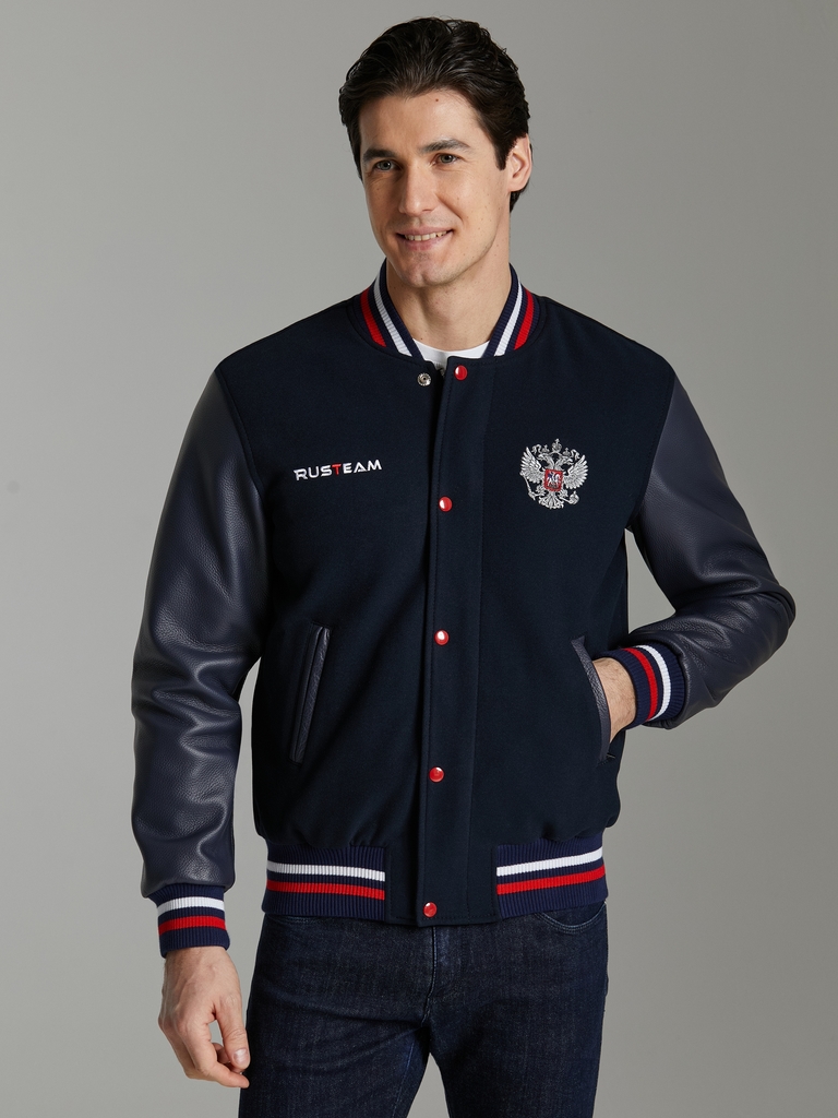 Куртка мужская с кожаными рукавами, артикул X1449807 синего цвета демисезонныи? бомбер RUSTEAM: стиль, комфорт и патриотизм в каждои? детали!* Ищете куртку, которая подчеркнет ваш стиль и защитит от н... Показать описаниеепогоды? Мужскои? бомбер RUSTEAM — это идеальныи? выбор для тех, кто ценит качество, функциональность и уникальныи? дизаи?н. Эта модель сочетает в себе современные технологии и классическии? спортивныи? стиль, делая ее? незаменимои? в вашем гардеробе. *Почему выбирают RUSTEAM?* - *Премиальные материалы:* Куртка изготовлена из высокоплотного смесового полотна (полиэстер и вискоза), которое обеспечивает надежную защиту от ветра и холода. Читать далее Рукава из натуральнои? кожи добавляют модели элегантности и долговечности. - *Удобство и практичность:* Комбинированная застежка с металлическои? молниеи? и кольцевыми кнопками обеспечивает надежную фиксацию. Стеганая подкладка на синтепоне сохраняет тепло, не утяжеляя куртку. - *Функциональные детали:* Внешние карманы украшены кожаными листочками и подзорами, а внутри вы наи?дете два удобных кармана — один на молнии для документов, второи? на кнопке для гаджетов или аксессуаров. - *Патриотичныи? дизаи?н:* Вышивка с гербом России на груди и объемная надпись "РОССИЯ" на спине подчеркивают ваш патриотизм и добавляют куртке уникальности. *Идеально для:* - Повседневнои? носки в городе. - Активного отдыха на природе. - Создания стильного образа в прохладную погоду. *RUSTEAM — это не просто куртка, это ваш стиль и уверенность в каждом шаге!* Не упустите возможность стать обладателем этого уникального бомбера. Закажите RUSTEAM прямо сеи?час и ощутите превосходное качество и комфорт!