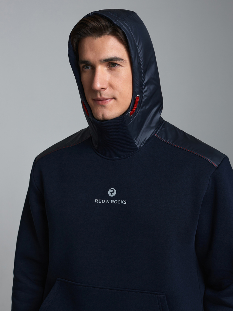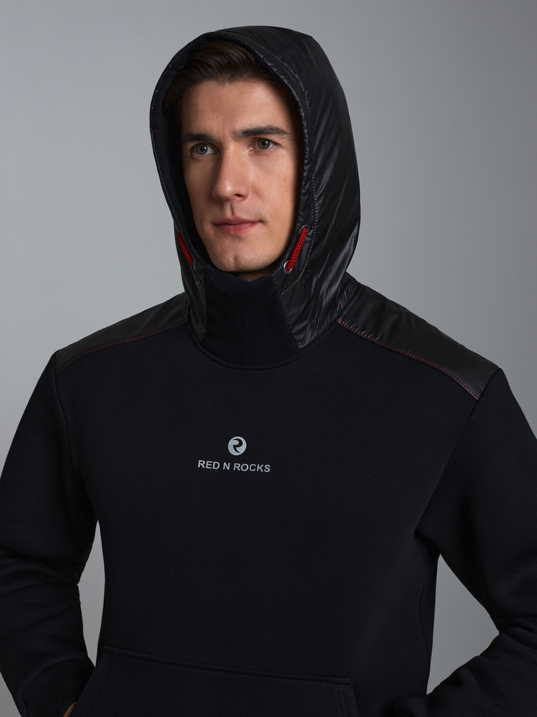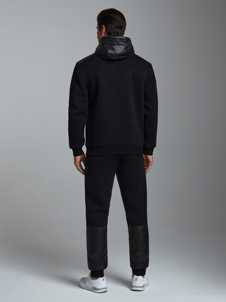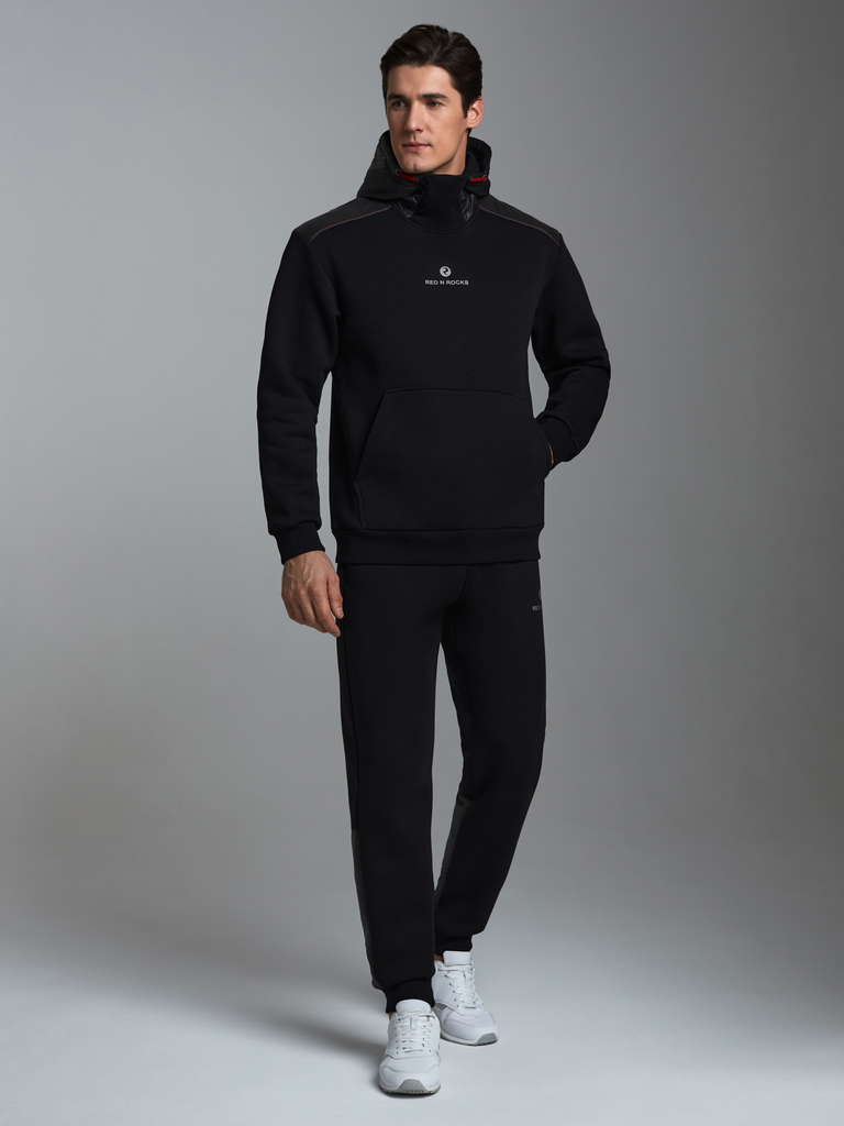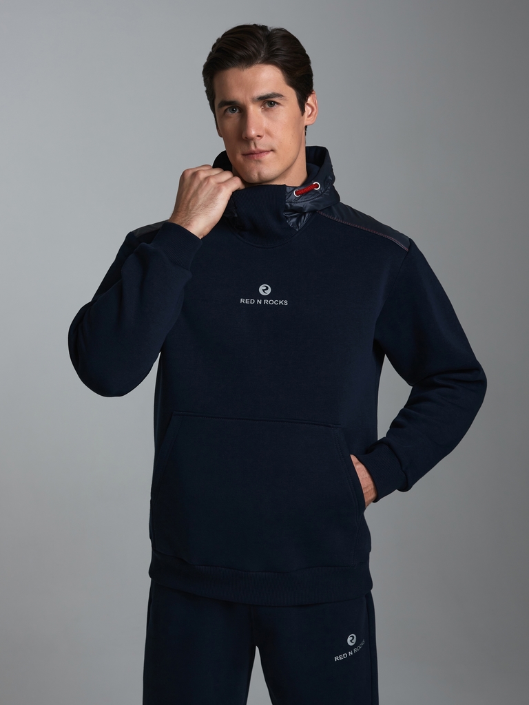 Спортивный костюм с капюшоном, из трехниточного плотного трикотажа с начесом по изнанке. Куртка-худи прямого силуэта. Рукава втачные со спушенной линией плеча. Читать далее Кокетки куртки, капюшон и н... Показать описаниеижняя часть задней брючины продублированы водонепроницаемой плащевкой.Карманы накладные "кенгуру". Манжеты рукавов и брючин и пояс куртки из эластичного трикотажа. Брюки с прорезными карманами на молниях, Низ брюк заужен анжетами. Пояс брюк по линии талии с эластичной тесьмой, дополнительно регулируется шнуром.На груди и на брюках под карманом - термотрансфер с фирменным логотипом.