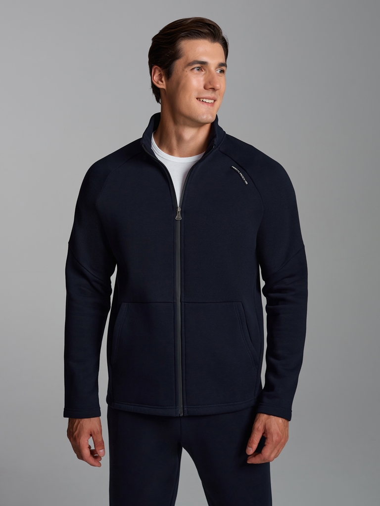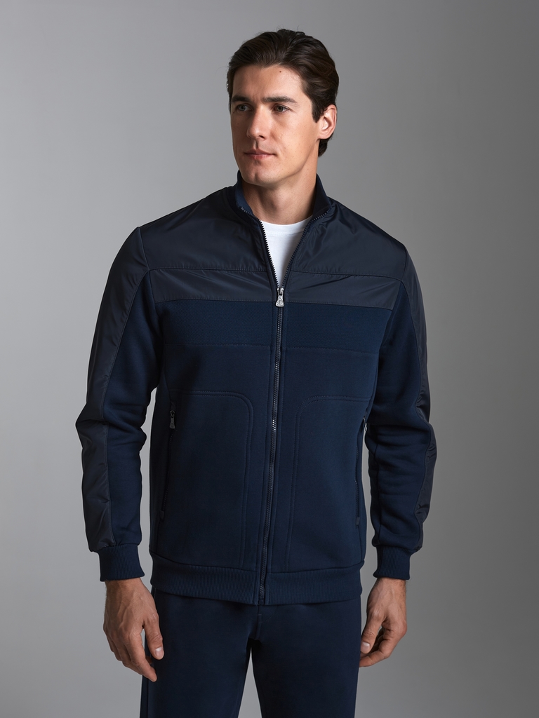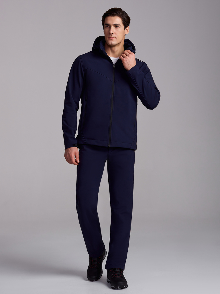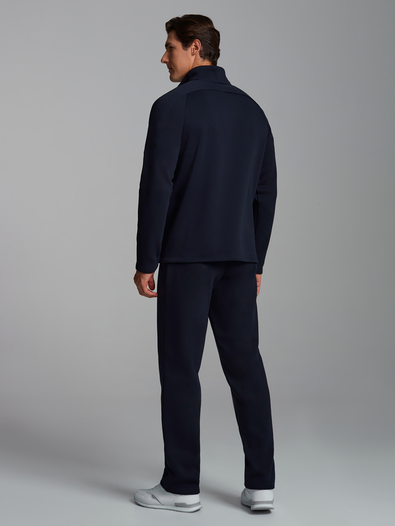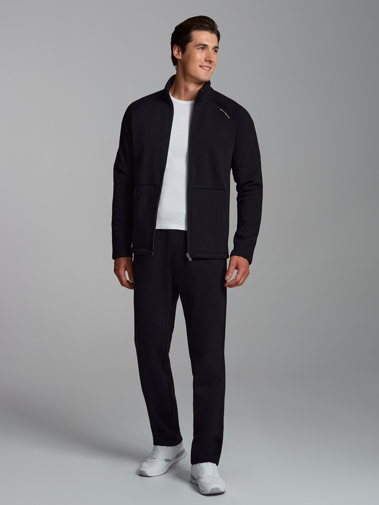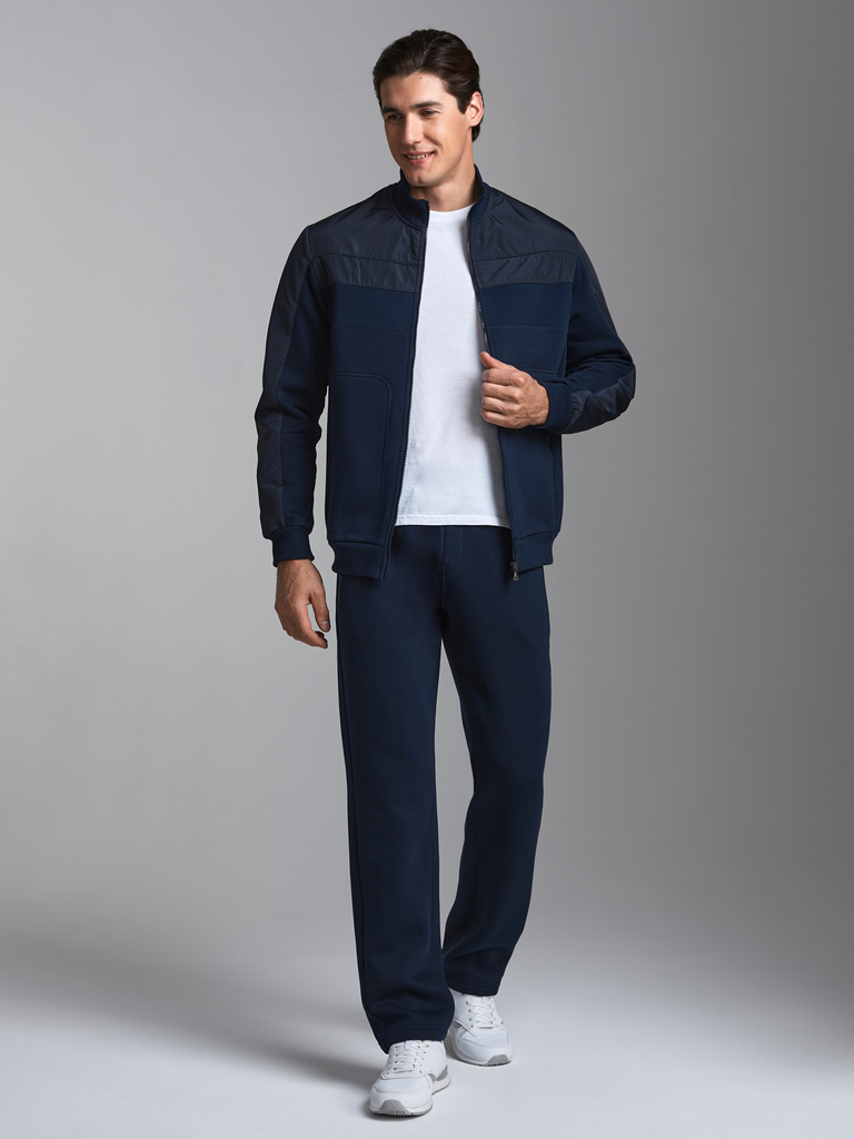 Мужской спортивный костюм из плотного трикотажа с изнаночным начесом. Верх комплекта - толстовка на молнии с воротником. Рукава втачные с эластичными манжетами. Читать далее Плечевая кокетка и верхние... Показать описание вставки рукава продублированы водоотталкивающей плащевкой. на груди куртки вставка из плотного рельефного полотна в цвет изделия. Низ куртки на поясе из эластичной трикотажной резинки. Карманы куртки и брюк на молниях. Брюки прямые. Пояс брюк эластичный, по линии талии дополнительно регулируется шнуром.