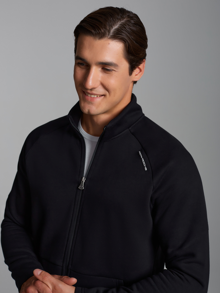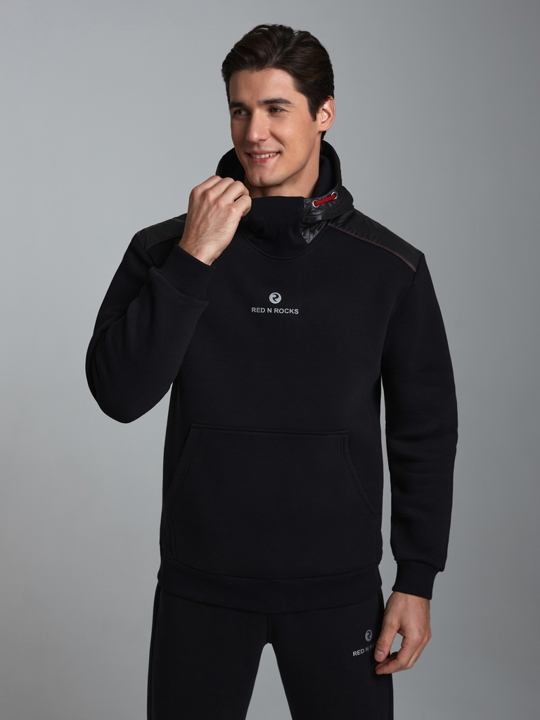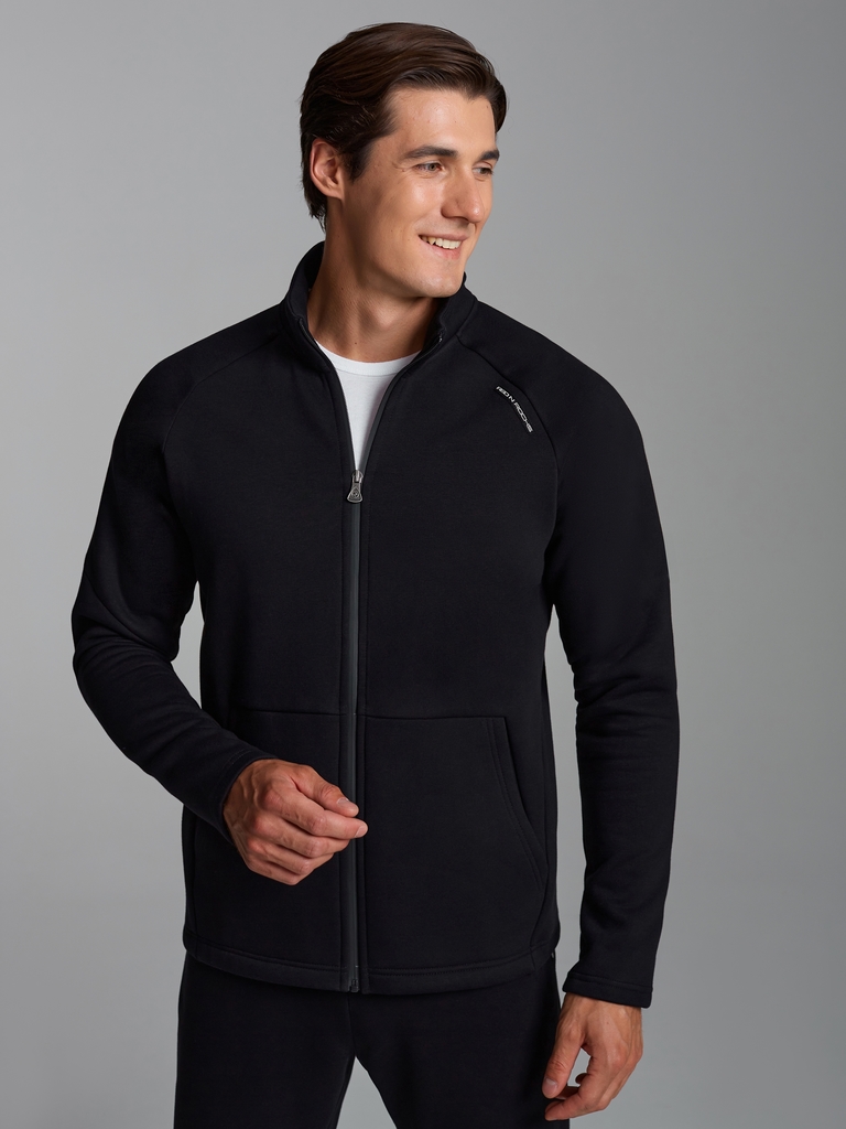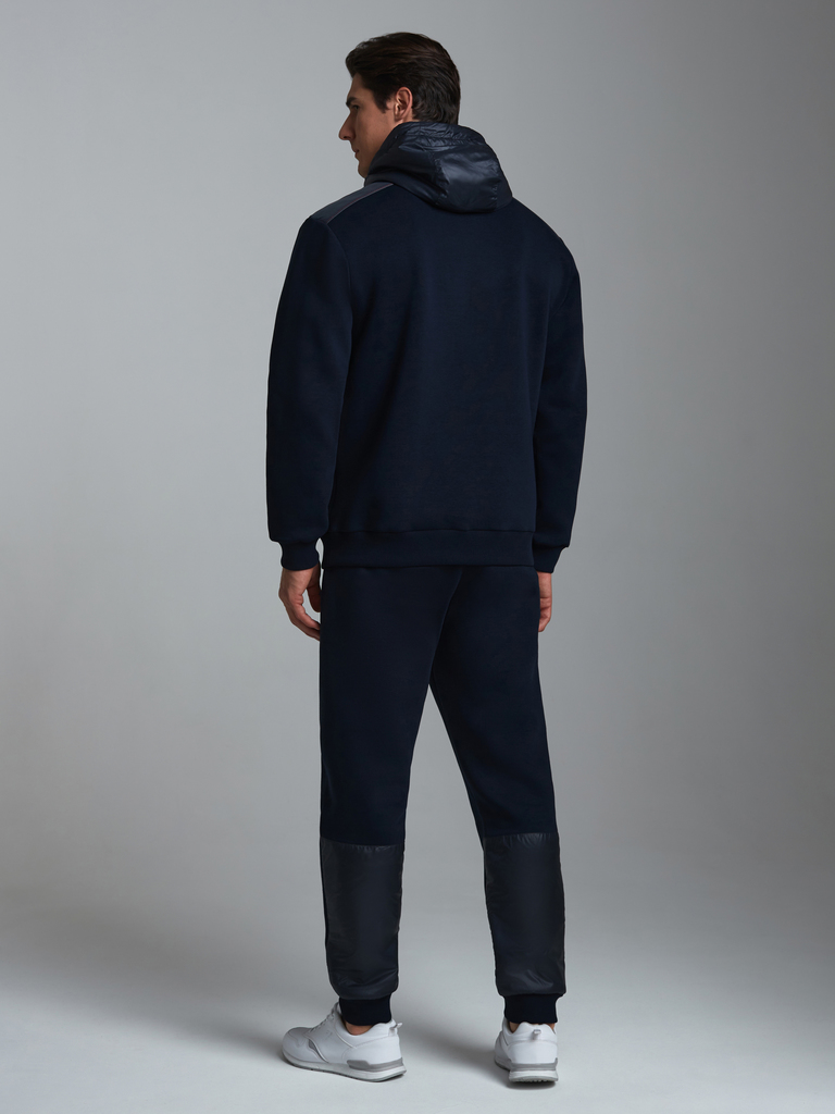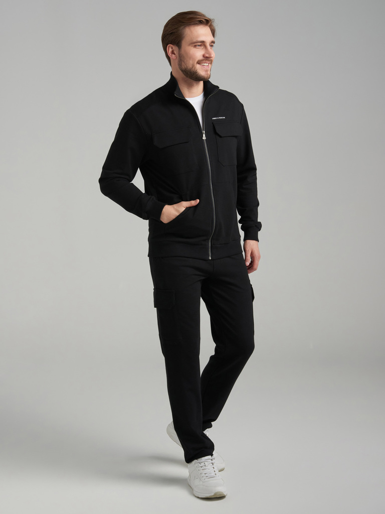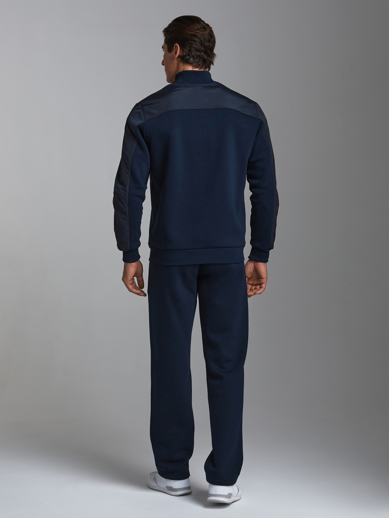 Мужской спортивный костюм из плотного трикотажа с изнаночным начесом. Верх комплекта - толстовка на молнии с воротником. Рукава втачные с эластичными манжетами. Читать далее Плечевая кокетка и верхние... Показать описание вставки рукава продублированы водоотталкивающей плащевкой. на груди куртки вставка из плотного рельефного полотна в цвет изделия. Низ куртки на поясе из эластичной трикотажной резинки. Карманы куртки и брюк на молниях. Брюки прямые. Пояс брюк эластичный, по линии талии дополнительно регулируется шнуром.