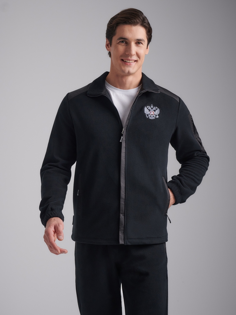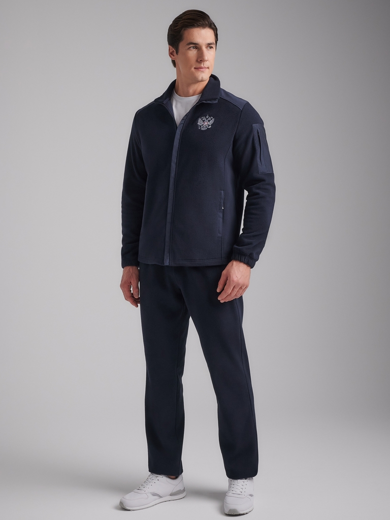 Костюм мужской из флиса. Куртка костюма с воротником-стойкой, застегивается на молнию. Передняя часть воротника и передняя часть куртки простеганы с водонепроницаемой плащевкой. Читать далее Рукава по... Показать описаниекроя реглан. Верхний край воротника, низ рукавов и низ куртки окантованы эластичной тесьмой. Под швом рукава слева на груди нашит фирменный шеврон. Карманы куртки прорезные, с планками. Брюки прямые. Карманы прорезные с планками, слева под карманом нашит фирменный шеврон. Эластичный пояс брюк дополнительно фиксируется шнуром.