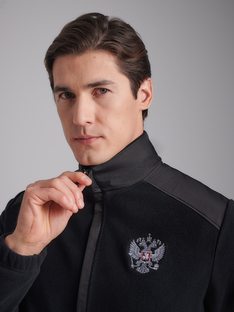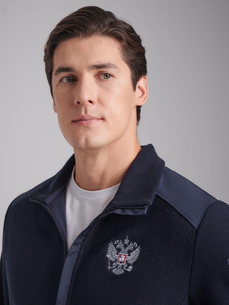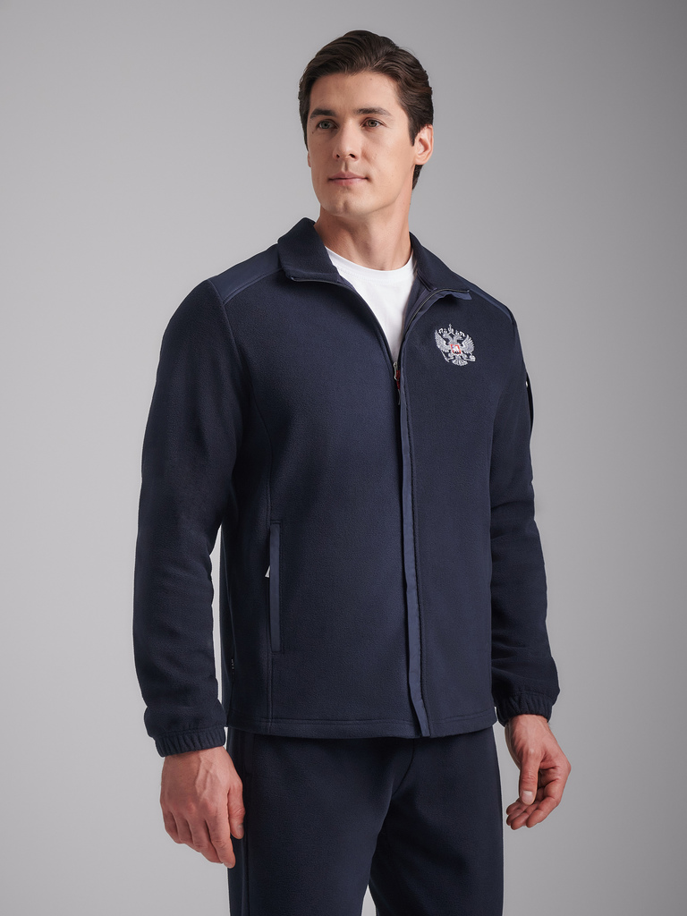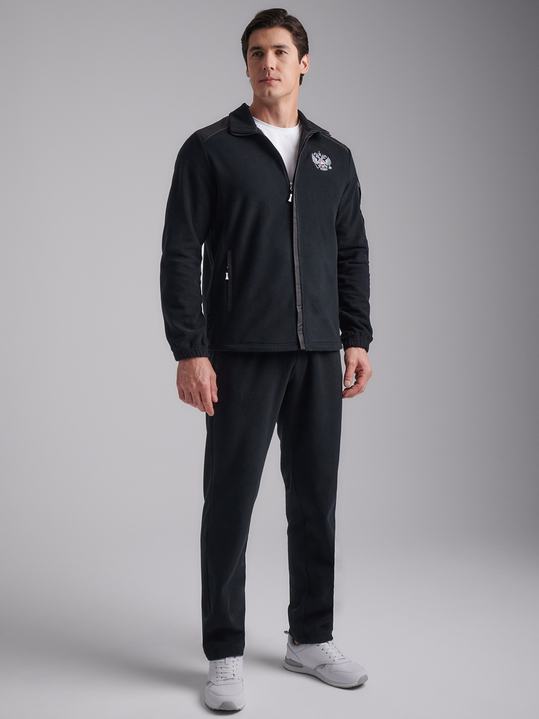 Утепленный спортивный комплект состоит из куртки и брюк изготовлен из водоотталкивающей плащевой ткани с мембранным пленочным покрытием. Куртка на молнии с воротником-стойкой и съемным капюшоном. Утеп... Показать описаниелитель куртки – высокотехнологичный полиэфирный материал из микроволокна. Читать далее Дополнительный комфорт и теплоизоляцию создает флисовая подкладка куртки и капюшона. Температурный режим эксплуатации изделия – до -20С. Куртка прямого силуэта, удобные рукава покроя реглан. Боковые карманы - прорезные с молниями, нагрудный карман так же на молнии. Дополнительный карман с молнией на левом рукаве, внутренний карман слева на подкладке так же застегивается на молнию. Лицевая часть капюшона и ширина низа куртки регулируется с помощью пластиковых фиксаторов, трикотажные внутренние манжеты рукавов создают дополнительную защиту от холодного воздуха. На груди куртки слева – вышивка герб России, на спине вышивка-аппликация RUSSIA. На левом рукаве шеврон флаг России. На правом рукаве нашивка с фирменным логотипом. Брюки прямого с