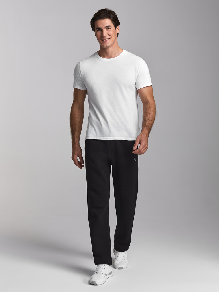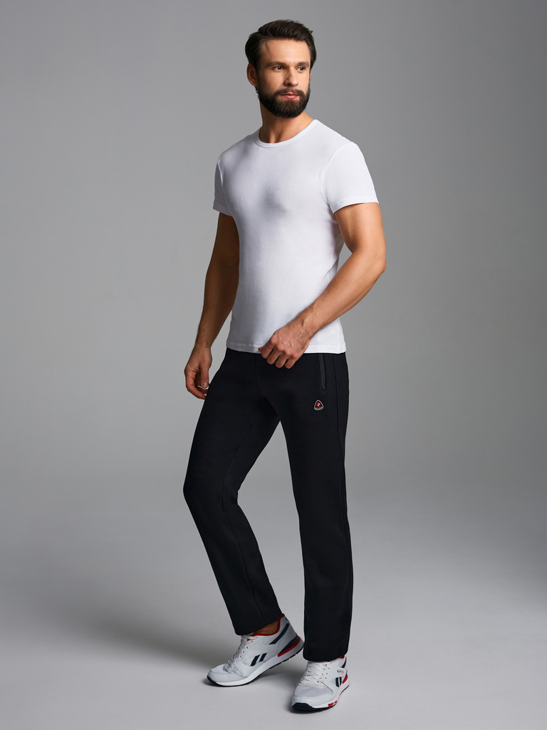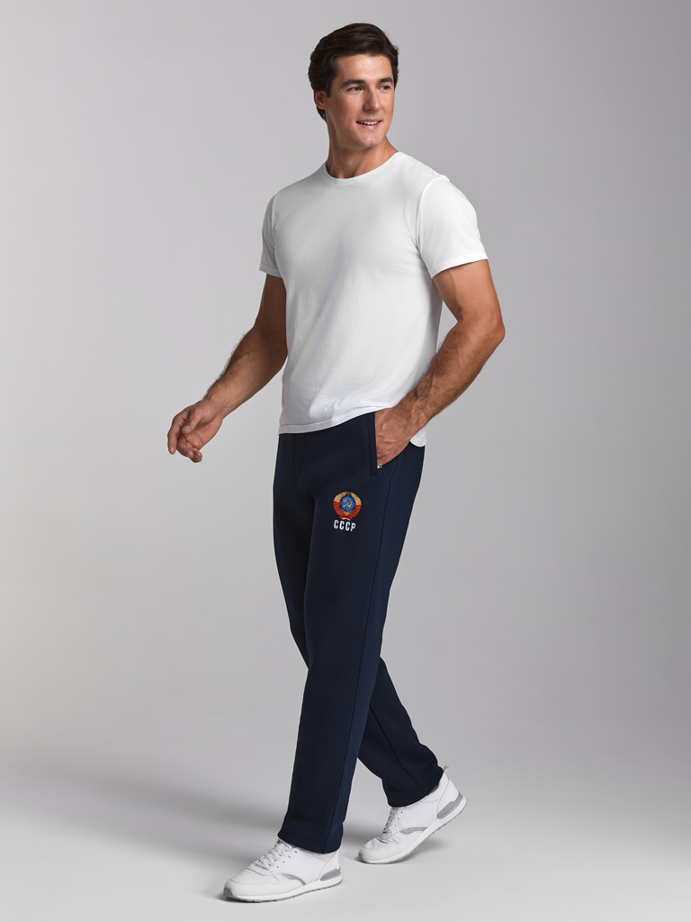 Брюки мужские из плотного и мягкого хлопкового трикотажного полотна с изнаночным начесом. Брюки прямые с прорезными карманами, с открытой молнией. Пояс брюк из основной ткани, по линии талии регулируе... Показать описаниется шнурком. Читать далее На правой половинке настрочен шеврон с фирменным логотипом.