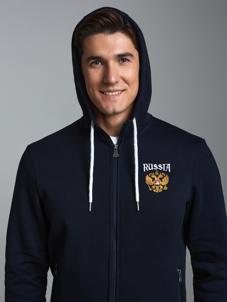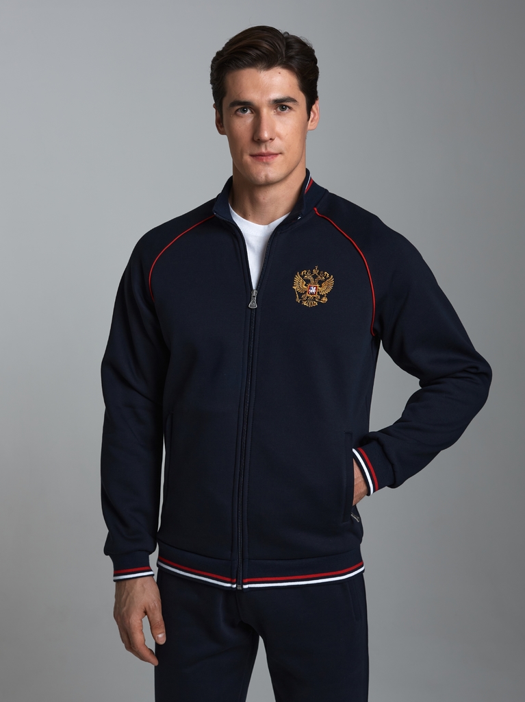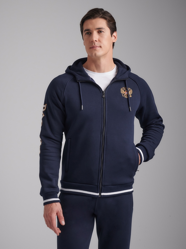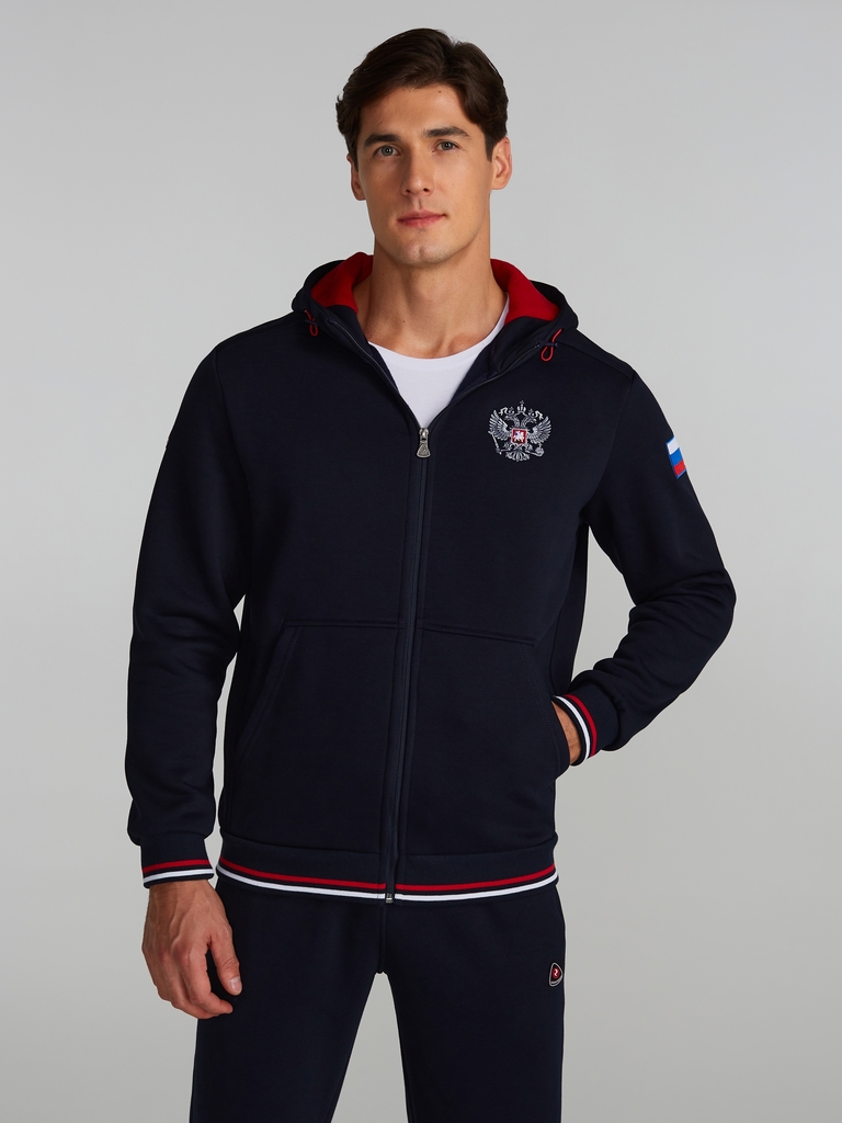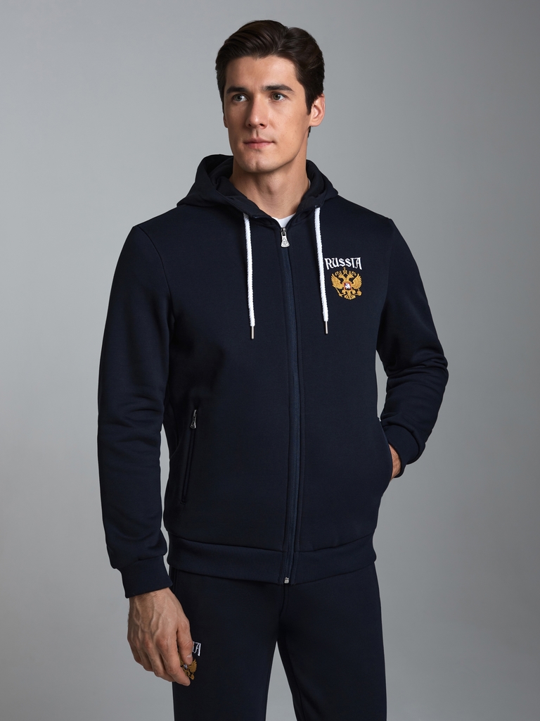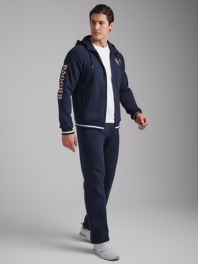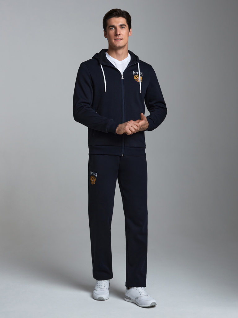 Спортивный костюм из трехниточного плотного трикотажа с начесом по изнанке.Рукава втачные. Куртка с капюшом, застегивается на молнию. Читать далее Карманы куртки - кенгуру.. По низу куртки и низу рука... Показать описаниевов пришита рельефная вязанная резинка с полосами. Слека на куртке вышивка российского герба, на спинке куртки - выщивка-аппликация - RUSSIA. Вышивки выполены цветными шелковыми нитями. На левом рукаве - шеврон флаг России. На правом рукаве и на левой брючине под корманом шеврон с фирменным логотипом. На брюках два боковых кармана с планками на молниях . Брюки зауженны, с резинкой по низу. Пояс брюк с эластичной резинкой по линии талии дополнительно регулируется шнуром.