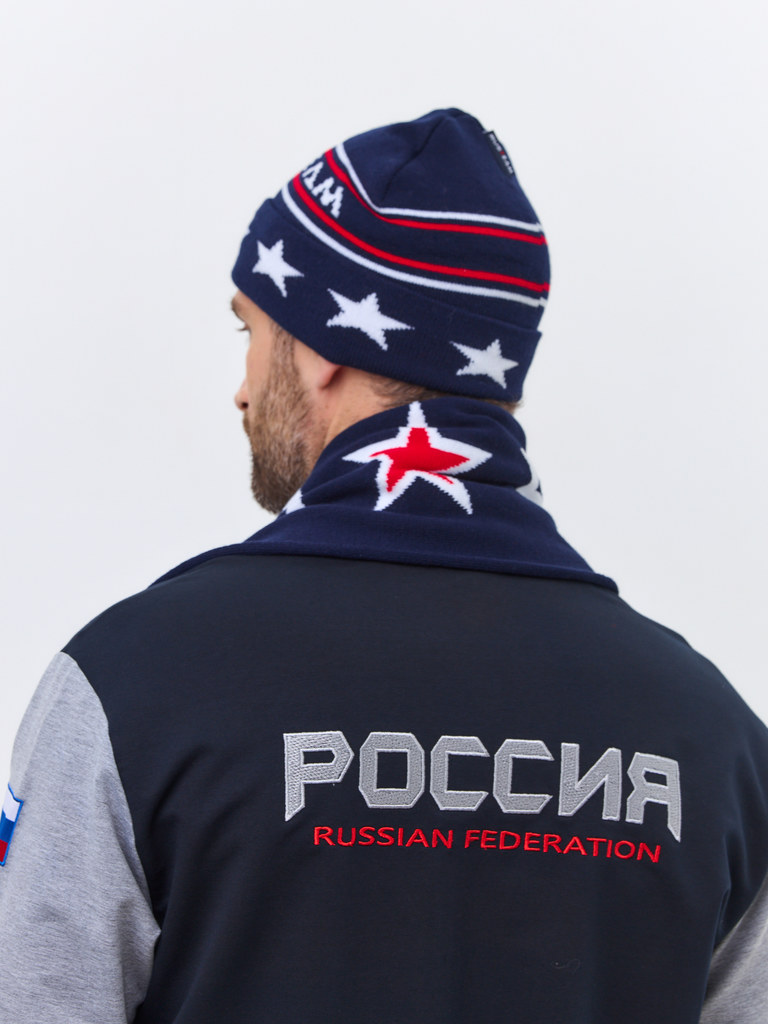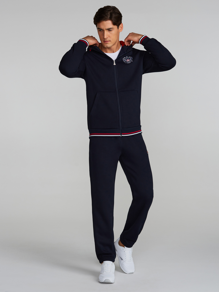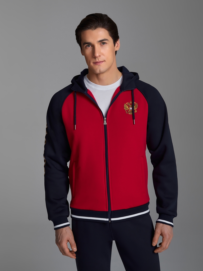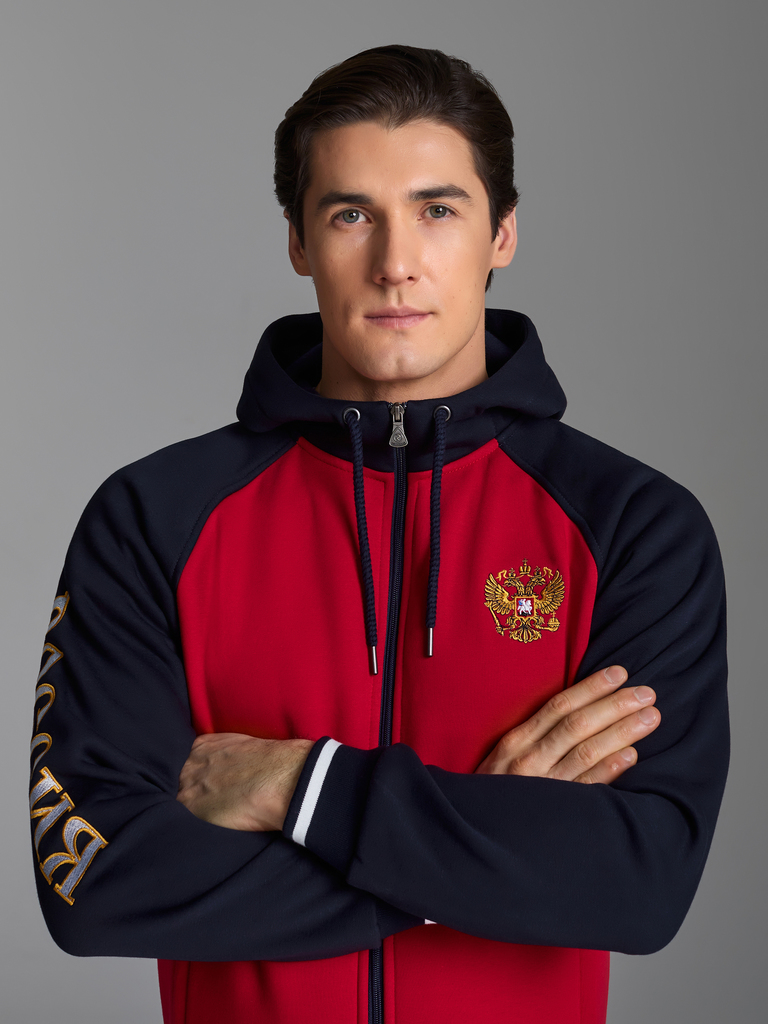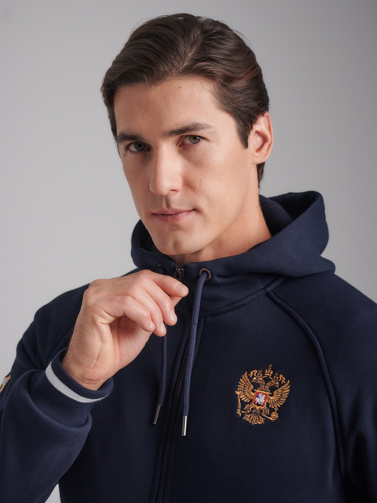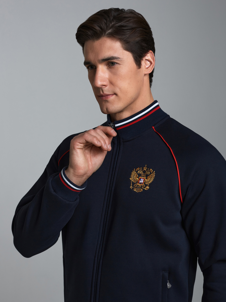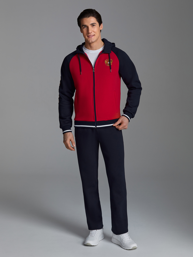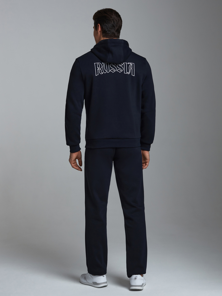 Спортивный костюм из трехниточного плотного трикотажа с начесом по изнанке.Рукава втачные. Куртка с капюшом, застегивается на молнию. Читать далее Карманы куртки - кенгуру.. По низу куртки и низу рука... Показать описаниевов пришита рельефная вязанная резинка с полосами. Слека на куртке вышивка российского герба, на спинке куртки - выщивка-аппликация - RUSSIA. Вышивки выполены цветными шелковыми нитями. На левом рукаве - шеврон флаг России. На правом рукаве и на левой брючине под корманом шеврон с фирменным логотипом. На брюках два боковых кармана с планками на молниях . Брюки зауженны, с резинкой по низу. Пояс брюк с эластичной резинкой по линии талии дополнительно регулируется шнуром.