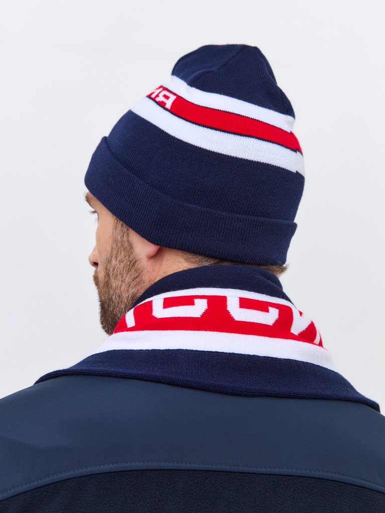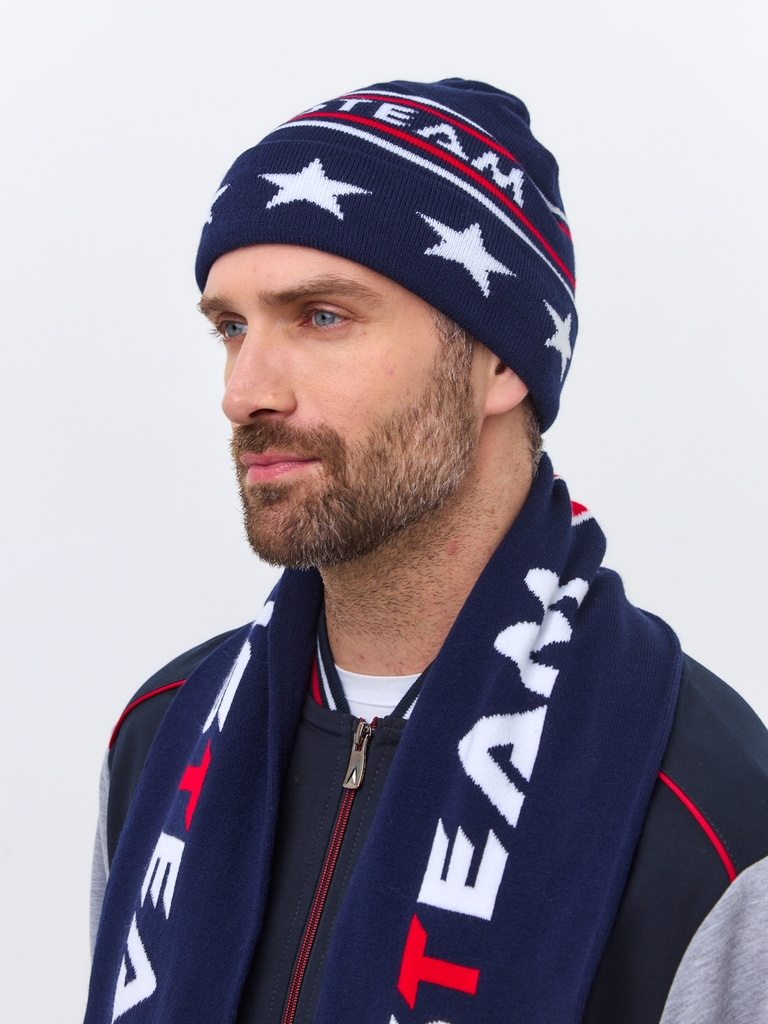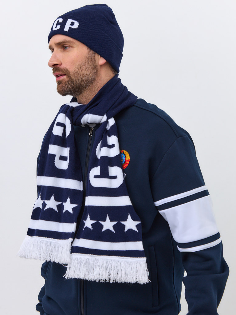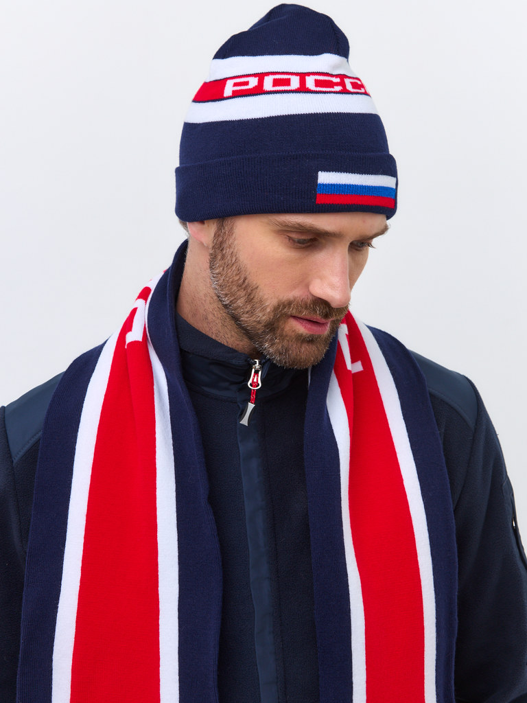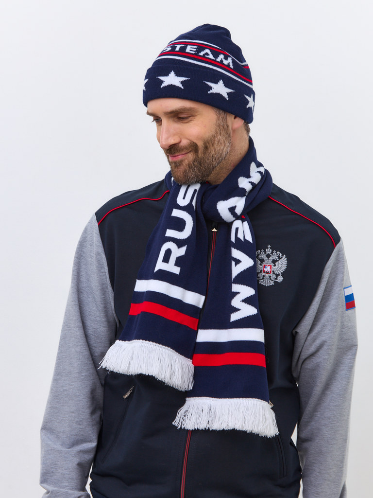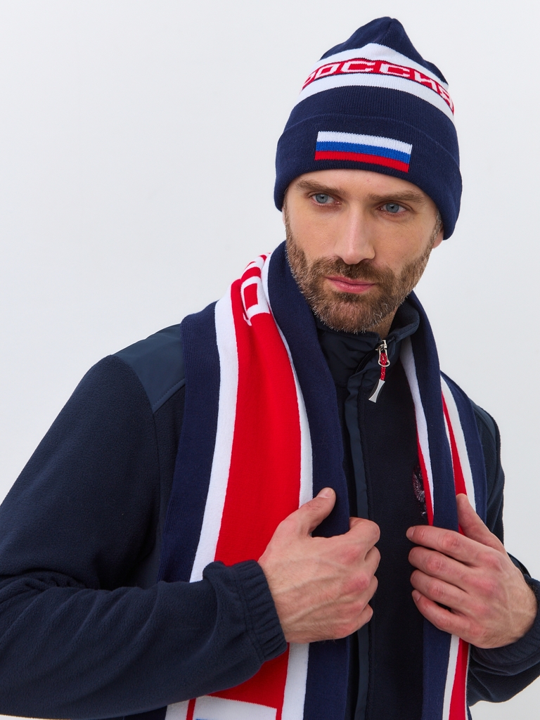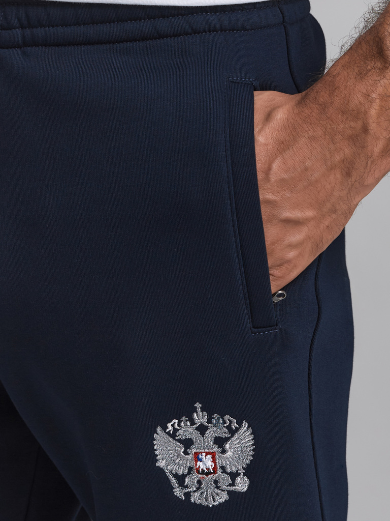 Спортивный костюм из трехниточного плотного трикотажа с начесом по изнанке.Рукава втачные. Куртка с капюшом, застегивается на молнию. Читать далее Карманы куртки - кенгуру.. По низу куртки и низу рука... Показать описаниевов пришита рельефная вязанная резинка с полосами. Слека на куртке вышивка российского герба, на спинке куртки - выщивка-аппликация - RUSSIA. Вышивки выполены цветными шелковыми нитями. На левом рукаве - шеврон флаг России. На правом рукаве и на левой брючине под корманом шеврон с фирменным логотипом. На брюках два боковых кармана с планками на молниях . Брюки зауженны, с резинкой по низу. Пояс брюк с эластичной резинкой по линии талии дополнительно регулируется шнуром.