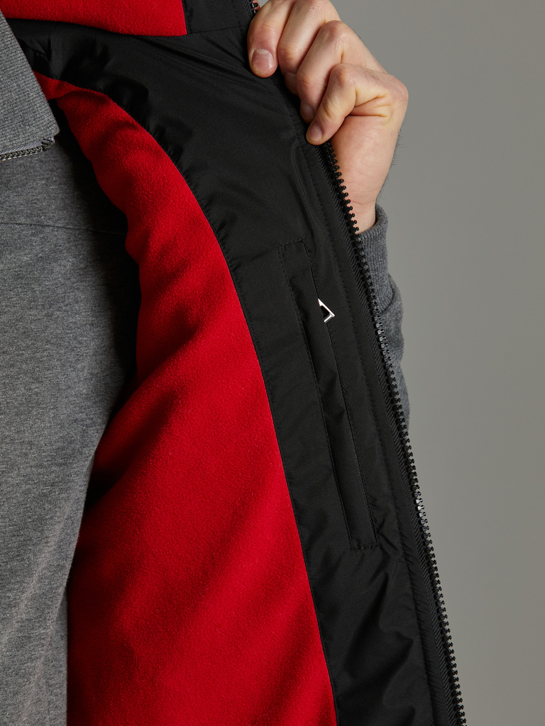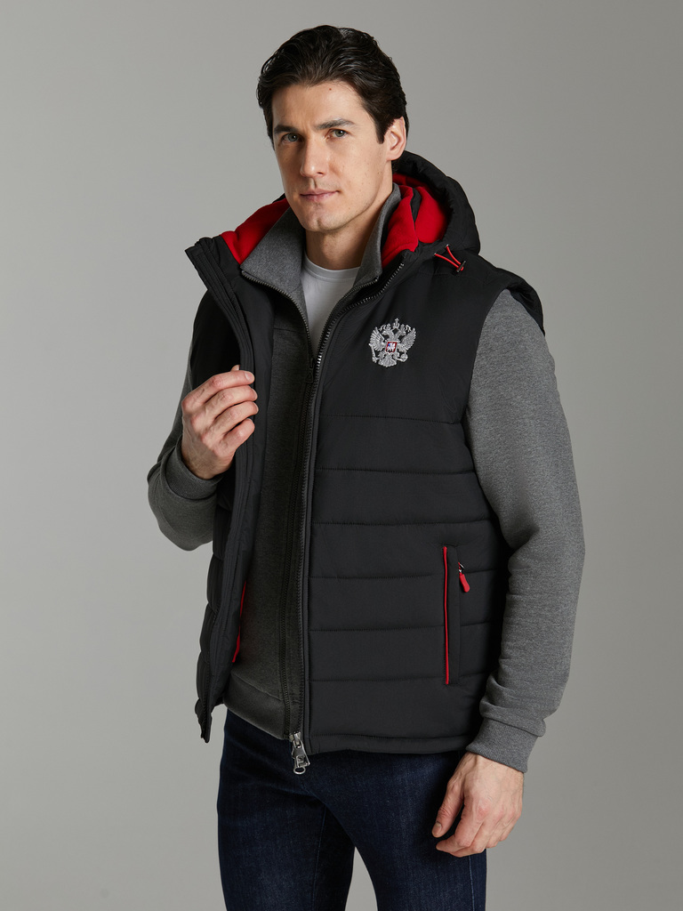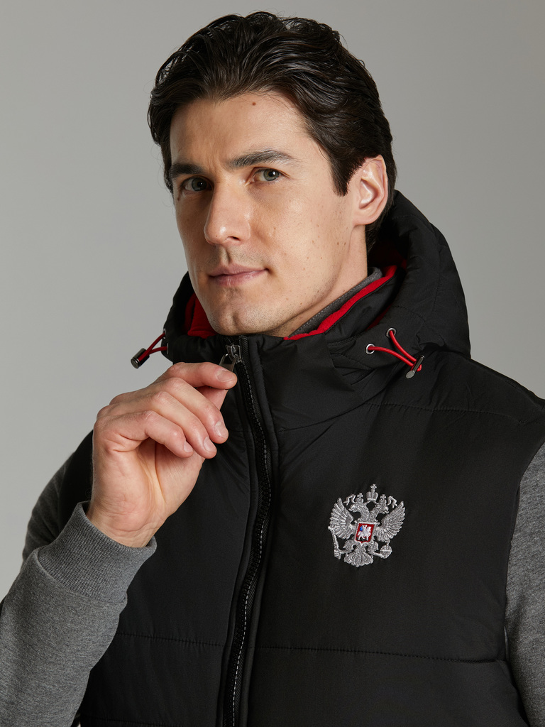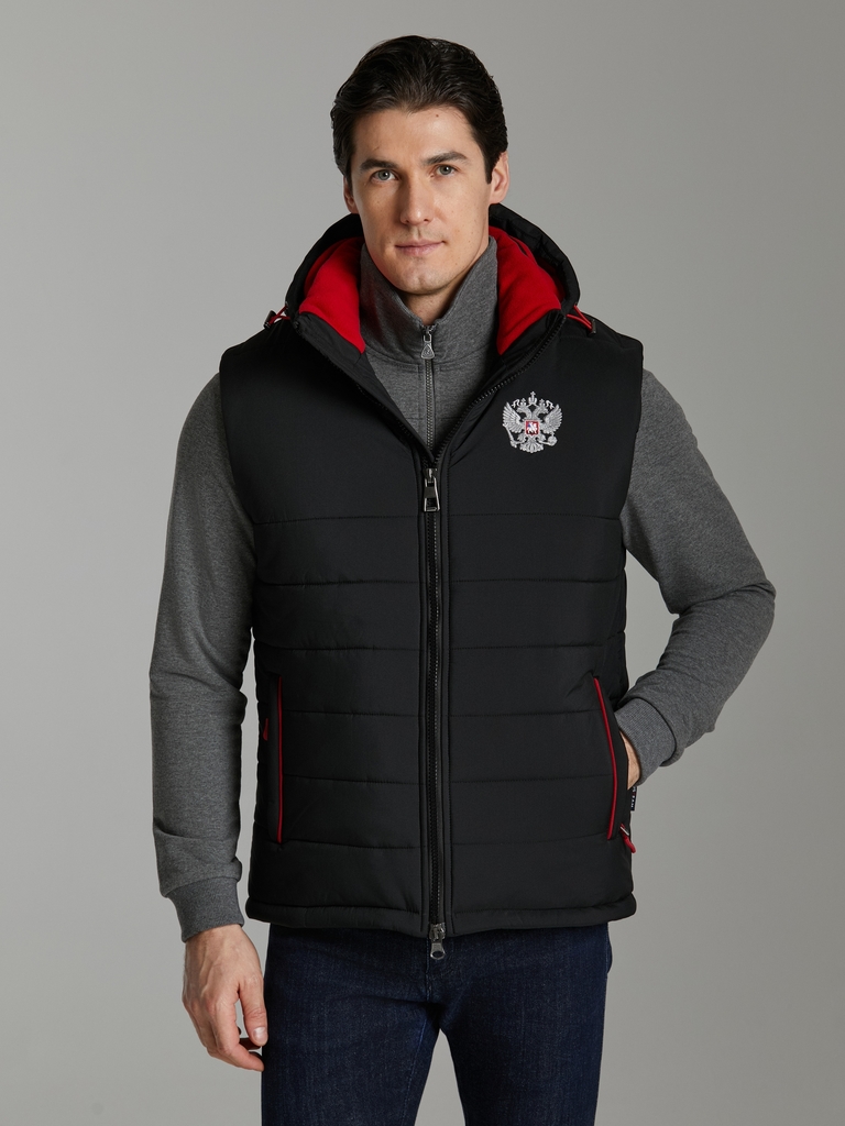 Утепленный жилет, артикул 98M-RT-1778 черного цвета, изготовлен из водоотталкивающей плащевой ткани с мембранным пленочным покрытием. Изделие выполнено в командной стилистике с российской символикой. ... Показать описаниеЖилет на молнии, с воротником-стойкой и съемным капюшоном. Читать далее Утеплитель куртки – высокотехнологичный полиэфирный материал из микроволокна. Дополнительный комфорт и теплоизоляцию создает флисовая подкладка жилета и капюшона. Внутренняя поверхность воротника так же из мягкого флиса. Температурный режим эксплуатации изделия – до -20°С. Боковые карманы - прорезные с молниями, внутренний нагрудный карман так же на молнии. Лицевая часть капюшона регулируется с помощью эластичного шнура и пластиковых фиксаторов. На груди жилета слева – вышивка герба России, на спине вышивка-аппликация РОССИЯ. Жилет предназначен для всех любителей активного отдыха и экипировки спортивных команд.