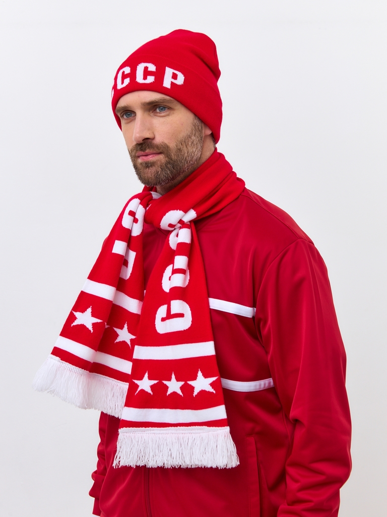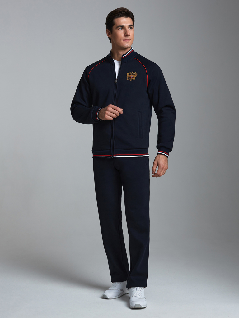 Спортивный костюм из хлопкового трикотажного полотна с начесом. Куртка на поясе с воротником, застегивается на молнию. Рукава покроя реглан, шов втачивания рукавов выделен красным кантом. Читать далее... Показать описание Карманы куртки прорезные с планками, застегиваются на молнию . На груди куртки слева - вышивка - герб России.. Воротник, манжеты и пояс куртки выполнены из полосатого эластичного трикотажа. Брюки прямые, с прорезными карманами на молнии .Пояс брюк эластичный, по линии талии дополнительно регулируется шнурком.