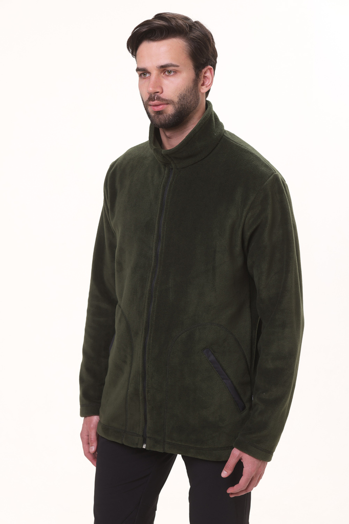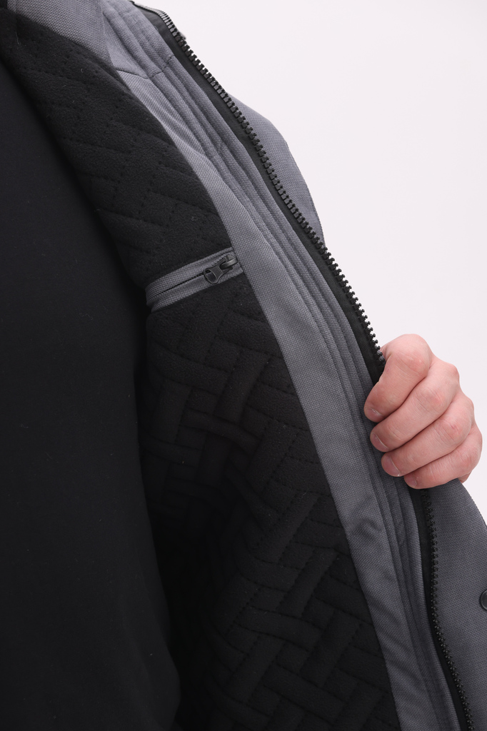 Куртка удлинённая, прямого силуэта с воротником - стойкой, переходящей в капюшон, с центральной бортовой застёжкой на молнию, с ветрозащитным клапаном, застёгивающимся на кнопки. Полочки с отрезными к... Показать описаниеокетками. На полочках обработаны два нижних прорезных кармана в листочку и два верхних прорезных кармана в рамку, застёгивающихся на молнию и закрывающиеся листочками. Спинка цельнокроёная, с внутренней кулисой по линии талии стягивающейся шнуром с фиксатором. Рукава втачные цельнокроёные, по низу собранные на резинку. На куртке по низу проложен шнур для регулировки объёма. Капюшон втачной, по лицевому вырезу стягивается шнуром, закреплённым фиксаторами. Полочка, спинка, капюшон – термостёжка флис Рукава – термостёжка тафетта
