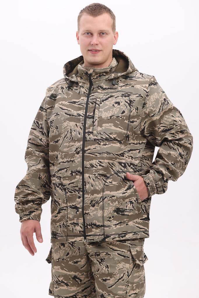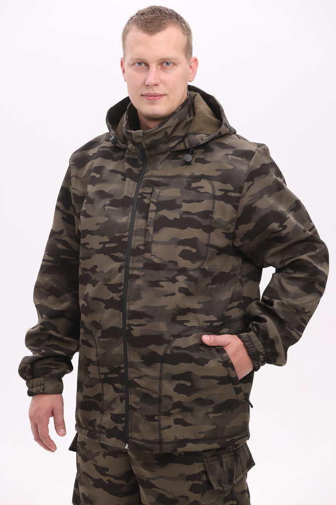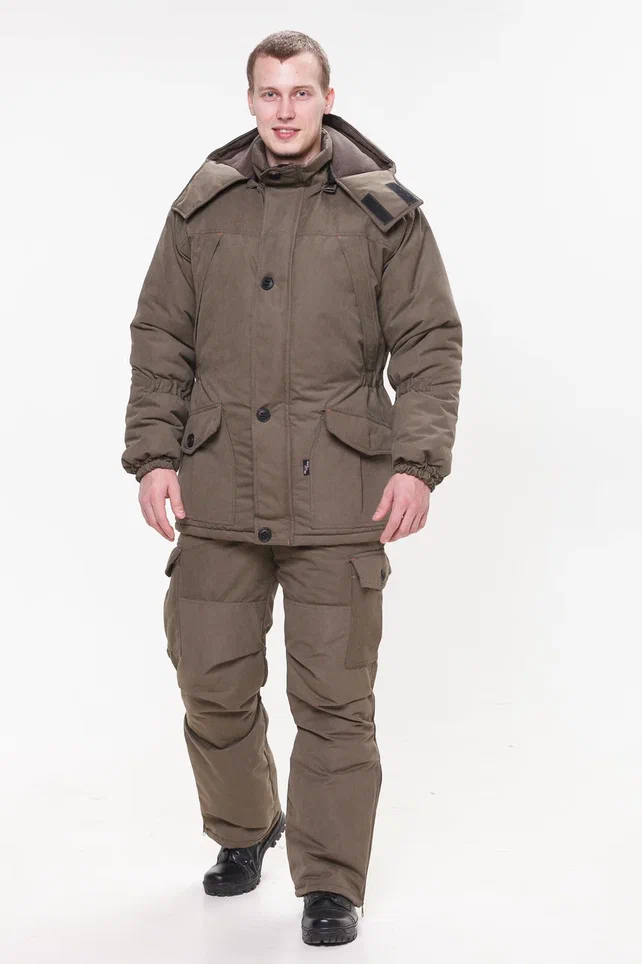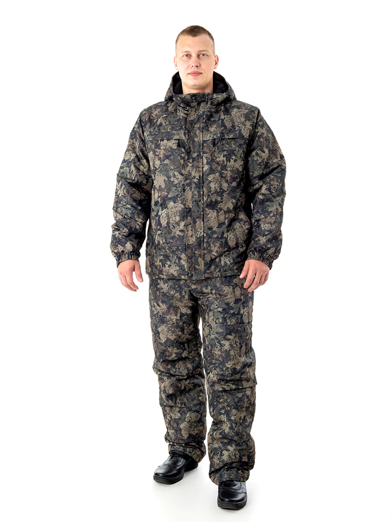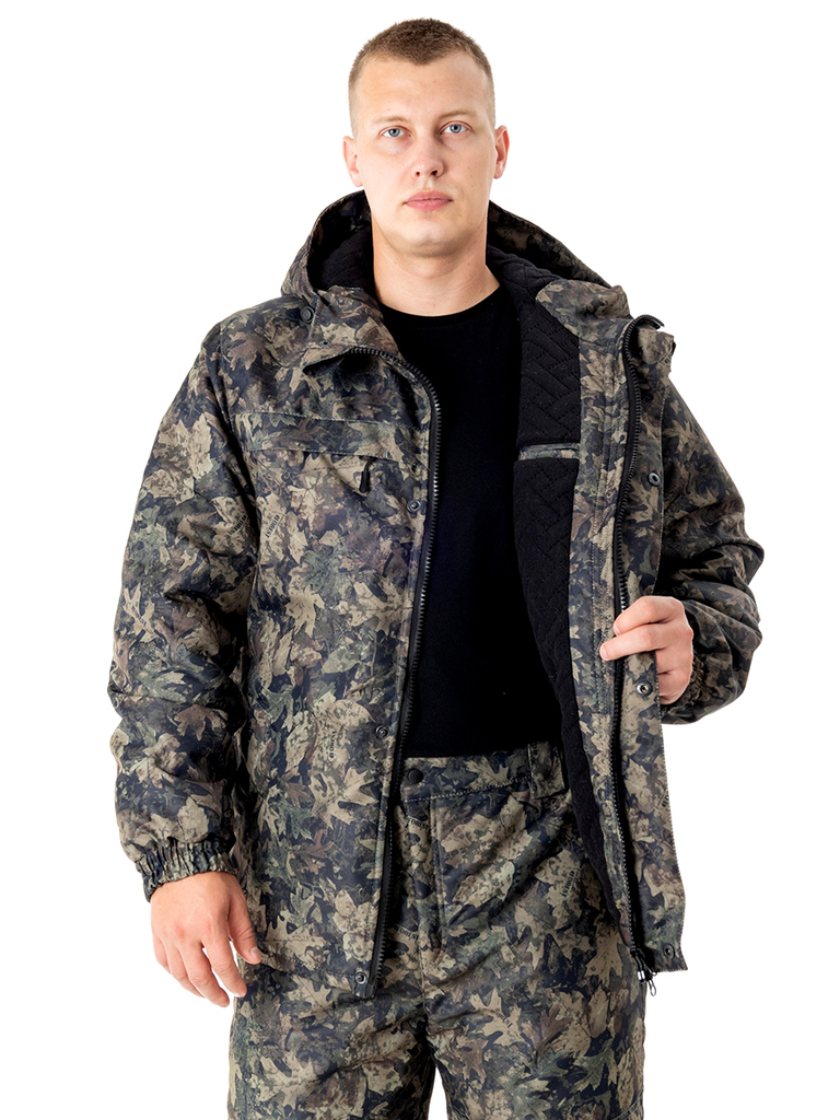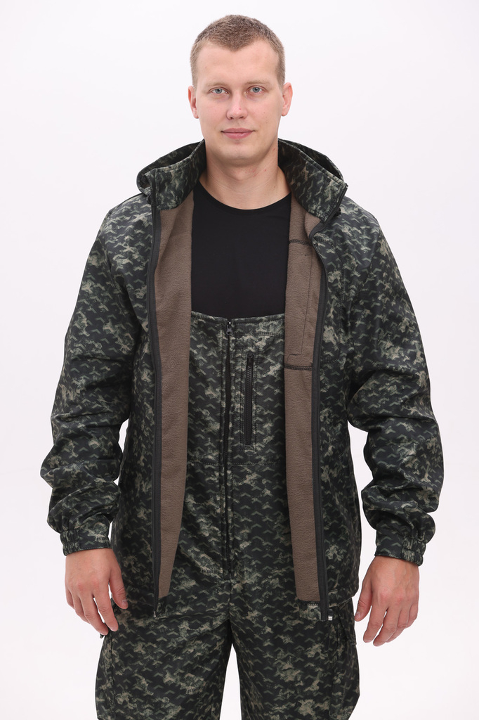 Костюм предназначен для охоты, рыбалки, прогулок на природе в осенне - весенний период года ГОСТ 25295-2003 Куртка укороченная на флисовой подкладке, с воротником - стойкой, с центральной бортовой зас... Показать описаниетёжкой на молнию (тр. 8/1), с ветрозащитным клапаном, застёгивающимся на тесьму "контакт". Полочки с отрезными кокетками и отлетными клапанами. На полочках обработаны два нижних двойных накладных кармана с клапанами и два верхних накладных объёмных кармана, застёгивающихся на молнию. Спинка цельнокроёная. Рукава втачные из двух частей, с манжетами, притаченными по низу, собранные на резинку. Куртка на притачном поясе, собранном на эластичную ленту - резинку. Капюшон на термостежке, пристёгивается к куртке при помощи застёжки-молнии. По лицевому вырезу капюшон стягивается шнуром, закреплённым фиксаторами. Концы капюшона убираются в кармашки, расположенные на воротнике. На подкладке полочек обработаны накладные карманы из основной ткани, застёгивающиеся на текстильную застежку "контакт". Брюки на термостежке, с гульфом на молнии, притачном поясе со шлёвками, собранном на резинку. На передних половинках обработаны два боковых кармана, в области боковых швов настрочены два накладных кармана - книжки с клапанами.
