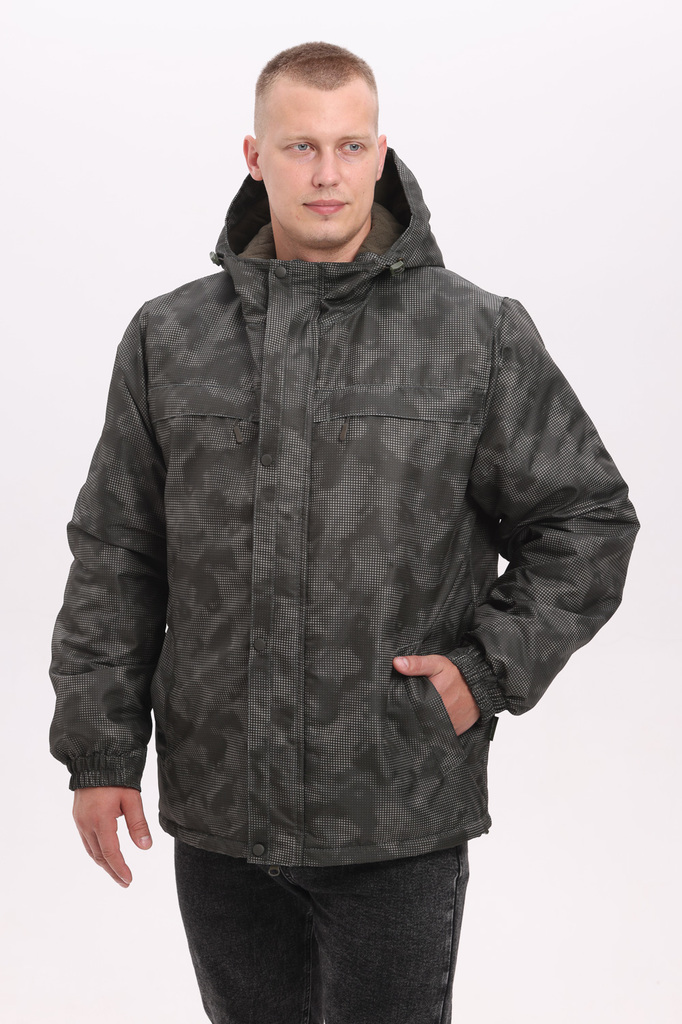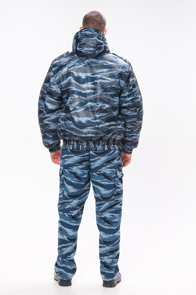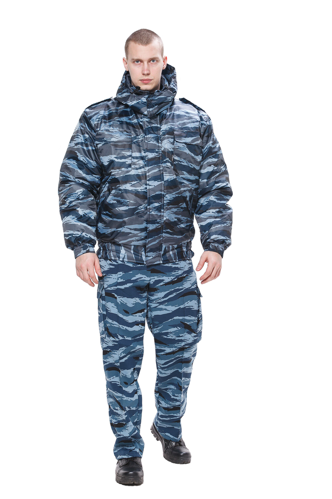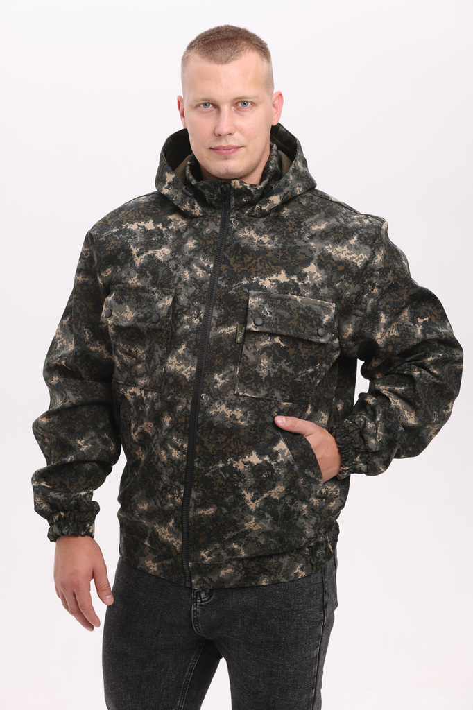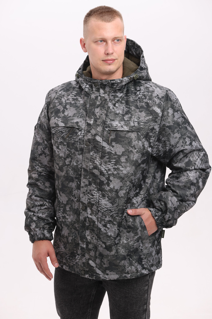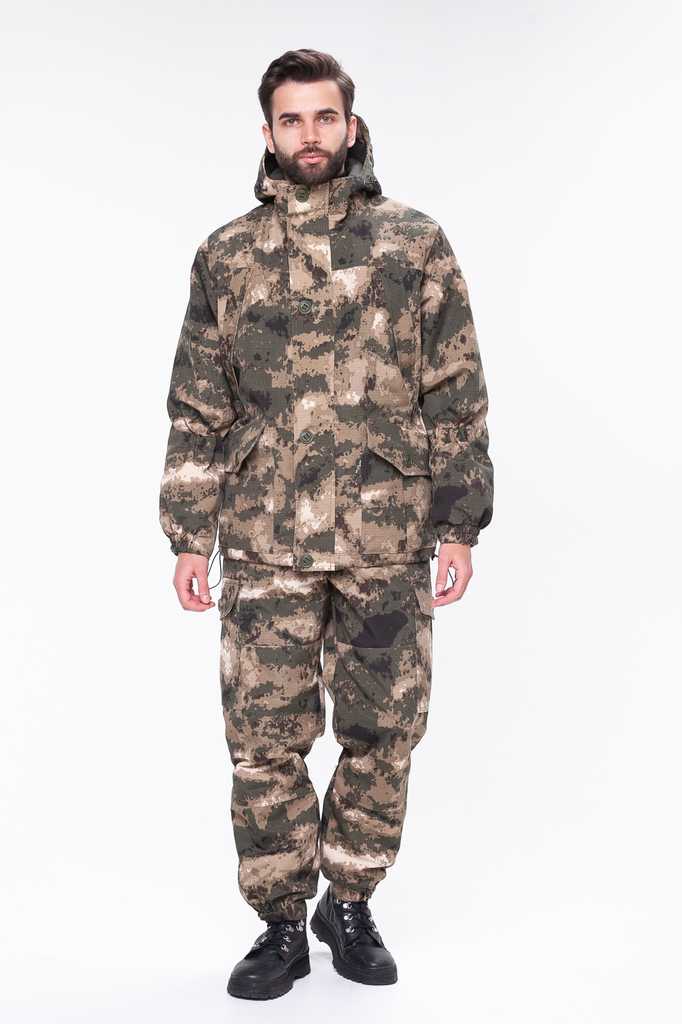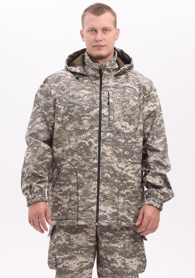 Костюм предназначен для охоты, рыбалки, прогулок на природе в осенне - весенний период года ГОСТ 25295-2003 Куртка укороченная на флисовой подкладке, с воротником - стойкой, с центральной бортовой зас... Показать описаниетёжкой на молнию (тр. 8/1), с ветрозащитным клапаном, застёгивающимся на тесьму "контакт". Полочки с отрезными кокетками и отлетными клапанами. На полочках обработаны два нижних двойных накладных кармана с клапанами и два верхних накладных объёмных кармана, застёгивающихся на молнию. Спинка цельнокроёная. Рукава втачные из двух частей, с манжетами, притаченными по низу, собранные на резинку. Куртка на притачном поясе, собранном на эластичную ленту - резинку. Капюшон на термостежке, пристёгивается к куртке при помощи застёжки-молнии. По лицевому вырезу капюшон стягивается шнуром, закреплённым фиксаторами. Концы капюшона убираются в кармашки, расположенные на воротнике. На подкладке полочек обработаны накладные карманы из основной ткани, застёгивающиеся на текстильную застежку "контакт". Брюки на термостежке, с гульфом на молнии, притачном поясе со шлёвками, собранном на резинку. На передних половинках обработаны два боковых кармана, в области боковых швов настрочены два накладных кармана - книжки с клапанами.