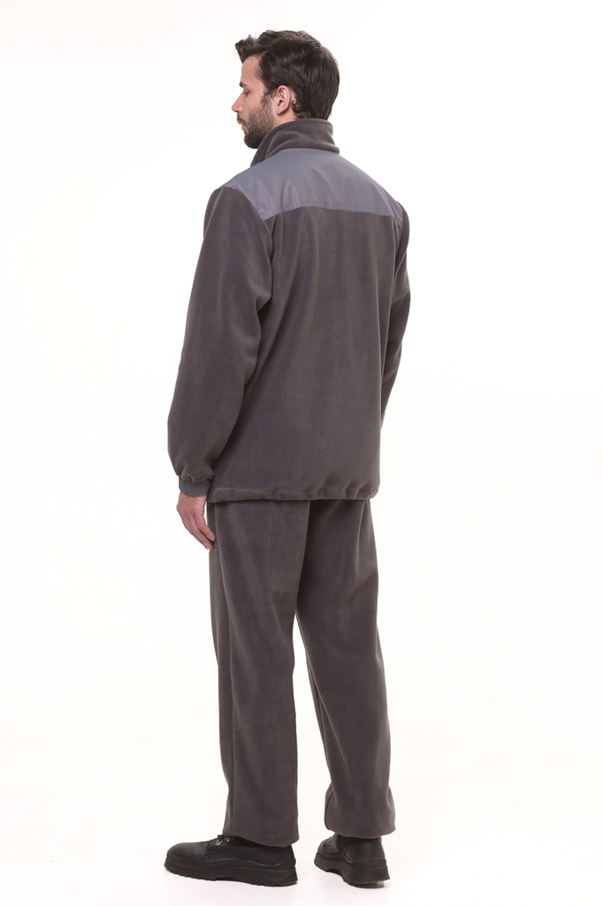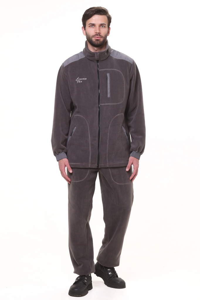 алова/флис+стежка. Костюм предназначен для охоты, рыбалки, прогулок на природе в осенне - весенний период года. ГОСТ 25295-2003 Куртка укороченная на флисовой подкладке, с воротником - стойкой, с цент... Показать описаниеральной бортовой застёжкой на молнию (тр. 8/1), с ветрозащитным клапаном, застёгивающимся на тесьму "контакт". Полочки с отрезными кокетками и отлетными клапанами. На полочках обработаны два нижних двойных накладных кармана с клапанами и два верхних накладных объёмных кармана, застёгивающихся на молнию. Спинка цельнокроёная. Рукава втачные из двух частей, с манжетами, притаченными по низу, собранные на резинку. Куртка на притачном поясе, собранном на эластичную ленту - резинку. Капюшон на термостежке, пристёгивается к куртке при помощи застёжки-молнии. По лицевому вырезу капюшон стягивается шнуром, закреплённым фиксаторами. Концы капюшона убираются в кармашки, расположенные на воротнике. На подкладке полочек обработаны накладные карманы из основной ткани, застёгивающиеся на текстильную застежку "контакт". Брюки на термостежке, с гульфом на молнии, притачном поясе со шлёвками, собранном на резинку. На передних половинках обработаны два боковых кармана, в области боковых швов настрочены два накладных кармана - книжки с клапанами.