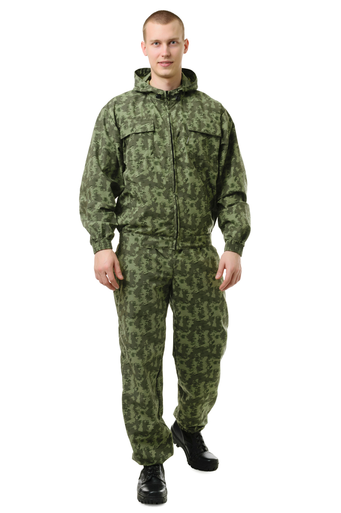 Состав: 90% ПЭ, 10% ХЛ. Ткань: сорочечная. Костюм "МАСКХАЛАТ" предназначен для отдыха на природе. ГОСТ 25295-2003 Куртка укороченная, с центральной бортовой застёжкой на молнию. На полочках обработаны... Показать описание два нижних прорезных кармана с листочкой и два верхних накладных кармана- книжки с клапанами, застёгивающимися на тесьму "контакт". Спинка цельнокроеная. Рукава в тачные из двух частей, с манжетами, притачанными по низу, собранные на резинку. Куртка на притачном поясе, собранном на эластичную ленту - резинку. Капюшон втачной, состоит из трёх частей, по лицевому вырезу стягивается шнуром. Брюки на притачном поясе, собранном на резинку. На передних половинках обработаны два боковых кармана. Низ брюк собран на резинку. Плотность сорочечной ткани 120 гр/кв.м