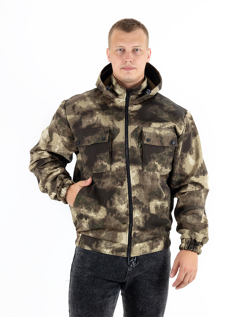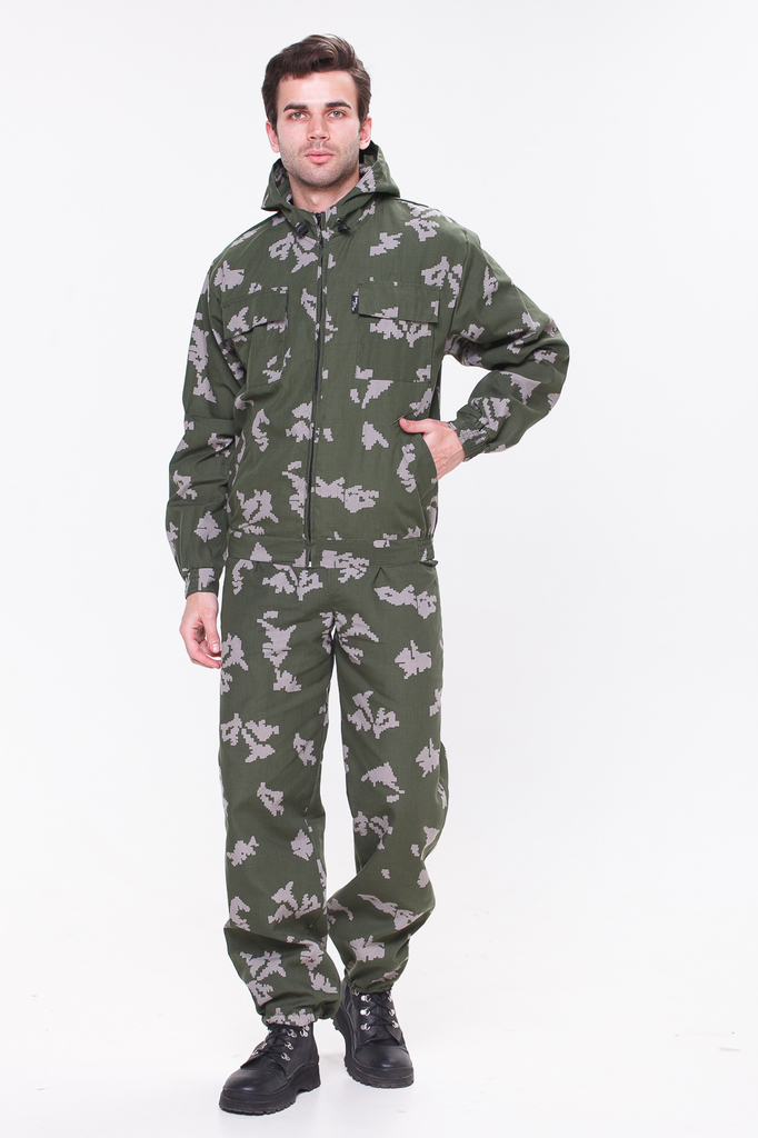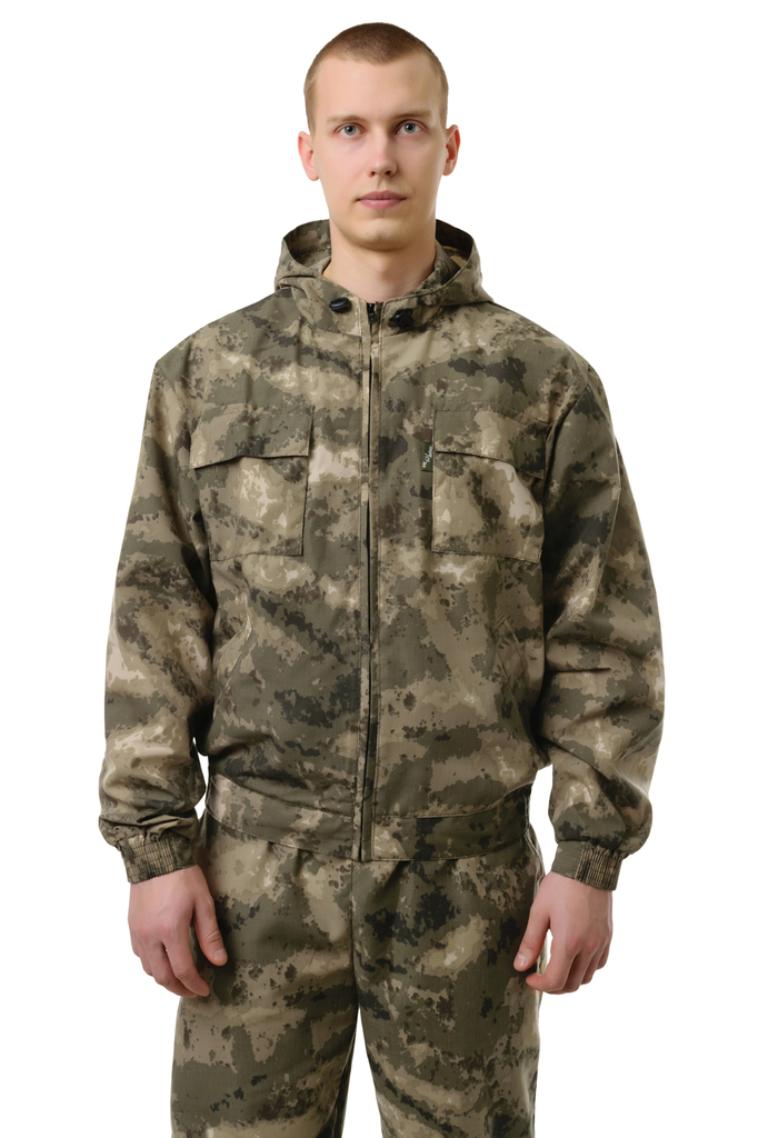 Состав ткани:100%хлопок. Модель: Маскхалат+сетка. Куртка укороченная, с центральной бортовой застёжкой на молнию. На полочках обработаны два нижних прорезных кармана с листочкой и два верхних накладны... Показать описаниех кармана- книжки с клапанами, застёгивающимися на тесьму "контакт". Спинка цельнокроёная. Рукава втачные из двух частей, с манжетами, притаченными по низу, собранные на резинку. Куртка на притачном поясе, собранном на эластичную ленту - резинку. Капюшон втачной, состоит из трёх частей, к обтачке которого крепится противомоскитная сетка. Сетка отстегивается и убирается в карман . Брюки на притачном поясе, собранном на резинку. На передних половинках обработаны два боковых кармана. Низ брюк собран на резинку.