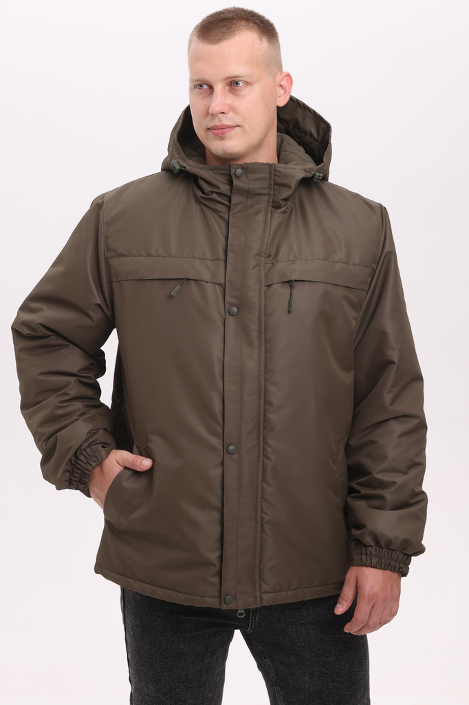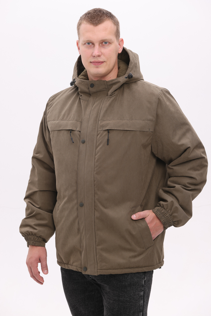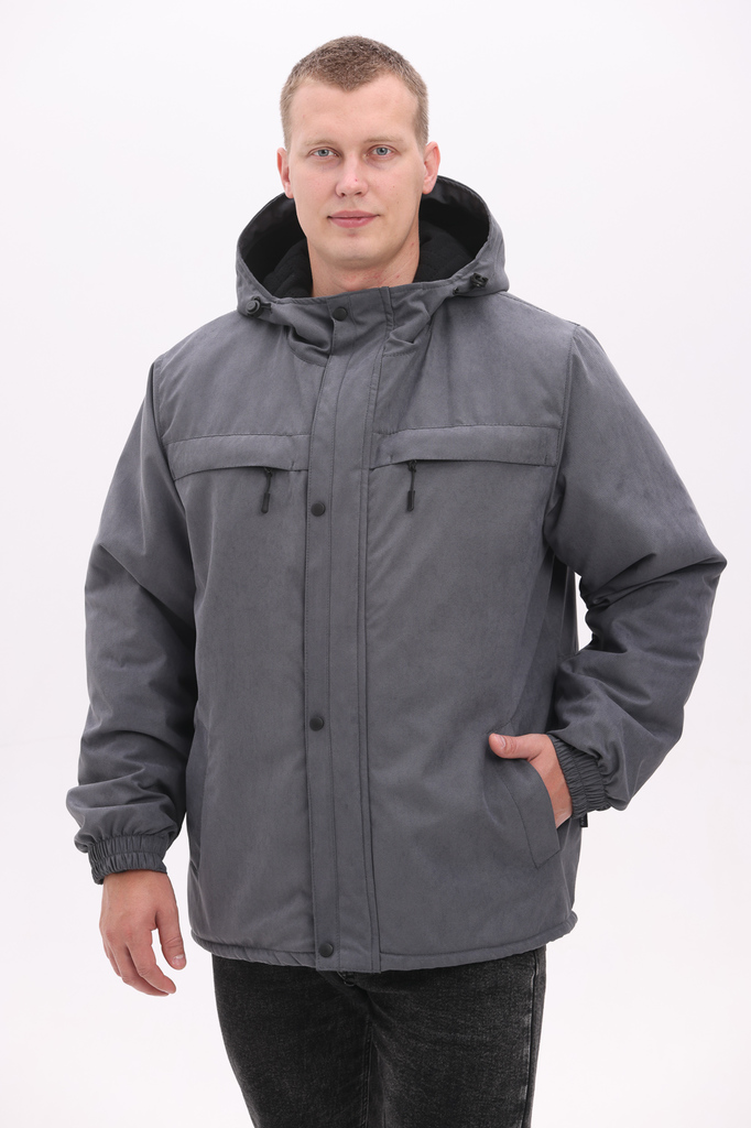 Куртка удлинённая, прямого силуэта с воротником - стойкой, переходящей в капюшон, с центральной бортовой застёжкой на молнию, с ветрозащитным клапаном, застёгивающимся на кнопки. Полочки с отрезными к... Показать описаниеокетками. На полочках обработаны два нижних прорезных кармана в листочку и два верхних прорезных кармана в рамку, застёгивающихся на молнию и закрывающиеся листочками. Спинка цельнокроёная, с внутренней кулисой по линии талии стягивающейся шнуром с фиксатором. Рукава втачные цельнокроёные, по низу собранные на резинку. На куртке по низу проложен шнур для регулировки объёма. Капюшон втачной, по лицевому вырезу стягивается шнуром, закреплённым фиксаторами. Полочка, спинка, капюшон – термостёжка флис Рукава – термостёжка тафетта.