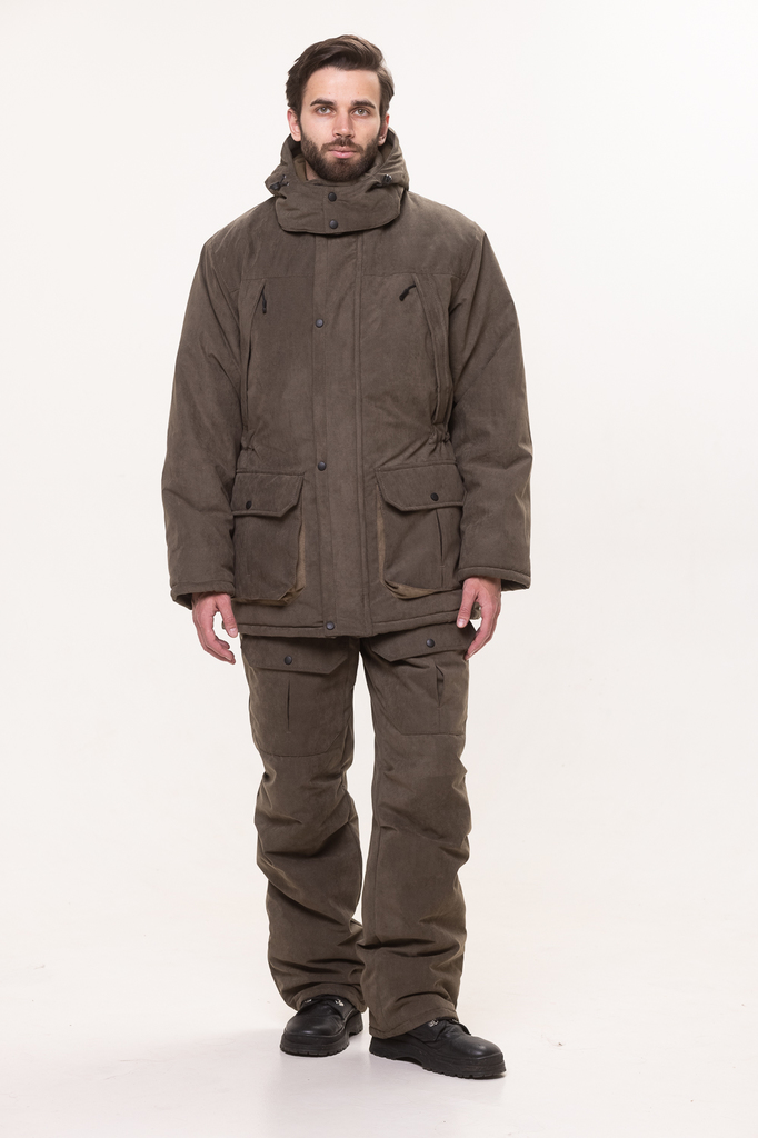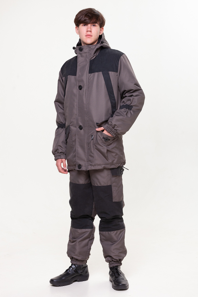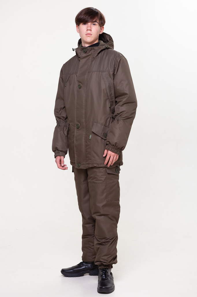 Костюм предназначен для охоты, рыбалки, прогулок на природе в осенне - весенний период года ГОСТ 25295-2003 Куртка удлинённая, прямого силуэта с воротником - стойкой, переходящей в капюшон, с централь... Показать описаниеной бортовой застёжкой на молнию, с ветрозащитным клапаном, застёгивающимся на кнопки. Полочки с отрезными кокетками. На полочках обработаны два нижних прорезных кармана в листочку и два верхних прорезных кармана в рамку, застёгивающихся на молнию и закрывающиеся листочками. Спинка цельнокроёная, с внутренней кулисой по линии талии стягивающейся шнуром с фиксатором. Рукава втачные цельнокроёные, по низу собранные на резинку. На куртке по низу проложен шнур для регулировки объёма. Капюшон втачной, по лицевому вырезу стягивается шнуром, закреплённым фиксаторами. Брюки с гульфом на молнии, на притачном поясе со шлёвками, собранном на резинку. На передних половинках обработаны два боковых кармана, застёгивающиеся на молнии. На передних половинках заложены мягкие складки. Полочка, спинка, капюшон – термостёжка флис Рукава, брюки – термостёжка тафетта