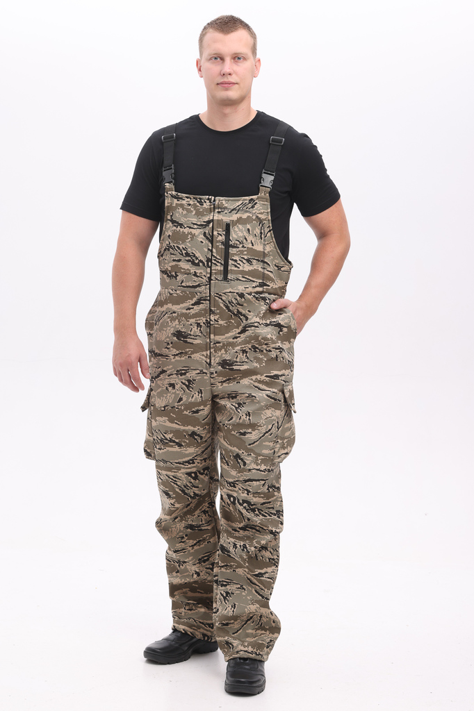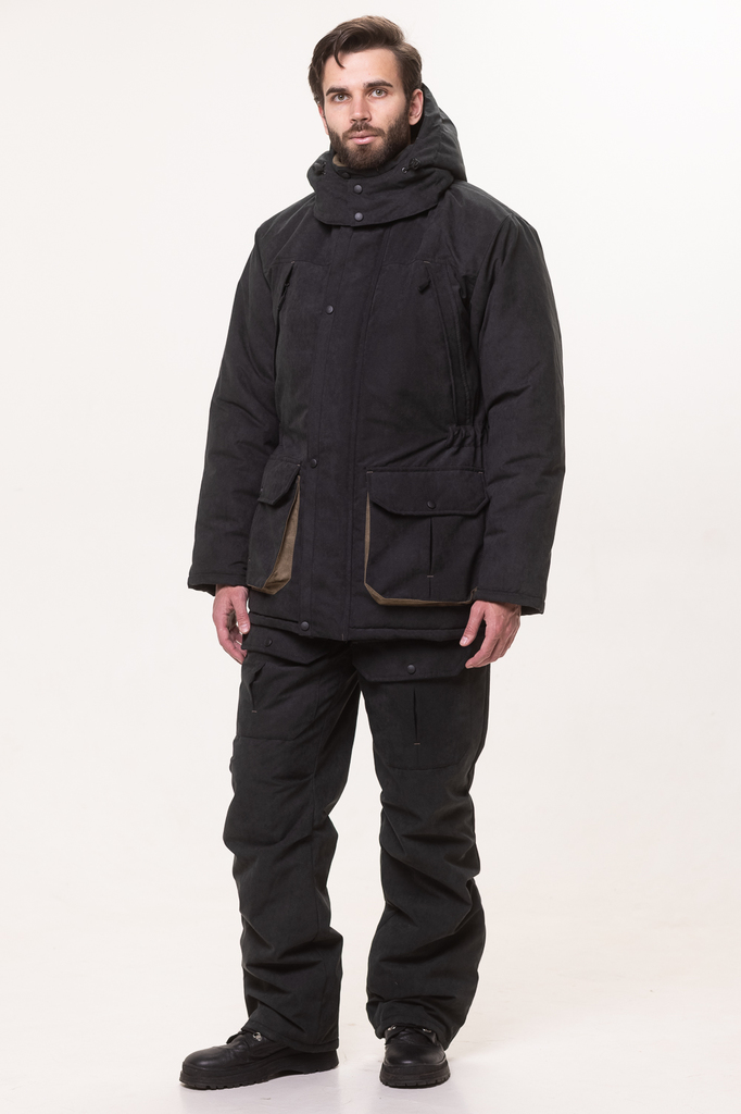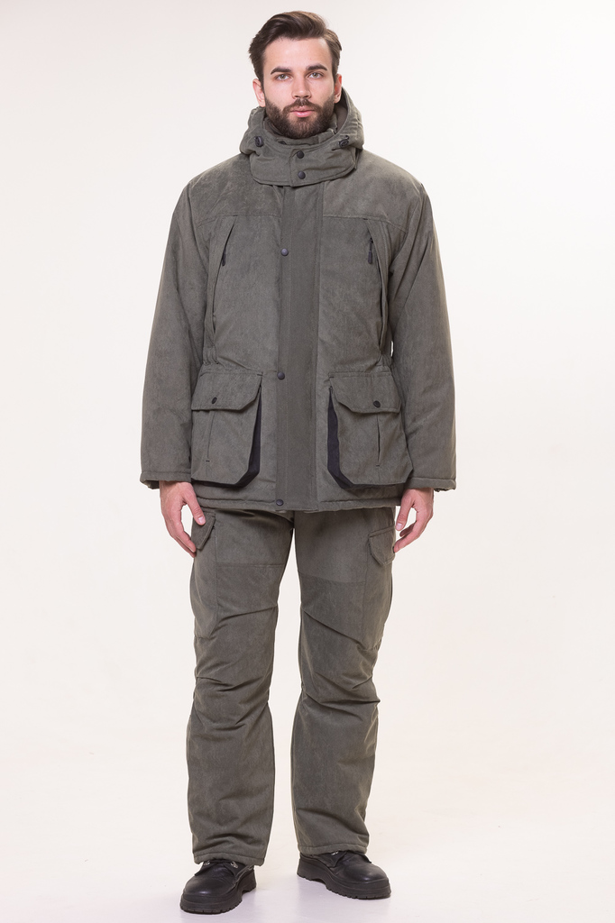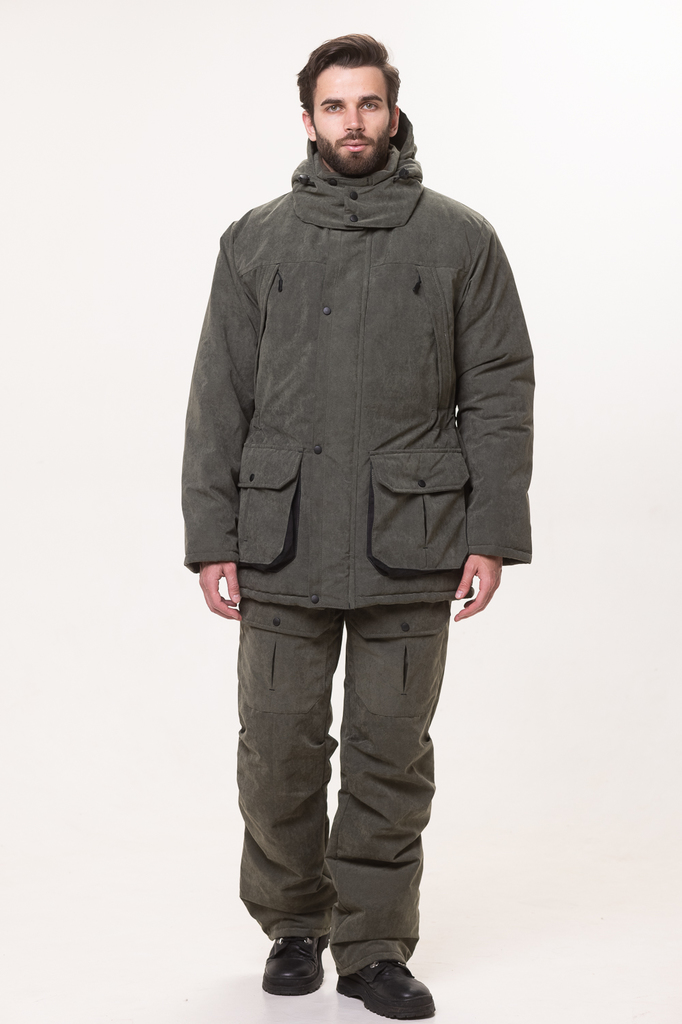 Костюм предназначен для охоты, рыбалки, активного отдыха ГОСТ 25295-2003 Куртка прямого силуэта, с воротником стойкой, с центральной бортовой застёжкой на молнию, с ветрозащитным клапаном, застёгивающ... Показать описаниеимся на текстильную тесьму " контакт". Куртка со съёмным утеплённым капюшоном, стягивающийся шнуром по лицевому вырезу, с кулисой по линии талии. Полочки с отрезными кокетками. На полочках обработаны два нижних двойных и два верхних объёмных накладных кармана с клапанами, застёгивающимися на текстильную тесьму "контакт". На верхних и нижних клапанах расположены язычки. Спинка с отрезной кокеткой и отделочной деталью. Рукава втачные цельнокроёные, на подкладке с трикотажным напульсником. На рукава настрочены отделочные детали и карманы на молнии. На подкладке полочки обработаны накладные карманы из основной ткани, застёгивающиеся на текстильную тесьму "контакт". Детали из отделочной ткани: кокетки полочки и спинки, обтачка капюшона, клапаны верхних и нижних карманов, отделочные детали спинки и рукавов, карманы рукавов, обтачки накладных карманов. Полукомбинезон с отрезной нагрудной частью, центральной застёжкой на молнию. На передних половинках обработаны два объёмных накладных боковых кармана, в области колен настрочены наколенники с боковыми карманами на молнии для дополнительных поролоновых наколенников. На нагрудной части расположены прорезные карманы в рамку. Задняя часть полукомбинезона в области талии собрана на эластичную тесьму. На задней верхней части полукомбинезона расположены бретели, собранные на эластичную тесьму. Детали из отделочной ткани: бретели, держатели замков, обтачки карманов.