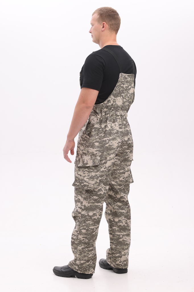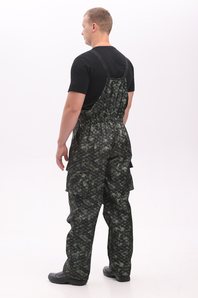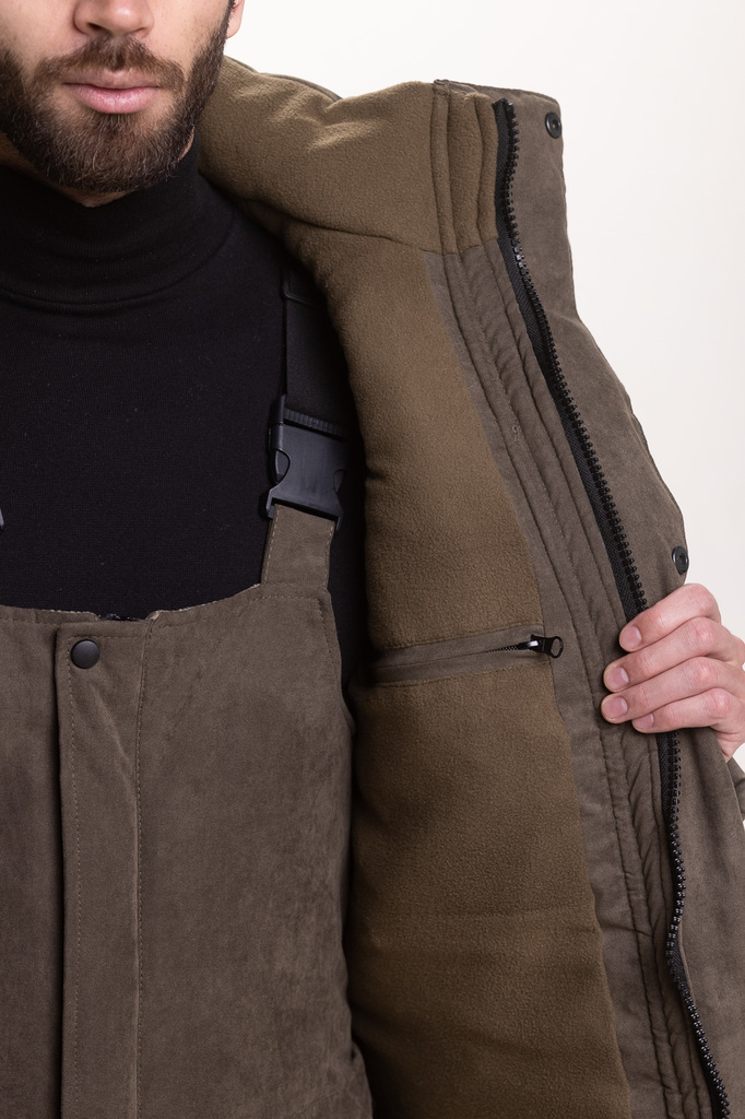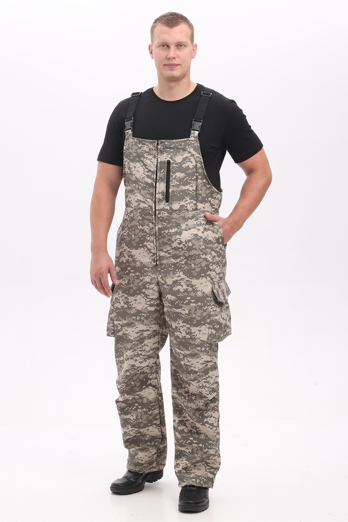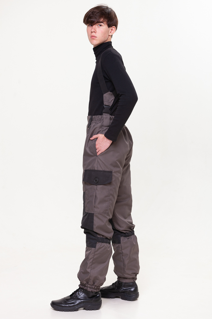 Костюм предназначен для охоты, рыбалки, активного отдыха ГОСТ 25295-2003 Куртка прямого силуэта, с воротником стойкой, с центральной бортовой застёжкой на молнию, с ветрозащитным клапаном, застёгивающ... Показать описаниеимся на текстильную тесьму " контакт". Куртка со съёмным утеплённым капюшоном, стягивающийся шнуром по лицевому вырезу, с кулисой по линии талии. Полочки с отрезными кокетками. На полочках обработаны два нижних двойных и два верхних объёмных накладных кармана с клапанами, застёгивающимися на текстильную тесьму "контакт". На верхних и нижних клапанах расположены язычки. Спинка с отрезной кокеткой и отделочной деталью. Рукава втачные цельнокроёные, на подкладке с трикотажным напульсником. На рукава настрочены отделочные детали и карманы на молнии. На подкладке полочки обработаны накладные карманы из основной ткани, застёгивающиеся на текстильную тесьму "контакт". Детали из отделочной ткани: кокетки полочки и спинки, обтачка капюшона, клапаны верхних и нижних карманов, отделочные детали спинки и рукавов, карманы рукавов, обтачки накладных карманов. Полукомбинезон с отрезной нагрудной частью, центральной застёжкой на молнию. На передних половинках обработаны два объёмных накладных боковых кармана, в области колен настрочены наколенники с боковыми карманами на молнии для дополнительных поролоновых наколенников. На нагрудной части расположены прорезные карманы в рамку. Задняя часть полукомбинезона в области талии собрана на эластичную тесьму. На задней верхней части полукомбинезона расположены бретели, собранные на эластичную тесьму. Детали из отделочной ткани: бретели, держатели замков, обтачки карманов.
