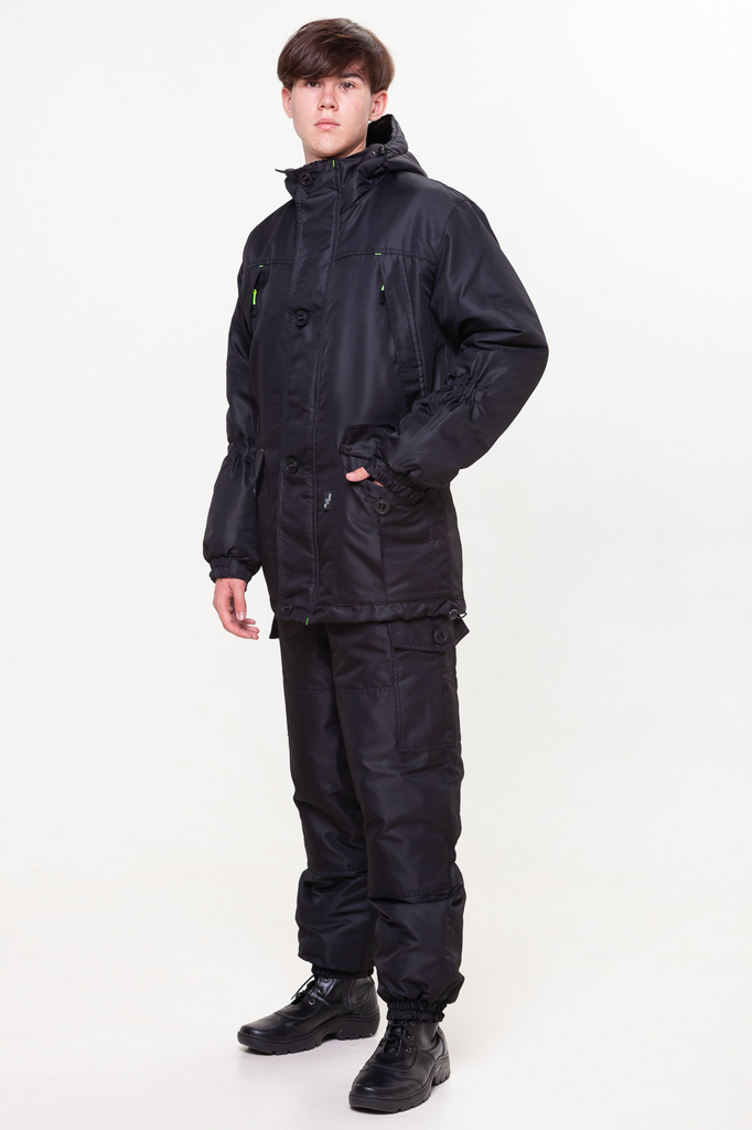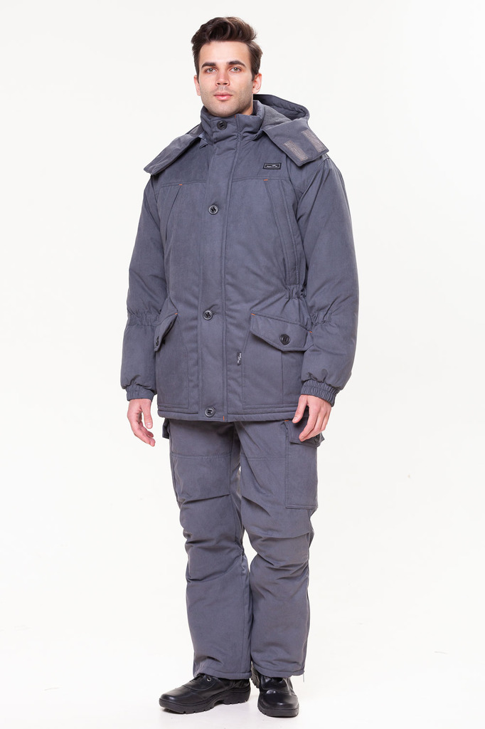 Удобный и комфортный демисезонный костюм. ГОСТ 25295-2003 Куртка удлинённая, с воротником - стойкой,переходящей в капюшон, с центральной бортовой застёжкой на молнию, с ветрозащитным клапаном, застёги... Показать описаниевающимся на кнопки. Полочки с отрезными кокетками. На полочках обработаны два нижних прорезных кармана в листочку с клапанами и два верхних прорезных кармана в рамку, застёгивающихся на молнию. Спинка цельнокроёная. Рукава втачные цельнокроёные, с манжетами, притаченными по низу,собранные на резинку. Куртка прямого силуэта,по линии талии собрана на кулису,по низу проложен шнур для регулировки объёма Капюшон втачной, по лицевому вырезу стягивается шнуром,закреплённым фиксаторами. Брюки с гульфом на молнии, на притачном поясе со шлёвками, собранном на резинку.На передних половинках обработаны два боковых кармана,в области боковых швов настрочены два объёмных накладных кармана - портфеля с клапанами,застёгивающимися на кнопки.Низ брюк на манжетах,собранных на резинки. Для регулировки объёма задние половинки в области колена стянуты резинкой.