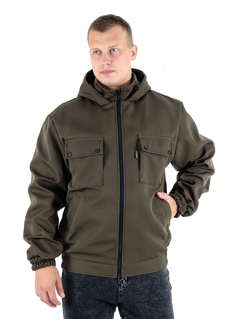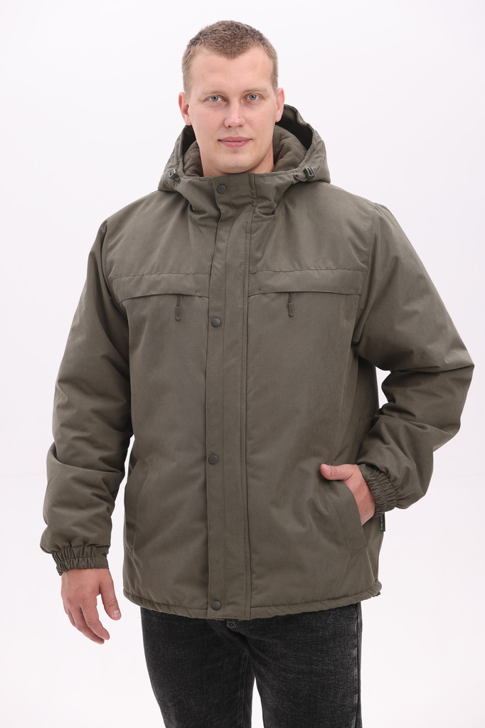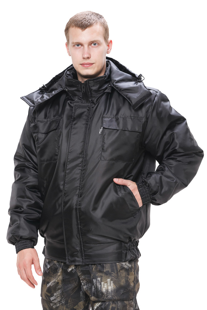 Влагозащитная куртка "ОСЕНЬ" на синтепоне ГОСТ 25295-2003 Куртка укороченная, с воротником - стойкой, с центральной бортовой застёжкой на молнию (тракторная 8/1),утепленным капюшоном ,стягивающимся шн... Показать описаниеуром по лицевому вырезу. На полочках обаботаны два нижних прорезных кармана с листочкой и два верхних накладных кармана - книжки с клапанами, застёгивающимися на тесьму "контакт". Спинка цельнокроёная. Рукава втачные из двух частей, с манжетами, притаченными по низу, собранные на эластичную тесьму – резинку . Куртка на притачном поясе, собранном на две эластичные ленты - резинки. На полочках подкладки, настрочены накладные карманы из основной ткани. Плотность ткани оксфорд 105гр/кв.м