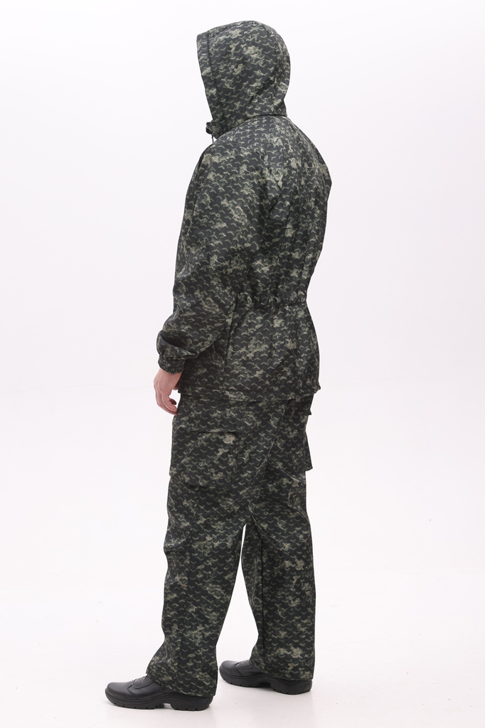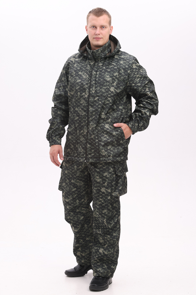 Костюм предназначен для охоты, рыбалки, прогулок на природе в осенне - весенний период года ГОСТ 25295-2003 Куртка удлинённая, с воротником - стойкой,переходящей в капюшон, с центральной бортовой заст... Показать описаниеёжкой на молнию, с ветрозащитным клапаном, застёгивающимся на кнопки. Полочки с отрезными кокетками. На полочках обработаны два нижних прорезных кармана в листочку и два верхних прорезных кармана в рамку, застёгивающихся на молнию и закрывающиеся листочками. Спинка цельнокроёная. Рукава втачные цельнокроёные, по низу собранные на резинку. Куртка прямого силуэта,по линии талии собрана на кулису,по низу проложен шнур для регулировки объёма. Капюшон втачной, по лицевому вырезу стягивается шнуром,закреплённым фиксаторами. Брюки с гульфом на молнии, на притачном поясе со шлёвками, собранном на резинку.На передних половинках обработаны два боковых кармана,застёгивающиеся на молнии.На передних половинках заложены мягкие складки. Костюм предназначен для охоты,рыбалки и активного отдыха в осенне-весенний период года.