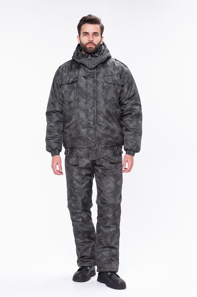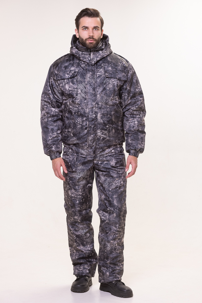 Удобный костюм для охоты, рыбалки и активного отдыха в зимний период года ГОСТ 25295-2003 Используемые ткани: - ткань верха :исландия - ткань подкладка : флис 180гр(полочка, спинка ,верхняя часть задн... Показать описаниеей половинки брюк) - ткань подкладка : тафетта пл.210(рукава ,передняя и задняя половинки брюк) - утепляющий материал: куртка синтепон - 300г/м2, п/к синтепон - 200г/м2 Куртка прямого силуэта ,с центральной бортовой застёжкой на молнию, ветрозащитным клапаном, застёгивающимся на петлю и пуговицу "Канада" , съёмным капюшоном - по лицевому вырезу стягивается шнуром. На полочках обработаны два нижних объёмных накладных кармана с клапанами , застёгивающиеся на петлю и пуговицу и два верхних прорезных кармана в рамку, застёгивающихся на молнии и закрытые листочкой. Рукава цельнокроёные с кулисой и манжетой, собранной на резинку. По линии талии в области бокового шва настрочены кулисы, собранные на резинки. Спинка и полочки с отрезными кокетками. На полочке подкладки обработан внутренний прорезной карман в рамку, застёгивающийся на молнию. Брюки свободного покроя с гульфом, застёгивающимся на молнию ,петлю и пуговицы. На передних половинках обработаны два кармана в боковых швах, застёгивающиеся на молнии и два боковых накладных кармана ,с клапанами, застёгивающиеся на петлю и пуговицу. Брюки с высоким поясом, по боковым швам собранным на резинки ,шлёвками под широкий ремень и съёмной утеплённой спинкой с регулирующимися бретелями. На уровне сгиба колен задние половинки брюк регулирутся по объёму резинкой. Размерный ряд : 44-46р по 64-66р