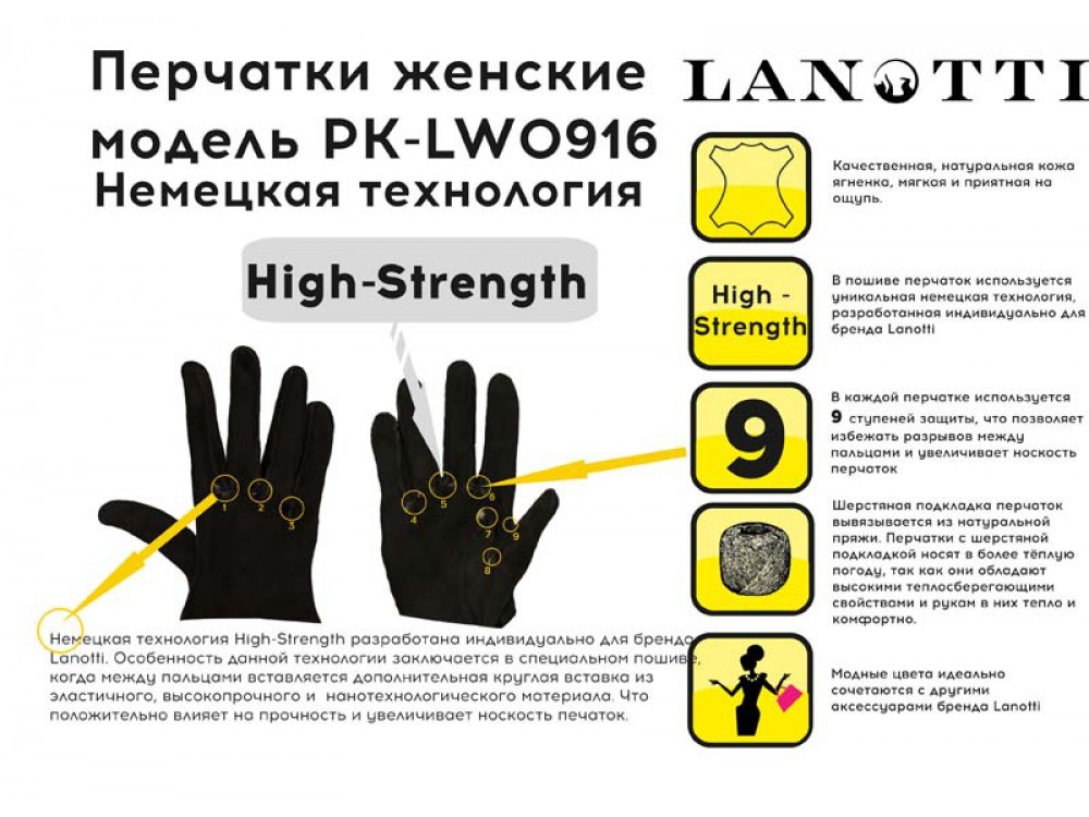 РАСПРОДАЖА! Размер: 6.5, 7, 7.5, 8 Состав: натуральная кожа Подклад: шерсть Описание: Мягкая кожа молодого ягненка, приятная на ощупь. Немецкая Технология Hight-Stregth , разработана индивидуаль... Показать описаниено для бренда Lanotti.Особенность данной технологии заключается в специальном пошиве, когда между пальцамим вставляется дополнительная вставка из эластичного и нанотехнологичного материала, что положительно влияет на прочность и увеличивает носкость перчаток.