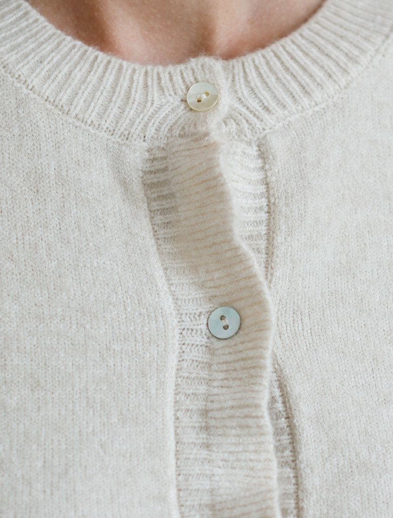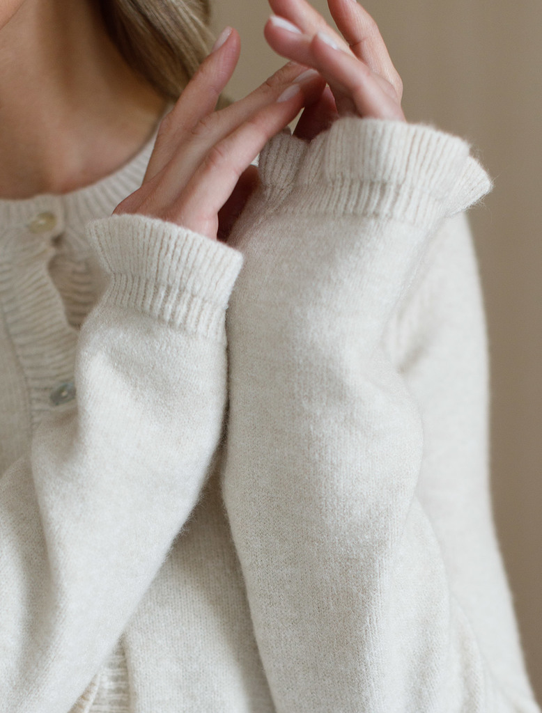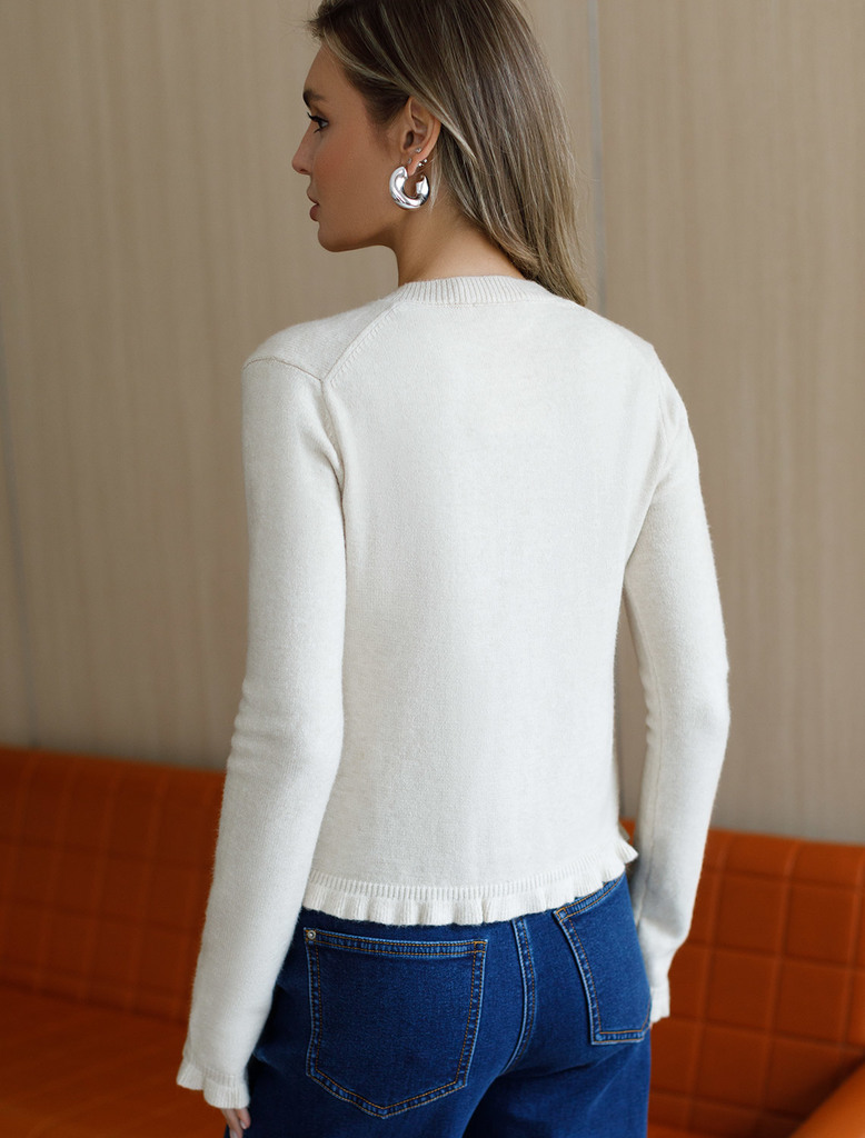 Состав: 52%ПАН (акрил) 33%ПЭ 8%ПУ 7%Кашемир Плотность: 9 GG Размер товара на первом фото: 42 Кардиган выполнен из мягкой меланжевой пряжи с Романтичности прямому силуэту добавляют мягкие воланы по лин... Показать описаниеии пуговиц, на манжетах и краю изделия. Застежка на пуговицы из натурального перламутра. Изделие очень приятное к телу, совершенно не колется и отлично сохраняет тепло. Сочетается в костюме с брюками D38.013, D38.012 и юбкой D36.016