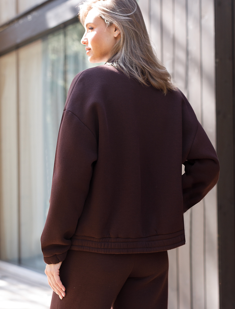 Состав: 80%Хлопок 20%ПЭ Плотность: 320 Г/м2 Размер товара на первом фото: 42 Теплый бомбер коричневого цвета на молнии из футера трехнитки с начесом создан для максимального комфорта в любую погоду. Б... Показать описаниелагодаря натуральному материалу и внутреннему мягкому начесу, повседневный бомбер приятно прилегает к телу и сохраняет тепло даже в прохладные дни. Серебристая фурнитура придает современный акцент, а воротник-стойка защищает от ветра и дополняет стильный внешний вид. Манжеты на рукавах и резинка по низу обеспечивают хорошую посадку по фигуре, предотвращая проникновение холода. Карманы позволяют удобно разместить необходимые мелочи или согреть руки во время прогулок. Спортивный бомбер отличается прочностью ткани, не теряет форму после стирки и долго сохраняет аккуратный первоначальный внешний вид. Модель отличается спущенной линией плеча, что обеспечивает удобную посадку и подчеркивает естественные контуры тела. Свободная толстовка на молнии подходит для любых размеров, отлично смотрится на большие параметры, подчеркивая достоинства фигуры.Комфортная длина делает образ более элегантным и универсальным — такой вариант легко комбинируется как с повседневной классической одеждой, так и со спортивными брюками D44.149 и D44.151. Подходит как для прогулок по городу, так и для активного отдыха, универсальный фасон этой кофты делает ее незаменимой в гардеробе любой женщины вне зависимости от сезона или трендов моды.