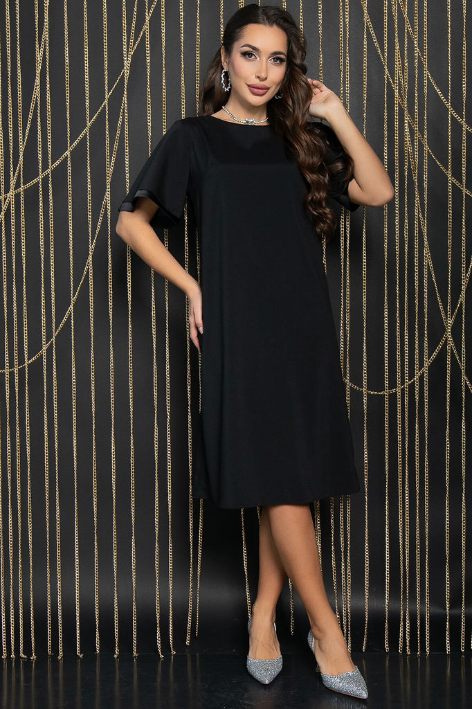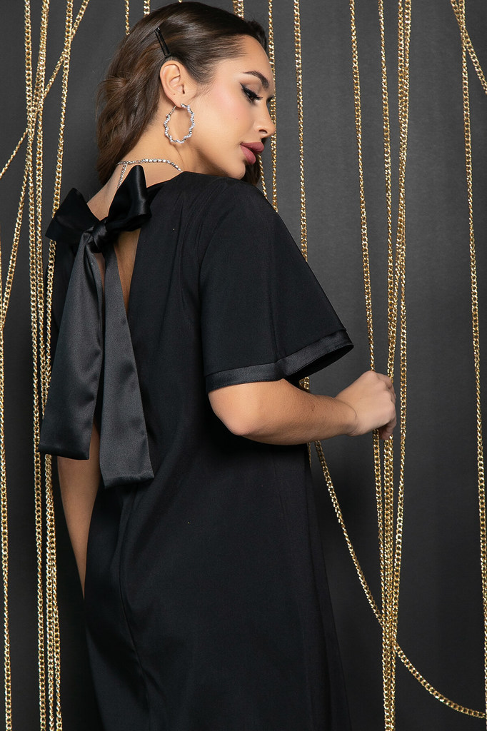 Артикул: П11840. Тип ткани: синтетическая. Состав: 100% полиэстер. Материал: плательная "Русский сатин". Цвет: чёрный. Принт: отсутствует. Длина: миди. Вид застежки: потайная молния. Си... Показать описаниелуэт: трапеция. Карманы: отсутствуют. Подкладка: отсутствует. Декоративные элементы: атласный бант сзади. Длина по спинке от верхней точки плеча: 44/ 105 см, 46/ 106 см, 48/ 107 см, 50/ 108 см, 52/ 109 см. Размер изделия на модели: 44 Рост модели: 167 см. Платье-трапеция — это универсальный предмет гардероба, который идеально сочетает в себе элегантность и удобство. Оно прекрасно подходит для вечерних мероприятий. Платье имеет V-образный вырез сзади, который завязывается на бант, создавая привлекательный и загадочный образ. Его дизайн дополнен расклешенными рукавами с легкими воланами, напоминающими крылья, что придает платью нежность и воздушность. Уход за изделием: ручная стирка до 30 градусов; нельзя отбеливать; отжим запрещён; гладить при t не более 110 С; гладить с изнанки. Внимание! Рекомендуем ориентироваться на размерную сетку и выбирать свой привычный размер, согласно размерной таблице. *Допуск отклонения длины при массовом производстве 1-3 см является нормой.