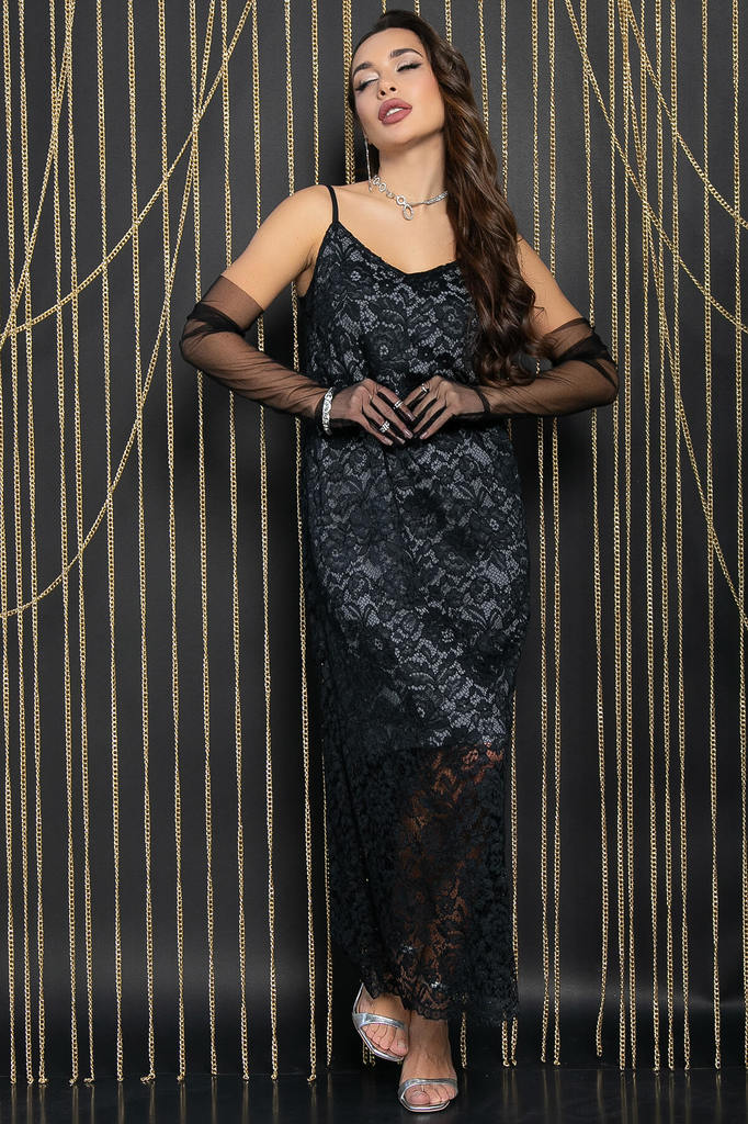 Артикул: П11871. Тип ткани: синтетическая. Состав: верх - 100% полиэстер, подклад - 100% вискоза. Материал: верх- кружево, подклад - штапель. Цвет: чёрный. Принт: цветы. Длина: миди. Ви... Показать описаниед застежки: без застёжки. Силуэт: полуприлегающий. Карманы: отсутствуют. Подкладка: есть. Декоративные элементы: отсутствуют. Длина изделия по спинке: 44/ 109 см, 46/ 110 см, 48/ 111 см, 50/ 112 см, 52/ 113 см. Размер изделия на модели: 44 Рост модели: 167 см. Платье-комбинация из кружева с открытыми плечами и регулируемыми лямками станет вашим любимым нарядом для любого мероприятия. Вы сможете создать неповторимый образ, дополнив его стильными аксессуарами и обувью, и подчеркнуть свою индивидуальность. Подкладка выполнена в сером цвете. Уход за изделием: ручная стирка до 30 градусов; нельзя отбеливать; отжим запрещён; гладить при t не более 110 С; гладить с изнанки. Внимание! Рекомендуем ориентироваться на размерную сетку и выбирать свой привычный размер, согласно размерной таблице. *Допуск отклонения длины при массовом производстве 1-3 см является нормой.