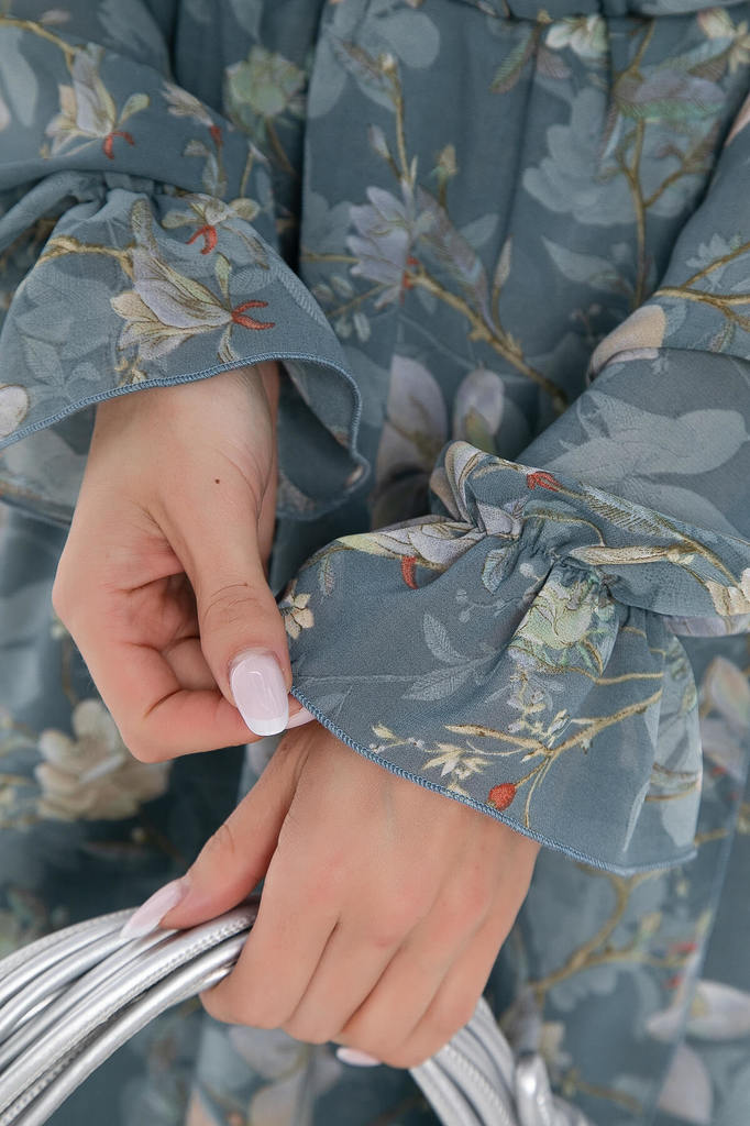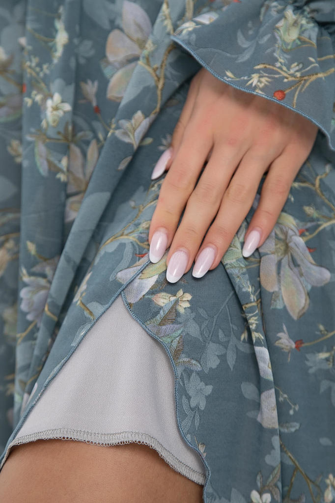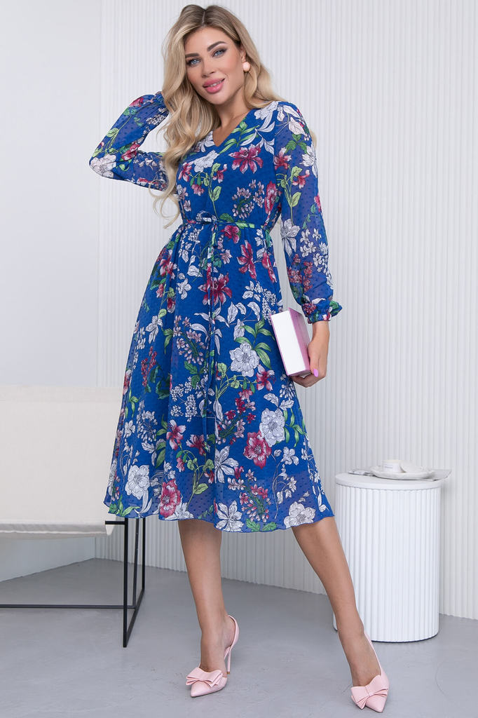 Артикул: П6797. Ткань: шифон, подкладка. Состав: 100% п/э. Цвет: синий. Принт: флористический. Вид застежки: без застежки. Силуэт: А-силуэт. Карманы: отсутствуют. Тип горловины: мягкий ... Показать описаниеV-образный. Длина изделия по спинке: 46/ 110 см, 48/ 111 см, 50/ 113 см, 52/ 113 см, 54/ 114 см, 56/ 115 см. Рост модели: 168 см. Шифоновое летящее платье идеально подчёркивающее Вашу женственность. Платье свободного силуэта на подкладке. Мягкий V-образный вырез горловины красиво открывает зону декольте и Ваши ключицы. Рукав длинный, втачной. Пояс из основной ткани входит в комплект. Уход за изделием: бережная стирка до 30 градусов; нельзя отбеливать; деликатный отжим; гладить при t не более 110 С; гладить с изнанки. *Допуск отклонения длины при массовом производстве 1-3 см является нормой.