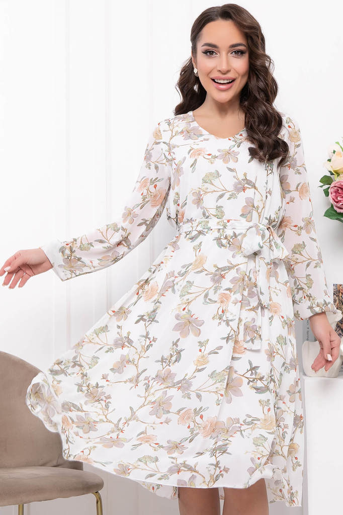 Артикул: П5779. Ткань: шифон, подкладка. Состав: 100% п/э. Цвет: белый. Принт: флористический. Вид застежки: без застежки. Силуэт: А-силуэт. Карманы: отсутствуют. Тип горловины: мягкий ... Показать описаниеV-образный. Длина изделия по спинке: 46/ 113 см, 48/ 113 см, 50/ 114, 52/ 115 см, 54/ 116 см. Рост модели: 167 см. Шифоновое летящее платье идеально подчёркивающее Вашу женственность. Платье свободного силуэта на подкладке. Мягкий V-образный вырез горловины красиво открывает зону декольте и Ваши ключицы. Длинный, втачной рукав, низ на резинке. Пояс из основной ткани входит в комплект. Уход за изделием: бережная стирка до 30 градусов; нельзя отбеливать; деликатный отжим; гладить при t не более 110 С; гладить с изнанки. *Допуск отклонения длины при массовом производстве 1-3 см является нормой.