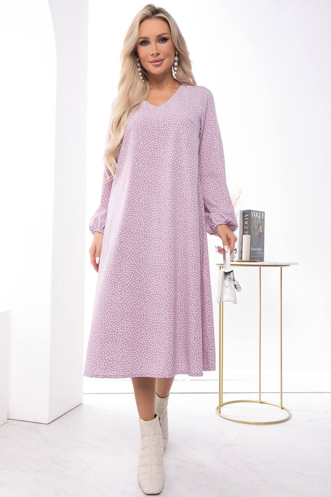 Артикул: П7175. Ткань: плательная "Ниагара". Состав: 100% п/э. Цвет: лиловый. Принт: горох. Вид застежки: пуговица по спинке. Силуэт: прямой. Карманы: отсутствуют. Тип горловины: V-обра... Показать описаниезный. Длина изделия по спинке: 42-44/ 111 см, 46-48/ 112 см, 50-52/ 113 см, 54/ 114 см. Рост модели: 168 см. Летящее платье идеально подчёркивающее Вашу женственность. Платье свободного силуэта подойдет как для для повседневных прогулок, так и для торжественных мероприятияй. Мягкий V-образный вырез горловины красиво открывает зону декольте и Ваши ключицы. Длинный рукав, по низу на резинке. Пояс из основной ткани входит в комплект. Уход за изделием: ручная стирка до 30 градусов; нельзя отбеливать; деликатный отжим; гладить при t не более 110 С; гладить с изнанки. *Допуск отклонения длины при массовом производстве 1-3 см является нормой.