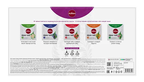 Подарочный набор с разными вкусами чая. Красивый и нужный подарок на все времена. Разные по характеру купажи вкусов в индивидуальных пакетиках саше позволят оценить аромат напитка. Он поднимет тонус и... Показать описание согреет зимним вечером. А еще, такой подарок доставит множество приятных минут, потому что ароматный и вкусный иван-чай настраивает на душевные разговоры и взаимопонимание. Дарите иван-чай близким, друзьям и коллегам. В наборе 40 пакетиков. Иван-чай "Иммунитет" - 10 пакетиков. Купаж ферментированного иван-чая с черной смородиной способствует восстановлению сил и укреплению иммунитета. Иван-чай "Антистресс" - 10 пакетиков. Благородный иван-чай с ромашкой и мятой служит прекрасным помощником для борьбы со стрессом и его спутниками. Иван-чай "Красота" - 10 пакетиков Иван-чай с малиной и клубникой дарит великолепный вкус, тонус коже и ускоряет процесс похудения. Иван-чай "Медовый спас" - 5 пакетиков Крепкий иван-чай, собранный в период цветения медоносов, способствует тонизации организма и придает ощущение бодрости. Иван-чай "Утренняя роса" - 5 пакетиков Легкий иван-чай ферментированный в росе. Освежает и отлично утоляет жажду.