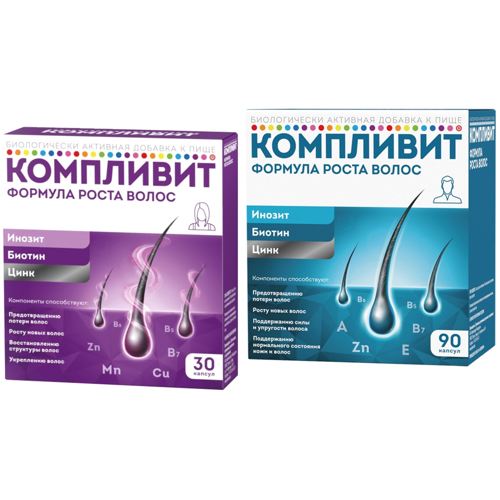 БАД «Компливит® для женщин 45 плюс» представляет собой комплекс витаминов, минералов, биологически активных веществ и экстрактов лекарственных растений пустырника и цимицифуги. Компоненты комплекса во... Показать описаниестребованы для восполнения дефицита витаминов и минералов, а также поддержки организма в период возрастной гормональной перестройки (перименопауза). Внешний вид: Таблетки двояковыпуклые продолговатой формы, покрытые пленочной оболочкой фиолетового цвета. Описание активных компонентов: Витамины и минеральные вещества являются незаменимыми участниками процессов обмена веществ и энергии в клетках, выступая в роли кофакторов многочисленных биохимических реакций. Дефицит их потребления в ряде случаев может приводить к нарушениям гормонального баланса, что обусловлено участием микронутриентов в процессах синтеза и разрушения гормонов на различных уровнях эндокринной регуляции. Важное значение витаминов и минералов для женщины в перименопаузальный период обусловлено как их прямыми эффектами на нейрогуморальную регуляцию, так и опосредованными эффектами на обмен веществ и энергии, состояние иммунной системы и др. Действие комплекса обусловлено свойствами входящих в его состав компонентов. Комплекс содержит 10 витаминов, 2 минерала, биологически активные вещества L-карнитин и рутин, экстракты лекарственных растений пустырника и цимицифуги. Комбинация витаминов, минералов и биологически активных веществ, входящих в состав БАД «Компливит® для женщин 45 плюс», обеспечивает следующие эффекты (по литературным данным): • антиоксидантный (защита клеток от повреждающего воздействия свободных радикалов, что, по некоторым представлениям, способствует замедлению процессов старения); • ангиопротекторный (укрепляет стенки капилляров, регулируя их проницаемость); • стимулирует защитные свойства организма; • оказывает благотворное влияние на сердечно-сосудистую и нервную систему; • поддерживает регуляцию липидного обмена (мобилизуют жир из жирового депо). БАД «Компливит® для женщин 45 плюс» также содержит экстракты лекарственных растений пустырника и цимицифуги. Научные исследования показали, что: Экстракт пустырника: • способствует нормализации деятельности ЦНС, оказывает мягкое успокаивающее действие; • положительно влияет на сердечно-сосудистую систему: проявляет гипотензивные свойства, способствует нормализации частоты сердечных сокращений. Экстракт корней цимицифуги: • оказывает мягкое успокаивающее и гипотензивное действие; • проявляет антиоксидантную активность; • помогает уменьшать дискомфортные проявления климакса: приливы, потливость, изменения настроения, нарушения сна. Эффект комплекса определяется входящими в его состав компонентами (по данным литературных источников). Витамин А (ретинола ацетат) участвует в процессах синтеза, роста и поддержания жизнедеятельности кожи и слизистых оболочек. Витамин А важен для зрения в качестве составной части зрительного пигмента родопсина и для процессов развития скелета. Необходим для поддержания иммунитета, обладает антиоксидантными свойствами. Витамин Е (?-Токоферола ацетат) обладает антиоксидантными свойствами, поддерживает стабильность эритроцитов, предупреждает гемолиз; оказывает положительное влияние на функции половых же