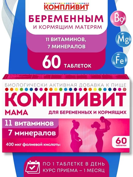 КОМПЛИВИТ МАМА ДЛЯ БЕРЕМЕННЫХ И КОРМЯЩИХ - Биологически активная добавка (БАД) к пище - Современный специализированный комплекс витаминов, микро- и макроэлементов во время беременности на любом сроке ... Показать описаниеи в период грудного вскармливания. Содержание в одной таблетке: Витамин А 0,6 мг РЭ Витамин Е 15,0 мг ТЭ Витамин В1 2,0 мг Витамин В2 2,0 мг Витамин В6 5,0 мг Витамина С 100 мг Никотинамид (вит. В3) 20 мг Фолиевая кислота 0,4 мг Кальция пантотенат (витамин В5) 10,0 мг Витамин В12 3,0 мкг Эргокальциферол (витамин D) 13,0 мкг (520 МЕ) Железо 14,0 мг Марганец 2,5 мг Медь 2,0 мг Цинк 10,0 мг Магний 60,0 мг Кальций 25,0 мг Фосфор 19,0 мг Пищевая ценность 1 таблетки: Белки - 0 г, Жиры - 0 г; Углеводы - 0,1 г; Энергетическая ценность -0,4 ккал/2 кДж. По данным литературных источников: Во время беременности возрастает суточная потребность организма в витаминах и минеральных веществах на 30-50%, дефицит витаминов и микроэлементов на этапе планирования и во время беременности может быть фактором риска ее осложненного течения, причиной нарушения закладки тканей и органов плода, формирования пороков внутриутробного развития. Так, например, фолиевая кислота при планировании беременности является одним из самых важных витаминов, при ее дефиците в организме матери существенно повышается риск развития дефектов нервной трубки. Комплекс содержит 11 витаминов, 7 минералов, данный комплекс создан с учетом потребностей женщин в витаминах и минералах во время беременности, в период кормления грудью. Совместимость компонентов, входящих в состав БАД «Компливит® «Мама» для беременных и кормящих», обеспечена специальной технологией. Прием витаминов и минералов в период грудного вскармливания способствует обогащению грудного молока полезными микронутриентами и помогает поддерживать здоровье мамы и малыша АКТИВНЫЕ ИНГРЕДИЕНТЫ: Действие комплекса обусловлено эффектами входящих в его состав компонентов: α-Токоферола ацетат (витамин Е) обладает антиоксидантными свойствами, поддерживает стабильность эритроцитов, предупреждает гемолиз; оказывает положительное влияние на функции половых желез, нервной и мышечной ткани. Способствует нормальным сперматогенезу, развитию плода и течению беременности. Ретинол (витамин А) играет важную роль в окислительно-восстановительных процессах, участвует в синтезе мукополисахаридов, белков, липидов. Способствует нормальному развитию эмбриональных тканей, в т.ч. эпителиальных структур и костной ткани. Участвует в формировании зрительных пигментов, необходимых для нормального сумеречного и цветового зрения; обеспечивает целостность эпителиальных тканей, регулирует рост костей. Тиамин (витамин В1) - в качестве коэнзима участвует в углеводном обмене, функционировании нервной системы. Рибофлавин (витамин В2) - важнейший катализатор процессов клеточного дыхания и зрительного восприятия. Пиридоксин (витамин В6) - в качестве коэнзима принимает участие в белковом обмене и синтезе нейромедиаторов. Цианокобаламин (витамин В12) - участвует в синтезе нуклеотидов, является важным фактором нормального роста, кроветворения и развития эпителиальных клеток; необходим для метаболизма фолиевой кислоты и синтеза миелина. Никотинамид (витамин РР) - участвует в процессах тканевого дыхания, жирового и углеводного обмена. Аскорбиновая кислота (витамин С) - необходи