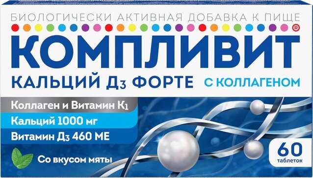 Компливит® Кальций Д3 форте с коллагеном - это биологически активная добавка к пище, активность которой определяется свойствами входящих в состав компонентов (согласно научным данным): Содержание в су... Показать описаниеточной дозировке (2 таблетки) витамин Д3 11,5 мкг (460 МЕ) кальций 1000 мг витамин K1 60 мкг Активные компоненты: Кальций - минерал, содержащийся в организме человека в большем количестве, чем другие ионы. В среднем, в теле человека содержится около 1 кг кальция, примерно 99% находится в скелете. Кальцию присущ ряд важнейших функций в организме: • Формирование костной ткани, дентина и эмали зубов; • Участие в процессах сократимости мышц, нервной и нервно-мышечной проводимости; • Обеспечение оптимальных условий свертывания крови; • Регуляция проницаемости стенок сосудов; • Поддержание кислотно-щелочного баланса организма; • Активация ряда ферментов и функции некоторых эндокринных желез. Кальций важен для стабильной сердечной деятельности, выработки ряда гормонов, метаболизма адипоцитов (клеток жировой ткани), способствует более эффективной потере жировой ткани при похудании/соблюдении диеты, для лучшего контроля веса. Адекватное потребление кальция особенно важно в периоды роста, беременности и грудного вскармливания. Витамин Д3 (колекальциферол) относится к группе жирорастворимых витаминов. Способствует всасыванию кальция в кишечнике и поддерживает необходимые уровни кальция и фосфатов в крови для обеспечения минерализации костной ткани. Он также необходим для роста костей и процесса костной перестройки. Достаточный уровень витамина Д предотвращает развитие рахита у детей и нарушений минерализации костной ткани у взрослых. Применение кальция и витамина Д3 препятствует увеличению выработки паратиреоидного гормона (ПТГ), который является стимулятором повышенной костной резорбции (вымывания кальция из костей). Вместе с кальцием витамин Д применяется для снижения риска развития и в составе комплексного лечения остеопороза. Функции витамина Д не ограничены только контролем кальций-фосфорного обмена, он также влияет и на другие физиологические процессы в организме, участвует в модуляции функций иммунной системы, важен для поддержания репродуктивного здоровья, участвует в поддержании нормальной работы сердечно-сосудистой системы, метаболизме жиров, глюкозы и инсулина, а также регулирует развитие и функционирование структур нервной системы. Низкий уровень витамина Д может предшествовать возрастным когнитивным нарушениям и нейродегенеративным заболеваниям. Витамин К1 (филлохинон) является жирорастворимым витамином, играющим важную роль в обменных процессах мышц и соединительной ткани. Витамин К является кофактором витамин К-зависимой карбоксилазы - фермента, играющего важнейшую роль в процессе минерализации костной ткани, а также системе свертывания крови. Он активирует специальный белок (остеокальцин), отвечающий за накопление кальция в костной ткани и, соответственно, за повышение плотности костной ткани. В результате исследований было показано, что применение витамина К способствует предотвращению остеопении и остеопороза, снижению риска переломов. Витамин К увеличивает положительный эффект кальция и витамина Д на минеральную плотность костей. Более того, благоприятно действует на серде