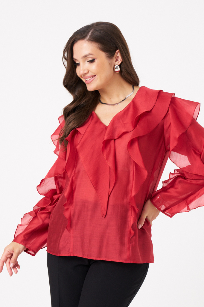 Описание Женская блузка выполнена из легкой и воздушной вискозной ткани что придает ей приятную мягкость и комфорт в носке. Её терракотовый цвет делает его подходящим для повседневных ситуаций. Дизайн... Показать описание переда и спинки украшен двумя вертикальными рельефами, которые создают стройный силуэт и визуально удлиняют линию туловища. Внутри рельефов вставлены изящные воланы, добавляющие образу нотки романтики и женственности. Горловина V-образная обработана воланами, что придает мягкую изысканность и привлекательность. Длинные втачные рукава украшены воланами по линии проймы и вдоль рукава, создавая легкий объем и динамику движения. Такая отделка подчеркивает воздушность модели и делает ее особенно привлекательной. Эта блузка терракотового оттенка идеально подойдет для повседневных образов — она сочетает комфорт, стиль и женственность, позволяя выглядеть элегантно в любой ситуации. Параметры Рост: 164 44 Блузка: Длина изделия - 65см, Длина рукава - 60см, Ширина плеча - 12.6см, Ширина по груди - 51.5см, Ширина по низу - 55.5см, Ширина рукава - 18.9см; 46 Блузка: Длина изделия - 65см, Длина рукава - 60см, Ширина плеча - 12.8см, Ширина по груди - 53.5см, Ширина по низу - 57.5см, Ширина рукава - 19.7см; 48 Блузка: Длина изделия - 66см, Длина рукава - 60см, Ширина плеча - 13см, Ширина по груди - 55.5см, Ширина по низу - 59.5см, Ширина рукава - 20.5см; 50 Блузка: Длина изделия - 66см, Длина рукава - 60см, Ширина плеча - 13.2см, Ширина по груди - 57.5см, Ширина по низу - 61.5см, Ширина рукава - 21.3см; 52 Блузка: Длина изделия - 66см, Длина рукава - 60см, Ширина плеча - 13.4см, Ширина по груди - 59.5см, Ширина по низу - 63.5см, Ширина рукава - 22.1см; Состав и уход Состав: Вискоза/viscose 87%; полиэстер/polyester 13%. Уход: * Стирка при температуре воды до 30°C * Не отбеливать * Гладить при температуре утюга до 110°C * Вертикальная сушка * Барабанная сушка запрещена * Профессиональная сухая чистка в тетрахлорэтилене и во всех растворителях, внесенных в список для символа F.