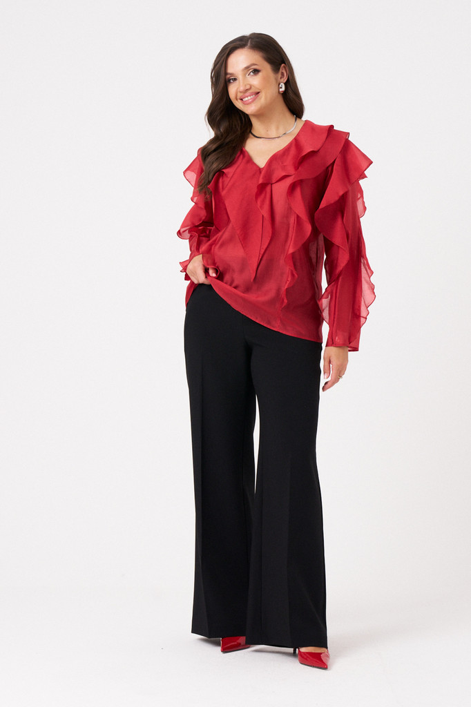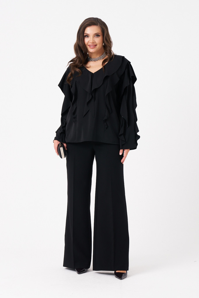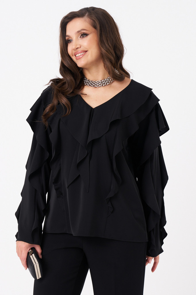 Описание Женская блузка выполнена из легкой и воздушной вискозной ткани что придает ей приятную мягкость и комфорт в носке. Её классический чёрный цвет делает универсальным, подходящим для повседневны... Показать описаниех ситуаций. Дизайн переда и спинки украшен двумя вертикальными рельефами, которые создают стройный силуэт и визуально удлиняют линию туловища. Внутри рельефов вставлены изящные воланы, добавляющие образу нотки романтики и женственности. Горловина V-образная обработана воланами, что придает мягкую изысканность и привлекательность. Длинные втачные рукава украшены воланами по линии проймы и вдоль рукава, создавая легкий объем и динамику движения. Такая отделка подчеркивает воздушность модели и делает ее особенно привлекательной. Эта блузка чёрного оттенка идеально подойдет для повседневных образов — она сочетает комфорт, стиль и женственность, позволяя выглядеть элегантно в любой ситуации. Параметры Рост: 164 44 Блузка: Длина изделия - 65см, Длина рукава - 60см, Ширина плеча - 12.6см, Ширина по груди - 51.5см, Ширина по низу - 55.5см, Ширина рукава - 18.9см; 46 Блузка: Длина изделия - 65см, Длина рукава - 60см, Ширина плеча - 12.8см, Ширина по груди - 53.5см, Ширина по низу - 57.5см, Ширина рукава - 19.7см; 48 Блузка: Длина изделия - 66см, Длина рукава - 60см, Ширина плеча - 13см, Ширина по груди - 55.5см, Ширина по низу - 59.5см, Ширина рукава - 20.5см; 50 Блузка: Длина изделия - 66см, Длина рукава - 60см, Ширина плеча - 13.2см, Ширина по груди - 57.5см, Ширина по низу - 61.5см, Ширина рукава - 21.3см; 52 Блузка: Длина изделия - 66см, Длина рукава - 60см, Ширина плеча - 13.4см, Ширина по груди - 59.5см, Ширина по низу - 63.5см, Ширина рукава - 22.1см; Состав и уход Состав: Вискоза/viscose 87%; полиэстер/polyester 13%. Уход: * Стирка при температуре воды до 30°C * Не отбеливать * Гладить при температуре утюга до 110°C * Вертикальная сушка * Барабанная сушка запрещена * Профессиональная сухая чистка в тетрахлорэтилене и во всех растворителях, внесенных в список для символа F.