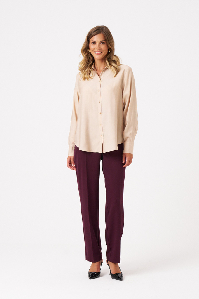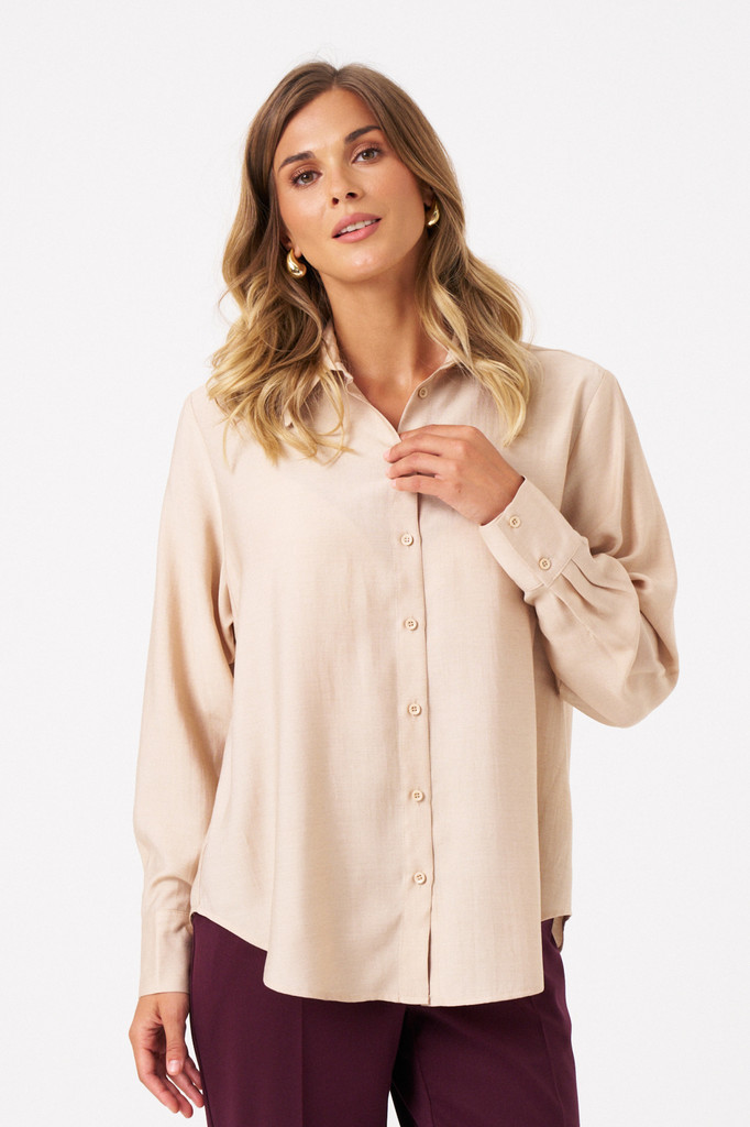 Описание Эта женская блузка выполнена из легкой и воздушной поливискозной ткани с добавлением шерсти, что обеспечивает приятную мягкость и комфорт при носке. Ее бежевый оттенок делает образ нежным и у... Показать описаниениверсальным, идеально подходящим для повседневных ситуаций. Застежка центральная бортовая на обметанные петли и пуговицы обеспечивает удобство и аккуратный внешний вид. Низ переда выполнен в полукруглой форме, а спинка украшена кокеткой и складками, что добавляет изящества. Низ спинки также полукруглый, а боковые швы оснащены разрезами для дополнительного комфорта и стиля. Горловина оформлена рубашечным воротником с отрезной стойкой, придавая образу классический вид. Длинные втачные рукава завершены притачными манжетами с застежками на обметанные петли и пуговицы, что позволяет регулировать их длину и создавать аккуратный силуэт. Эта блузка идеально подойдет для создания повседневных образов — она сочетает комфорт, стиль и женственность, позволяя выглядеть элегантно в любой ситуации. Параметры Рост: 164 Состав и уход Состав: Вискоза/viscose 80%; полиэстер/polyester 10%, шерсть/wool 10%. Уход: * Стирка при температуре воды до 30°C * Не отбеливать * Гладить при температуре утюга до 110°C * Вертикальная сушка * Барабанная сушка запрещена * Профессиональная сухая чистка в тетрахлорэтилене и во всех растворителях, внесенных в список для символа F.