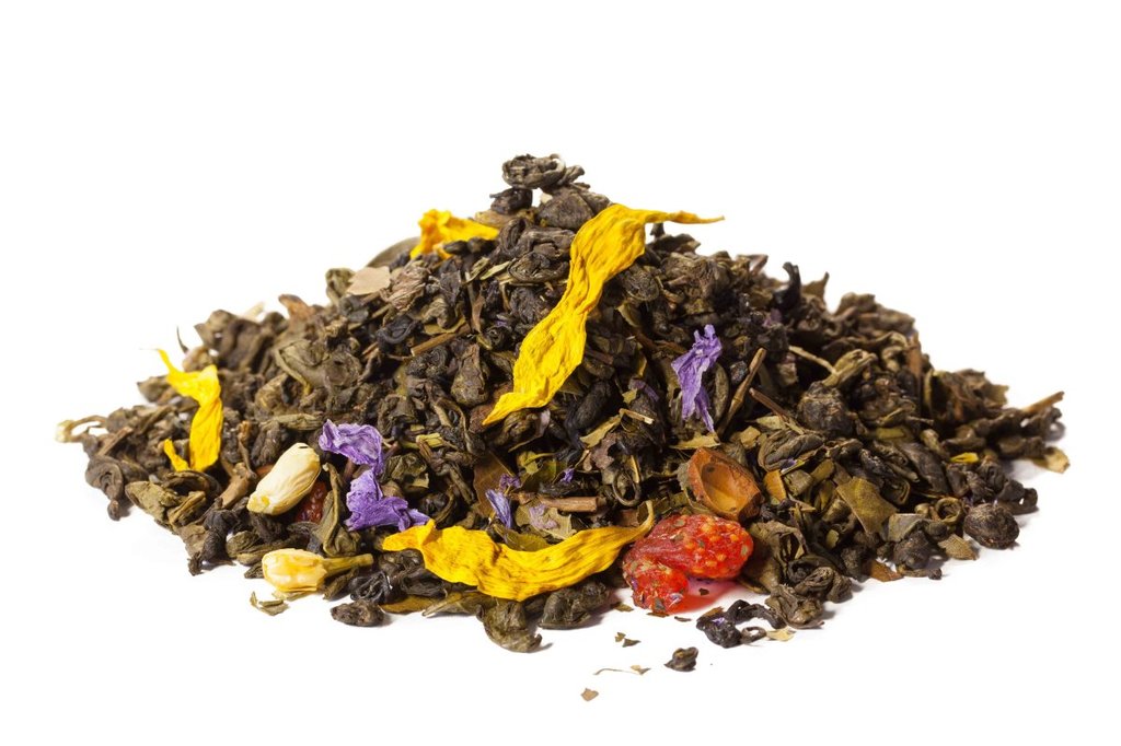 Китайский зелёный чай сенча с бутонами роз, яркими вкраплениями лепестков календулы, мальвы и нежным цветочным ароматом. Состав: зелёный чай, бутоны роз, лепестки календулы и мальвы, ароматизаторы.